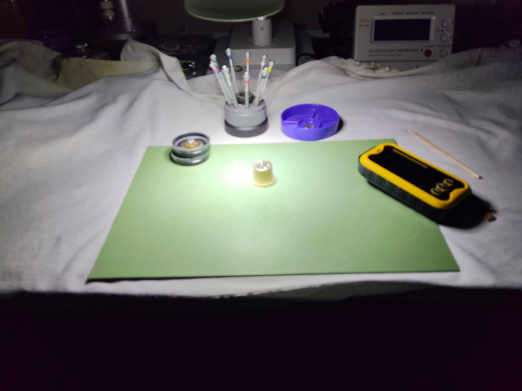 Ik weet van tevoren dat dit een radiumhorloge is, hoog of laag, het zal toch een service krijgen. De radiumdelen liggen in een doosje. Radium is schadelijk als je radiumstof inademt. Voor het effect zich uit, ben ik niet meer in leven. Niettemin hou ik er wel rekening mee en ga ik voorzichtig om met radium, dat spreekt voor zich. Als het een hele hoge straling heeft, dan zet ik even een masker op tot de onderdelen achter plastic liggen.