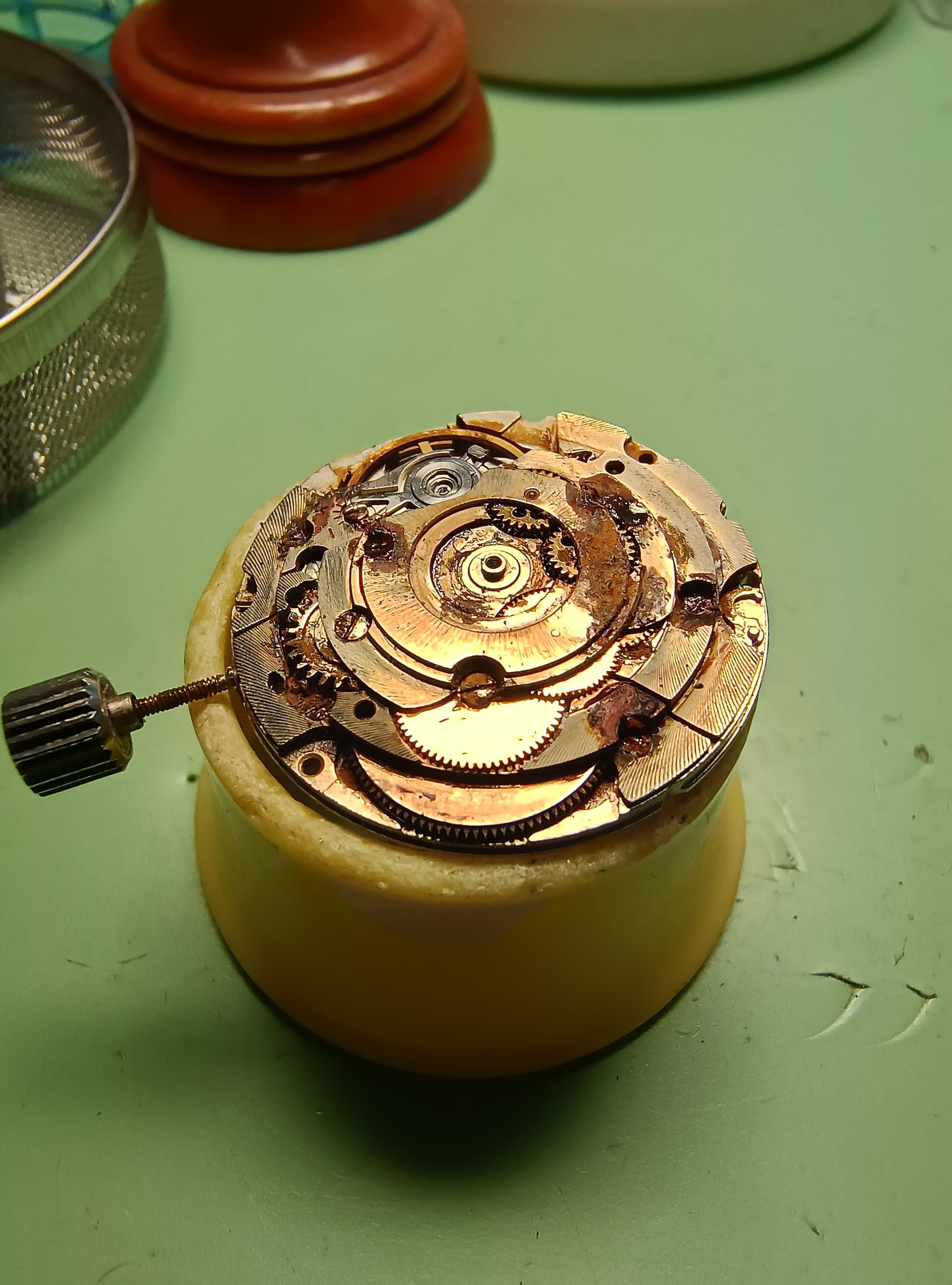 Hier een 1971 14K Certina van de vriend van mijn bovenbuuv. Foto’s binnenkort, glaasje en kast al gedaan waardoor het opeens een keurig horloge is. Ik vemoed een 25-66. Liep nog erg netjes afgezien van een matige (maar niet rampzalige) amplitude en een half minuutje per dag voor. Vervang normaliter altijd de opwindveer maar deze moet een beetje op een budget. ![]()
