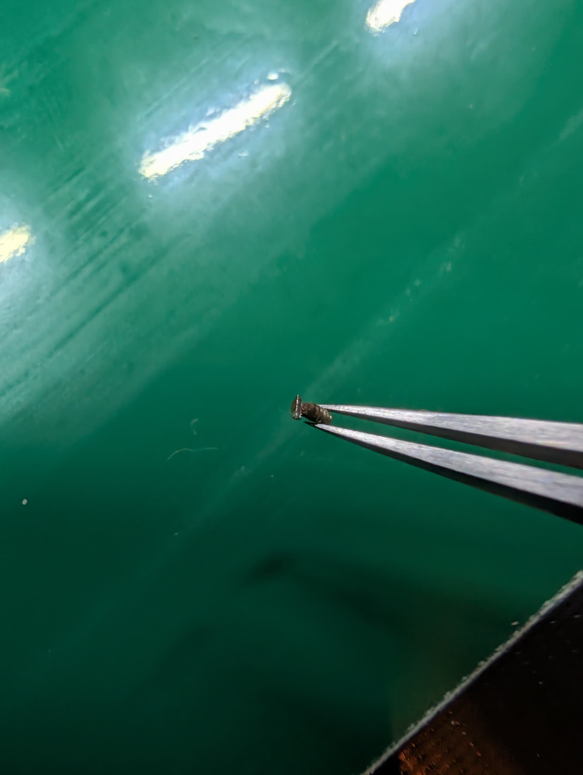 Ik zat te hannesen met dat veertje, verschillende posities geprobeerd en het wou maar niet werken, en ik pakte het op en vloog weg. Een tijd aan het zoeken geweest en teruggevonden. Inmiddels had ik al een nieuwe besteld, maar ik was blij dat ik het weer terug had gevonden, dus ik ga met volle moed verder en telkens zat er iets niet goed. Voor de zoveelste keer geprobeerd en weer vloog het voor de tweede keer uit de pincet en nergens meer te vinden. Dus misschien kom ik het nog een keer tegen, maar er is een nieuwe onderweg. Volgende keer onder een stuk plastic werken, dat veertje hoef je maar aan te raken en het spring weg.