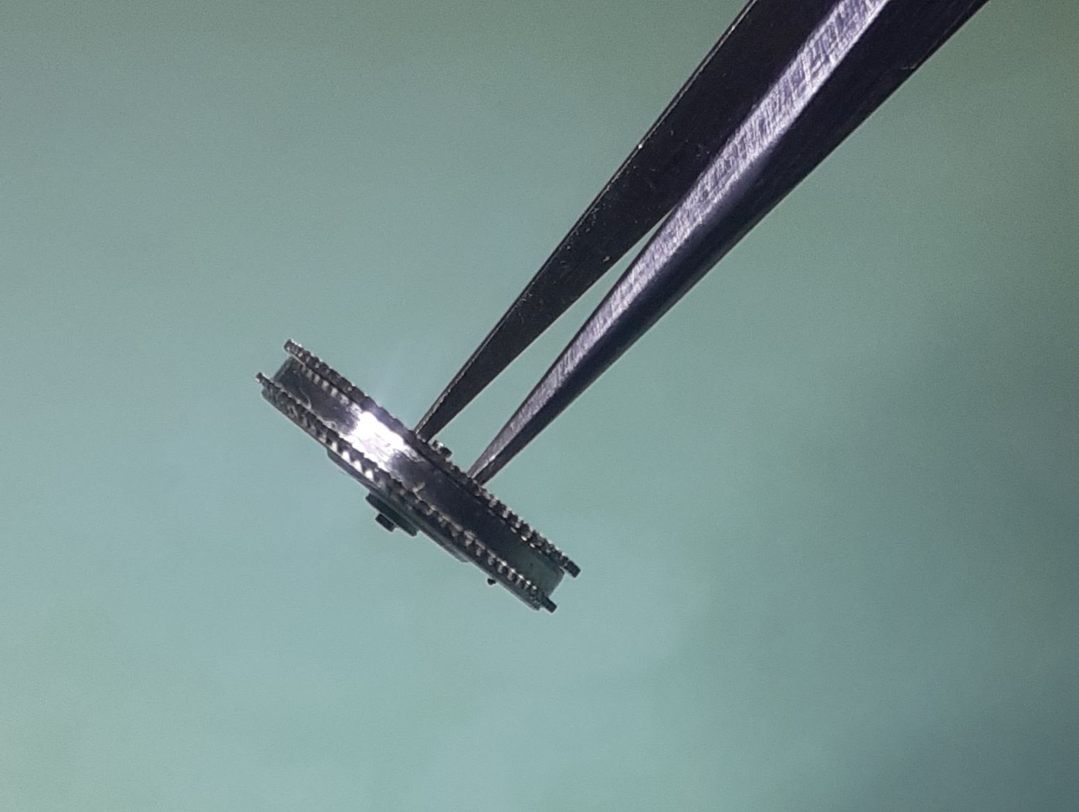 De deksel met een geïntegreerde arbor, hoe krijg ik die daarop? Na wat pielen en kijken stak ik mijn pincet in die twee gaatjes en draaide de arbor in de veer; was een fluitje van een cent. Ik vraag me af: is dat de juiste manier om het te doen? Zijn die gaatjes daarvoor gemaakt?