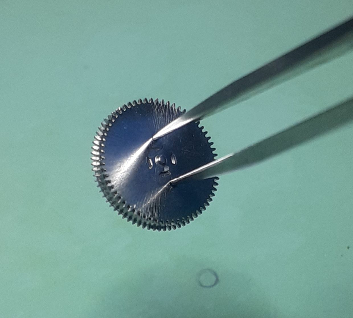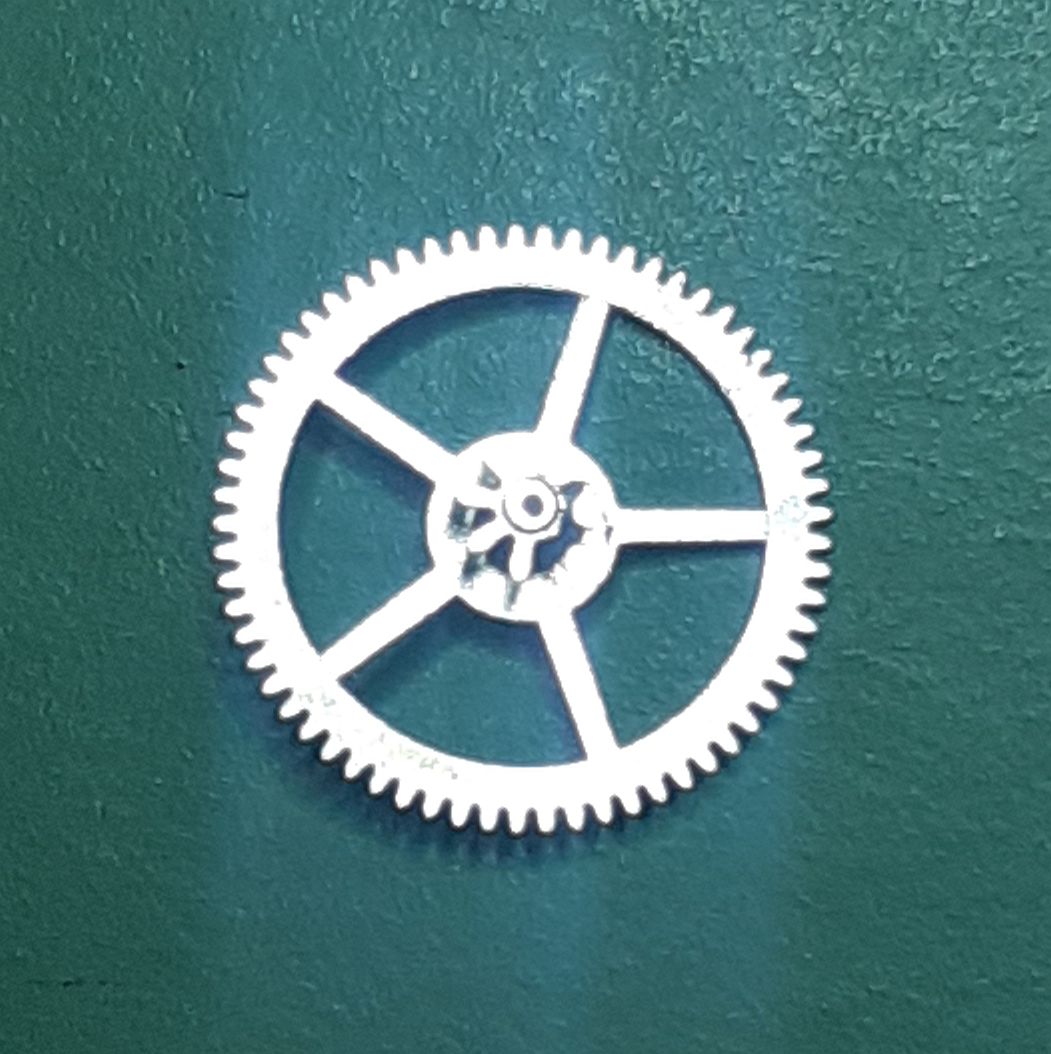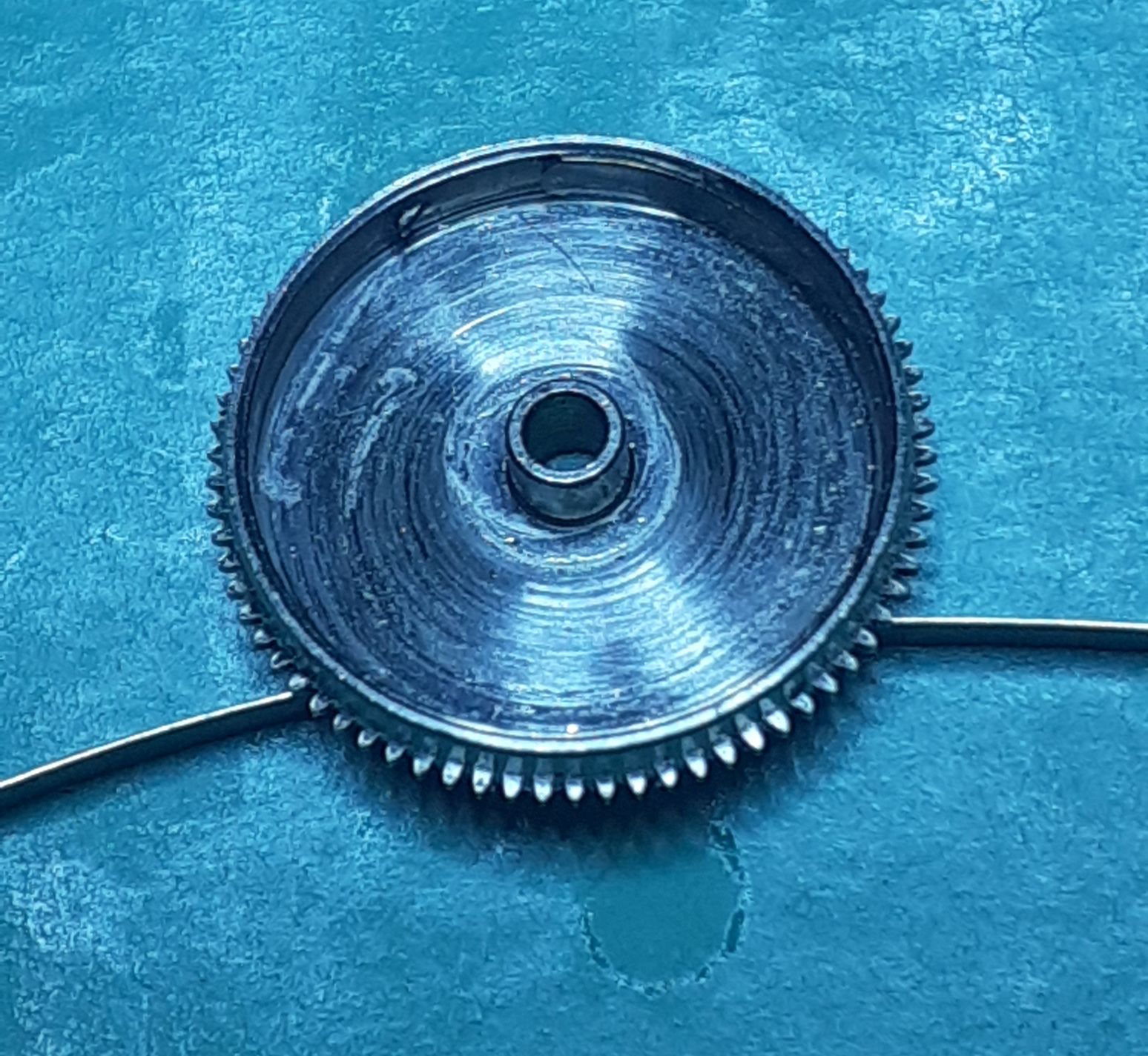 Waar die tandjes vanaf zijn gebroken, is het aandrijftandwiel voor het kroonwiel, nummer 1482