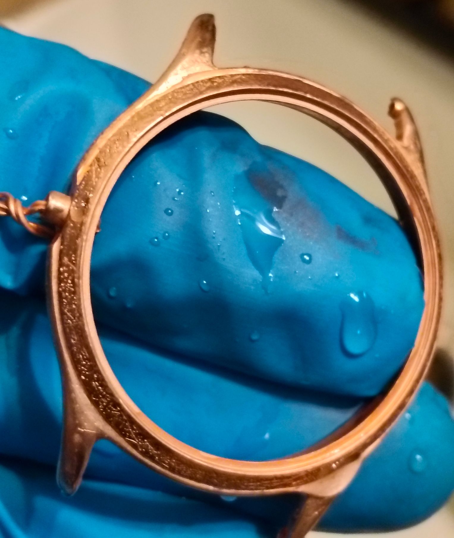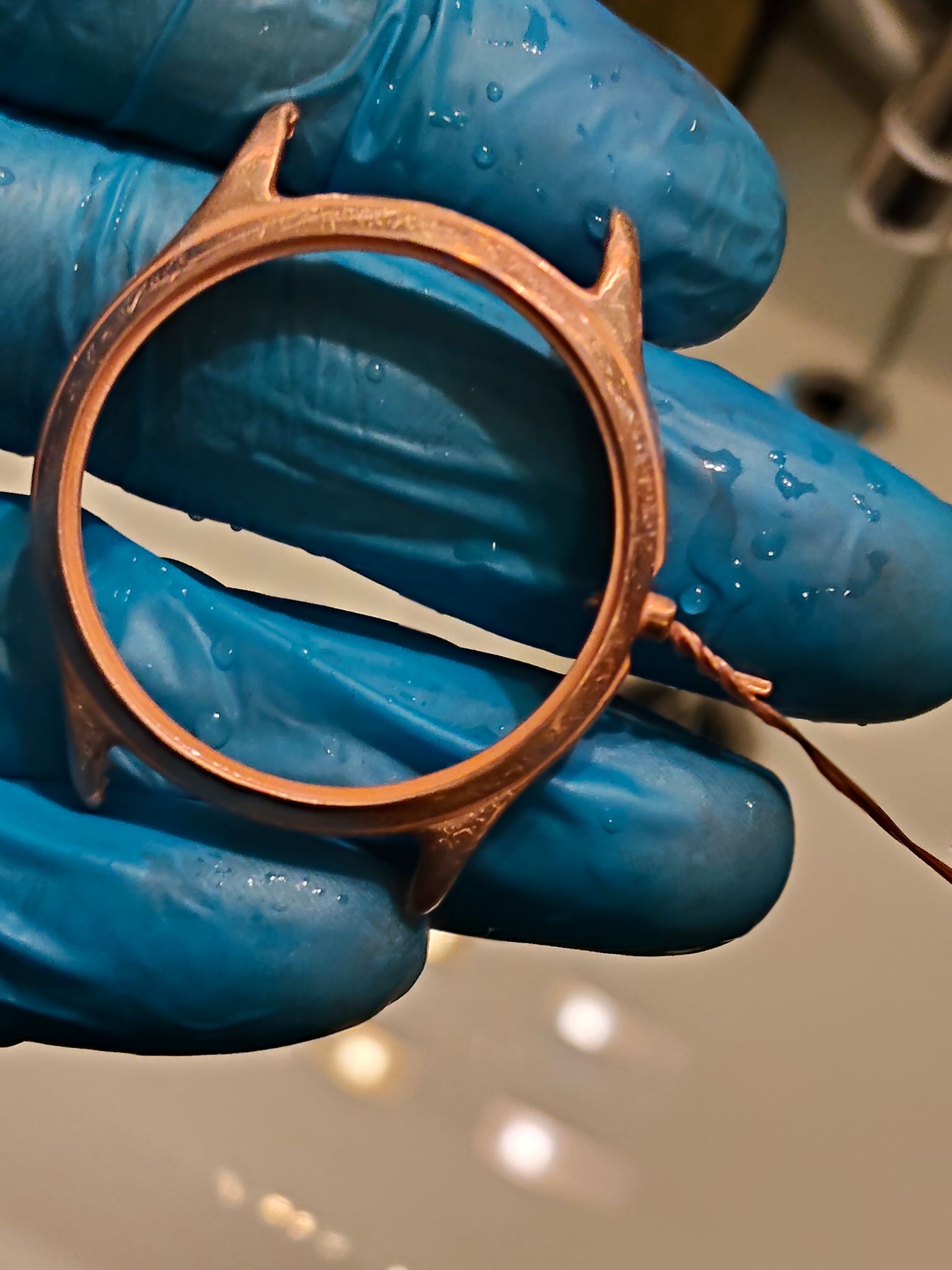 Ik denk dat het nog iets meer opgevuld kan worden, dus het hangt op dit moment in het koperbad, een koperelectrolyt die speciaal is ontwikkeld voor een snelle en dikkere opvulling van oneffenheden en krassen.