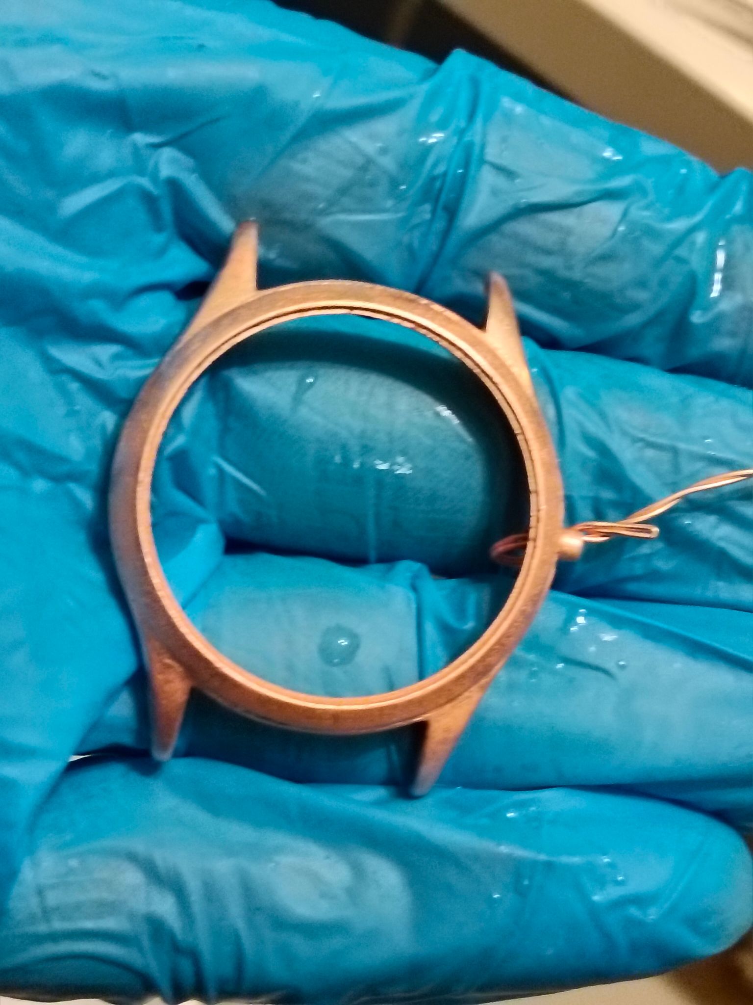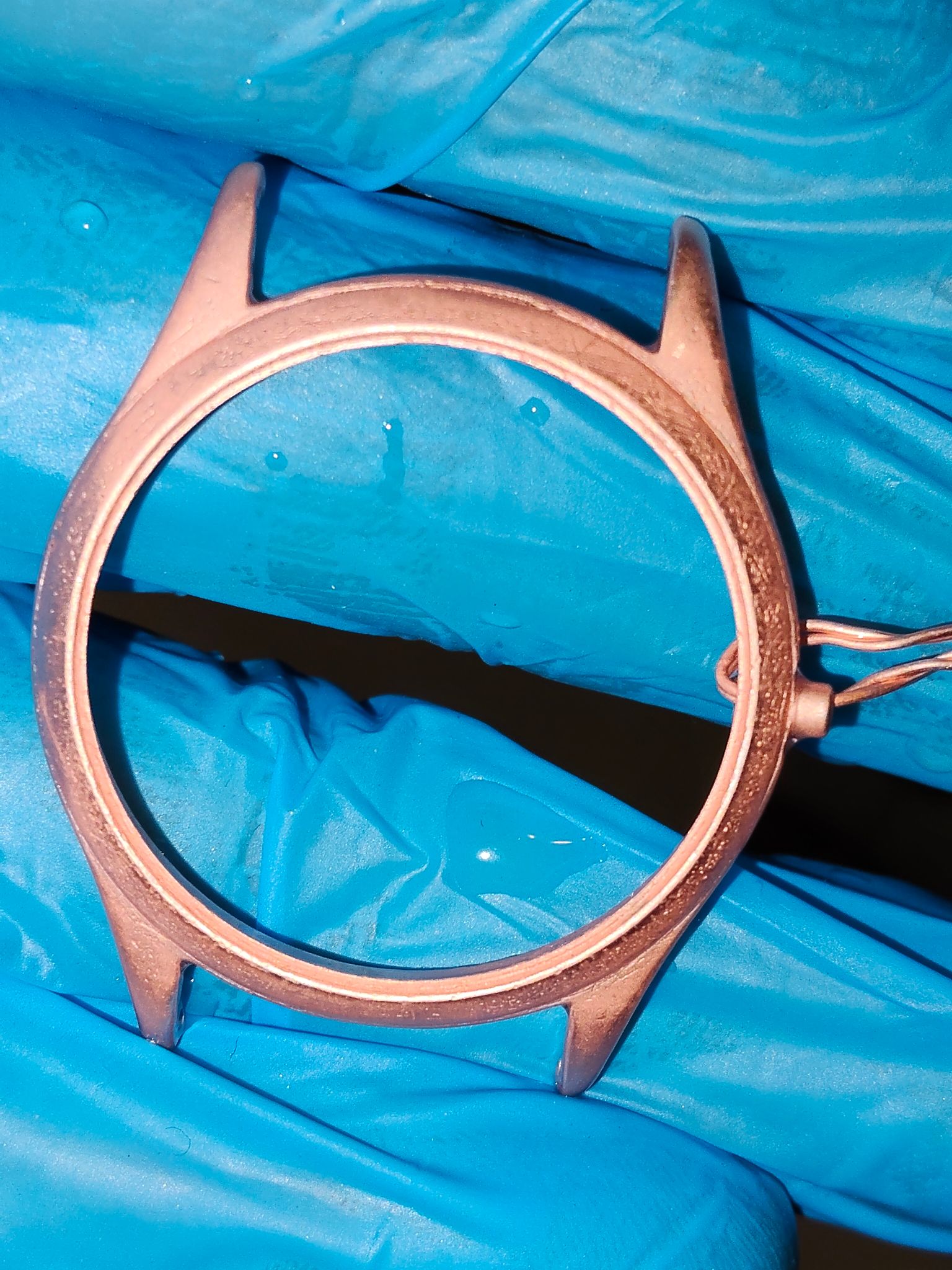 Ik heb het nu eerst in de ultrasoon gehad, daarna met de electropen en stripvloeistof de resten eraf gehaald, daarna over de polijstborstel om een glimmende ondergrond te hebben voor de eerste koperlaag, voorafgaand aan een koperflashlaag, deze heeft een korte dompeltijd en komt ten goede aan de hechting van de laag die daar weer bovenop komt.