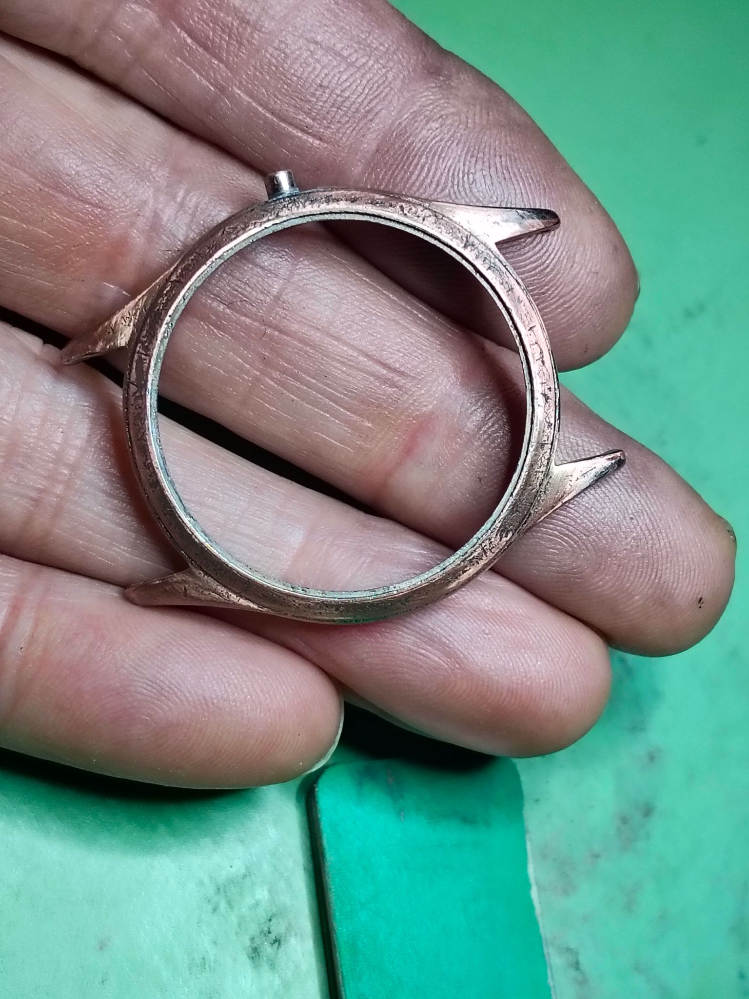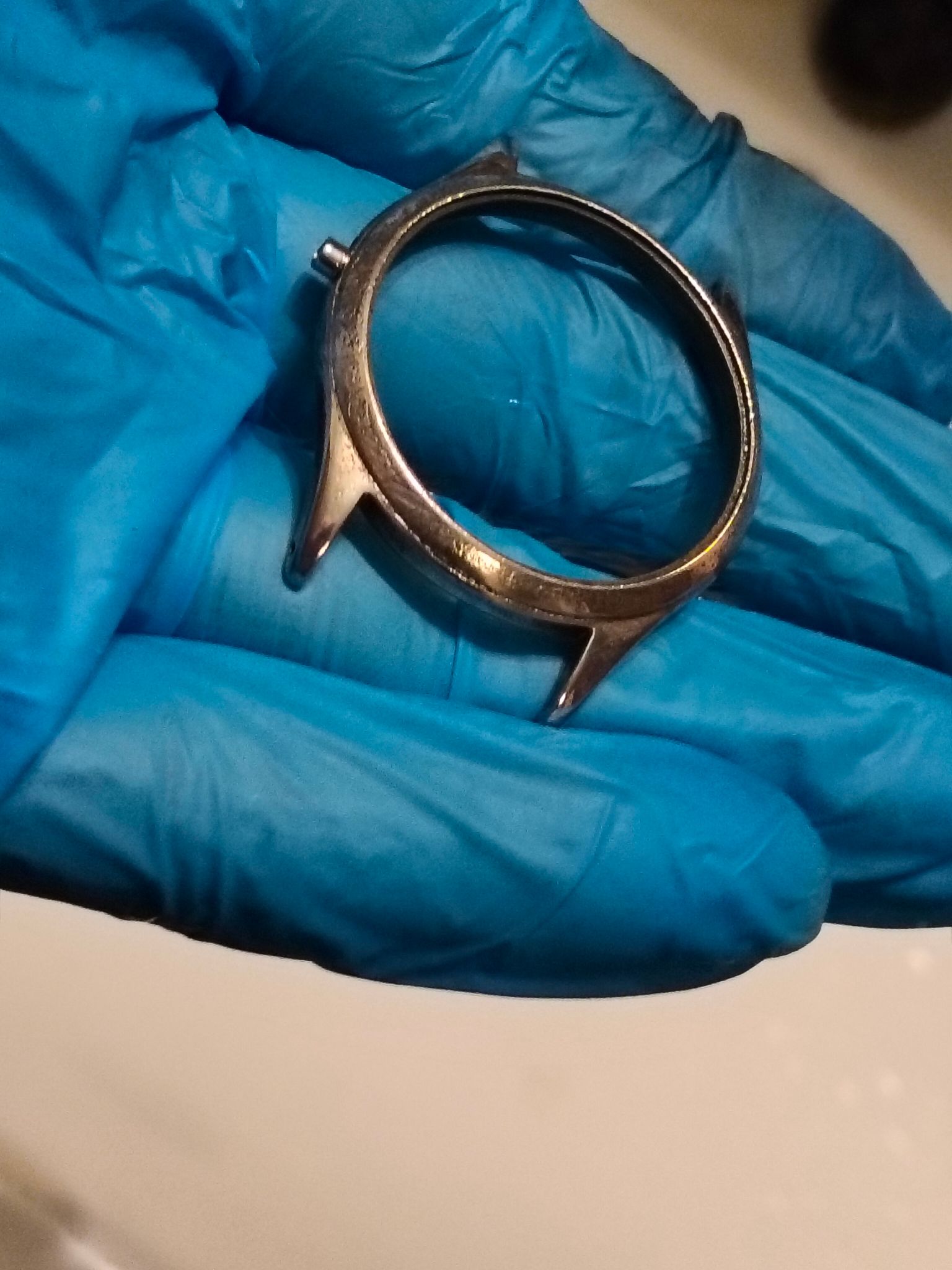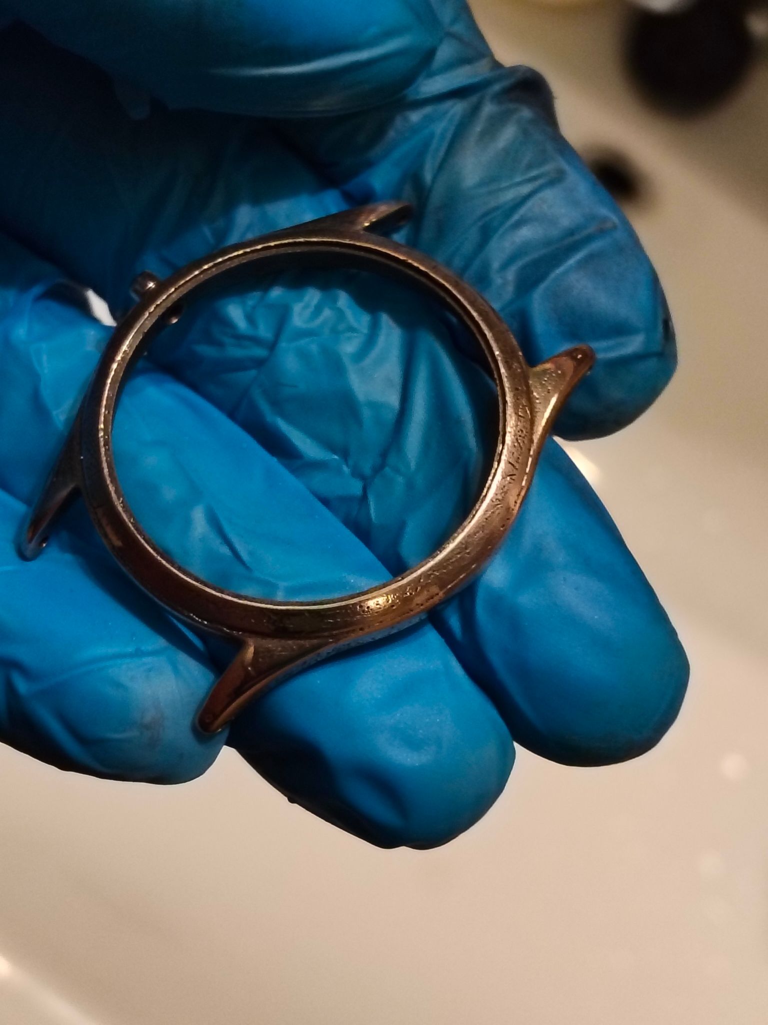 Dus ik was een uurtje geleden begonnen met een paar schuurblokjes van Aliexpress en onder de microscoop om de chroomlaag er weer af te schuren en waar nodig tot de koperlaag, zodat de krassen die erin blijven zitten geen storend effect meer hebben en de vintage-uitstraling behouden blijft.