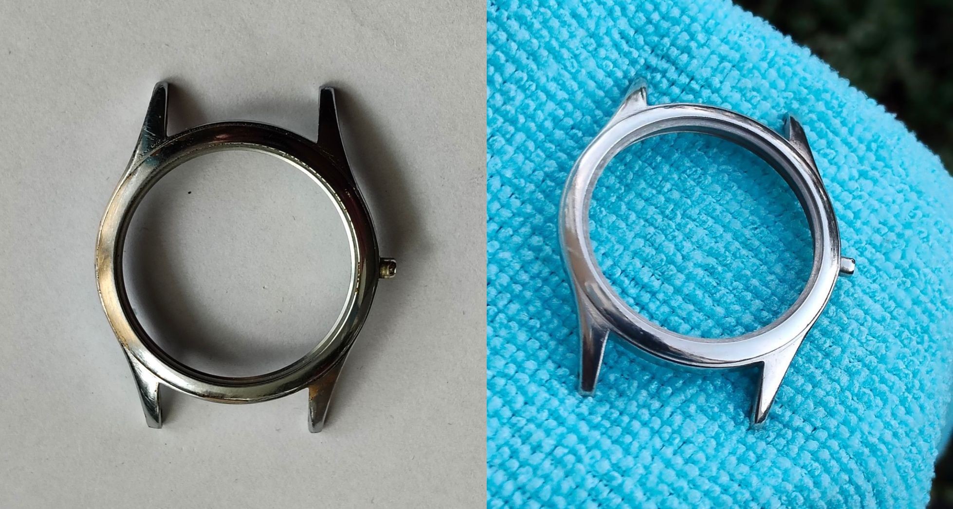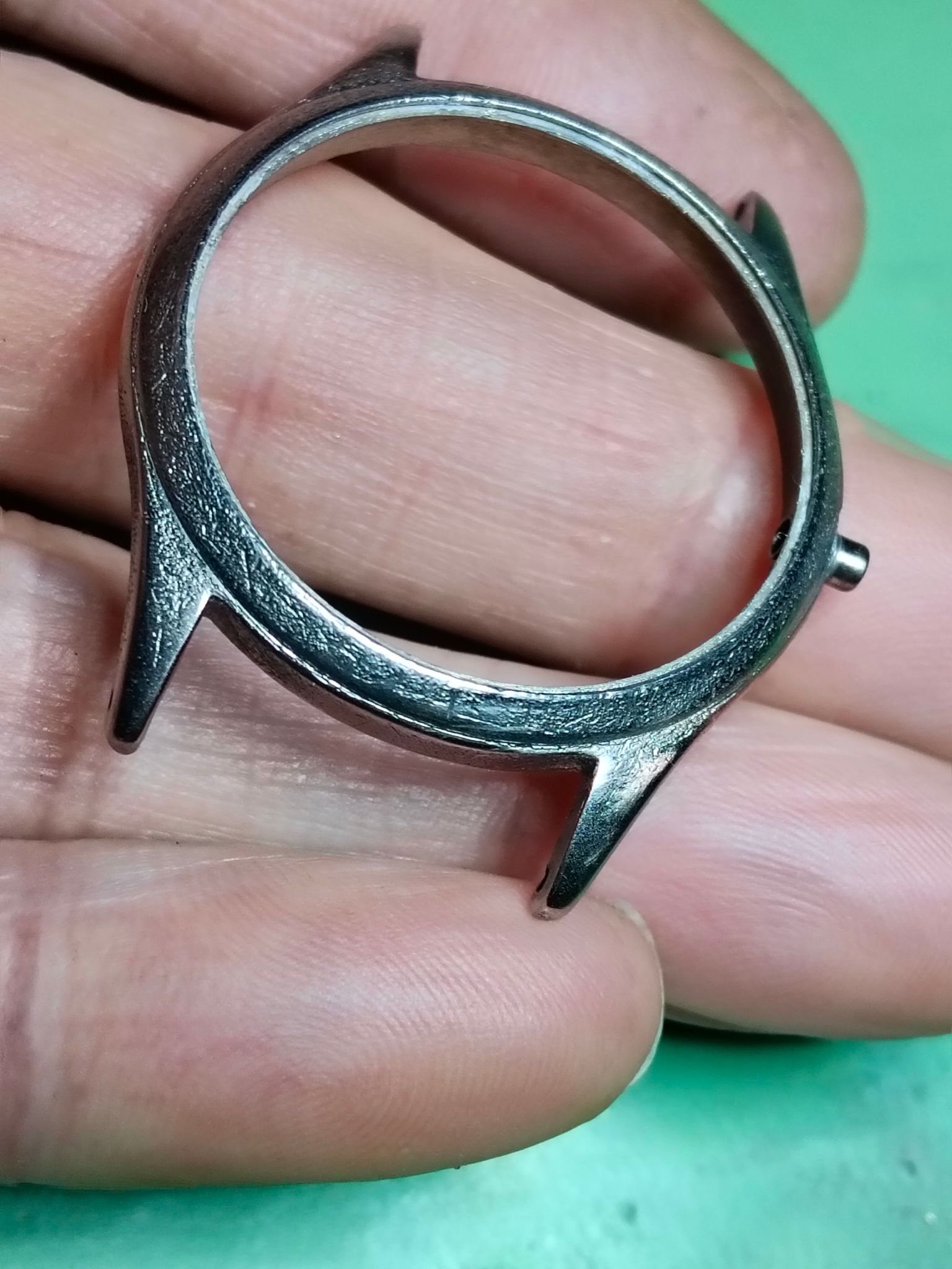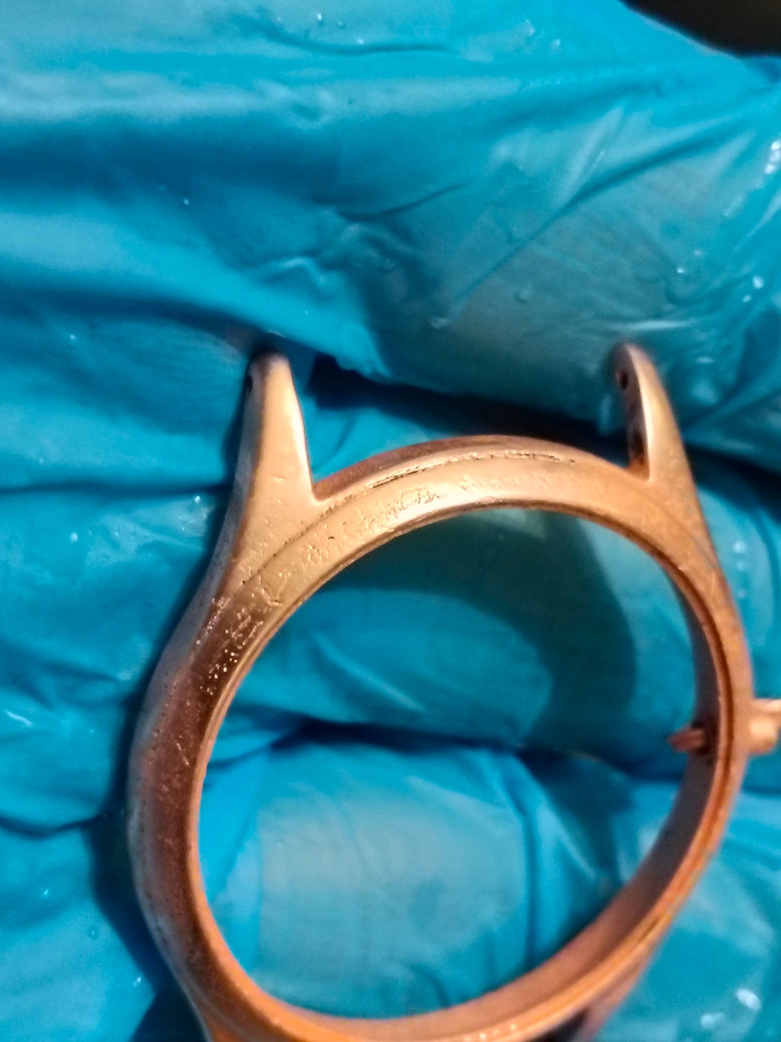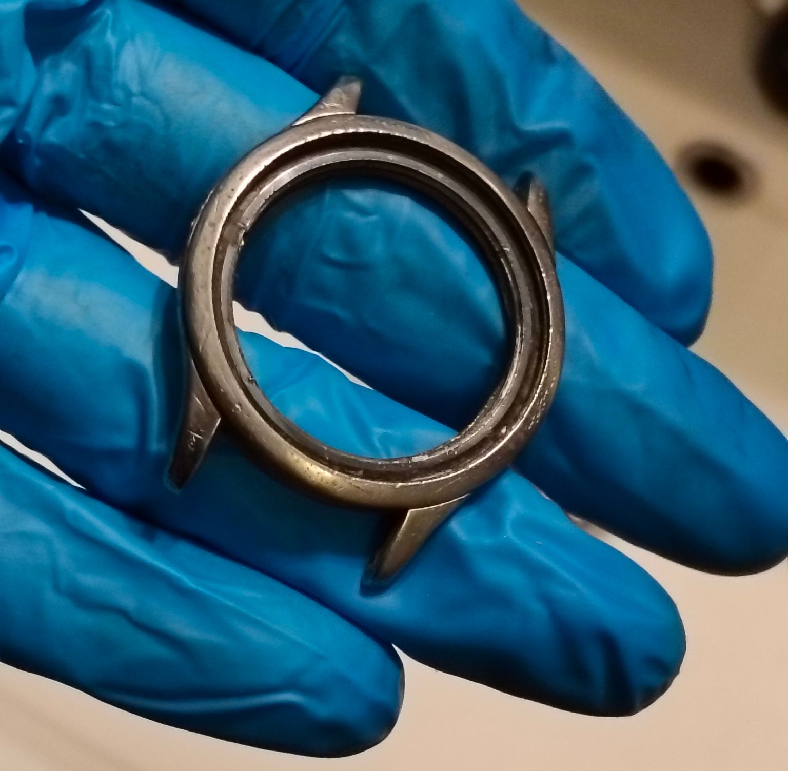 Dus ik was een uurtje geleden begonnen met een paar schuurblokjes van Aliexpress en onder de microscoop om de chroomlaag er weer af te schuren en waar nodig tot de koperlaag, zodat de krassen die erin blijven zitten geen storend effect meer hebben en de vintage-uitstraling behouden blijft.