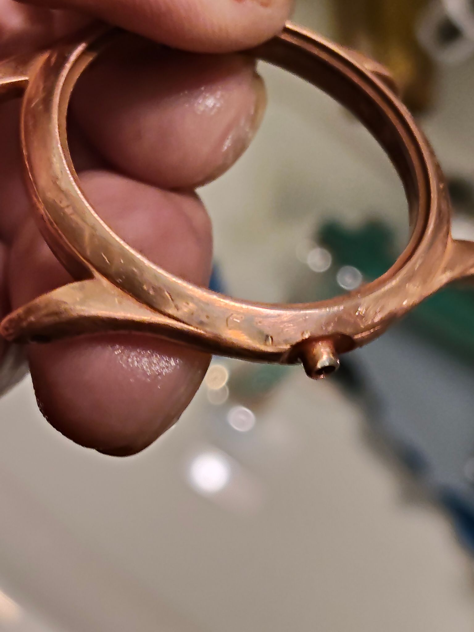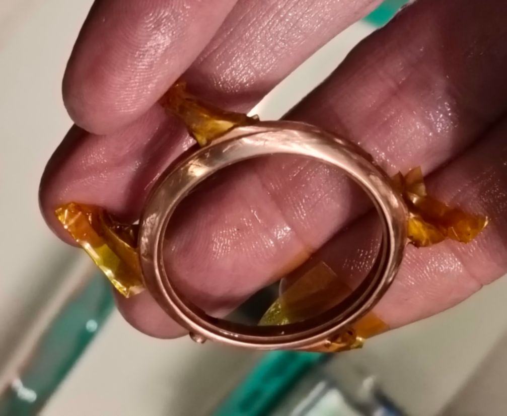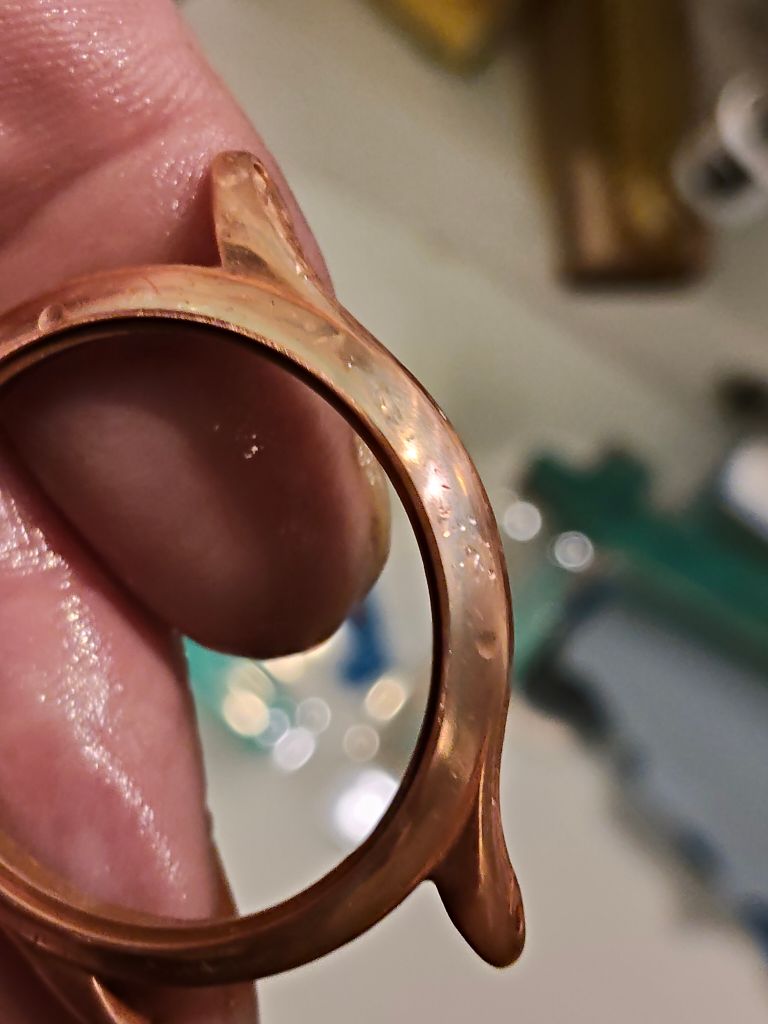 Ik ben nu aan het schuren; zoals je kunt zien, ben ik er nog niet. Als de koperlaag dik genoeg is, kan ik het eruit schuren; anders komt er nog een laag overheen. Dat is ook een reden om als tussenlaag een nikkellaag te leggen, zodat je kunt zien dat je niet te diep gaat.