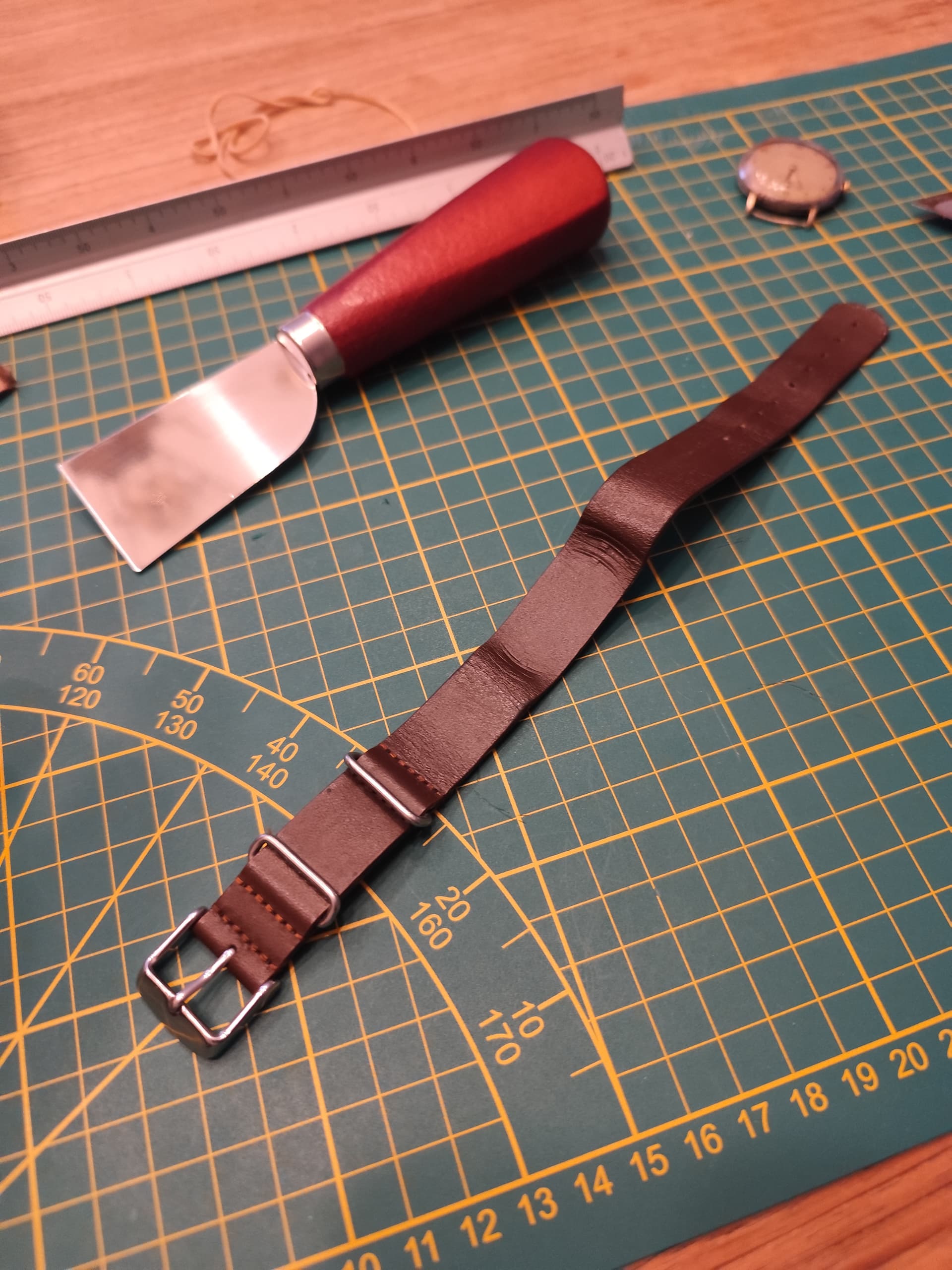 - Uiteinde strap 3,5 cm ingekort, daarbij heb ik het afgesneden deel als mal gebruikt voor de ronding, na afsnijden met schuurblok netjes gemaakt en vervolgens afgelakt