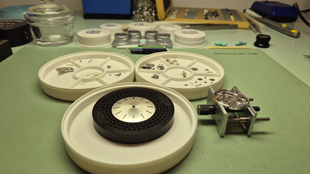 Morgen beginnen met opbouw. Handopwindertje, zou in (nog) 1 avond moeten kunnen. 14K kastje, heb het gehavende glaasje weten te behouden. Er blijft 1 restje van een diepe kras zichtbaar.