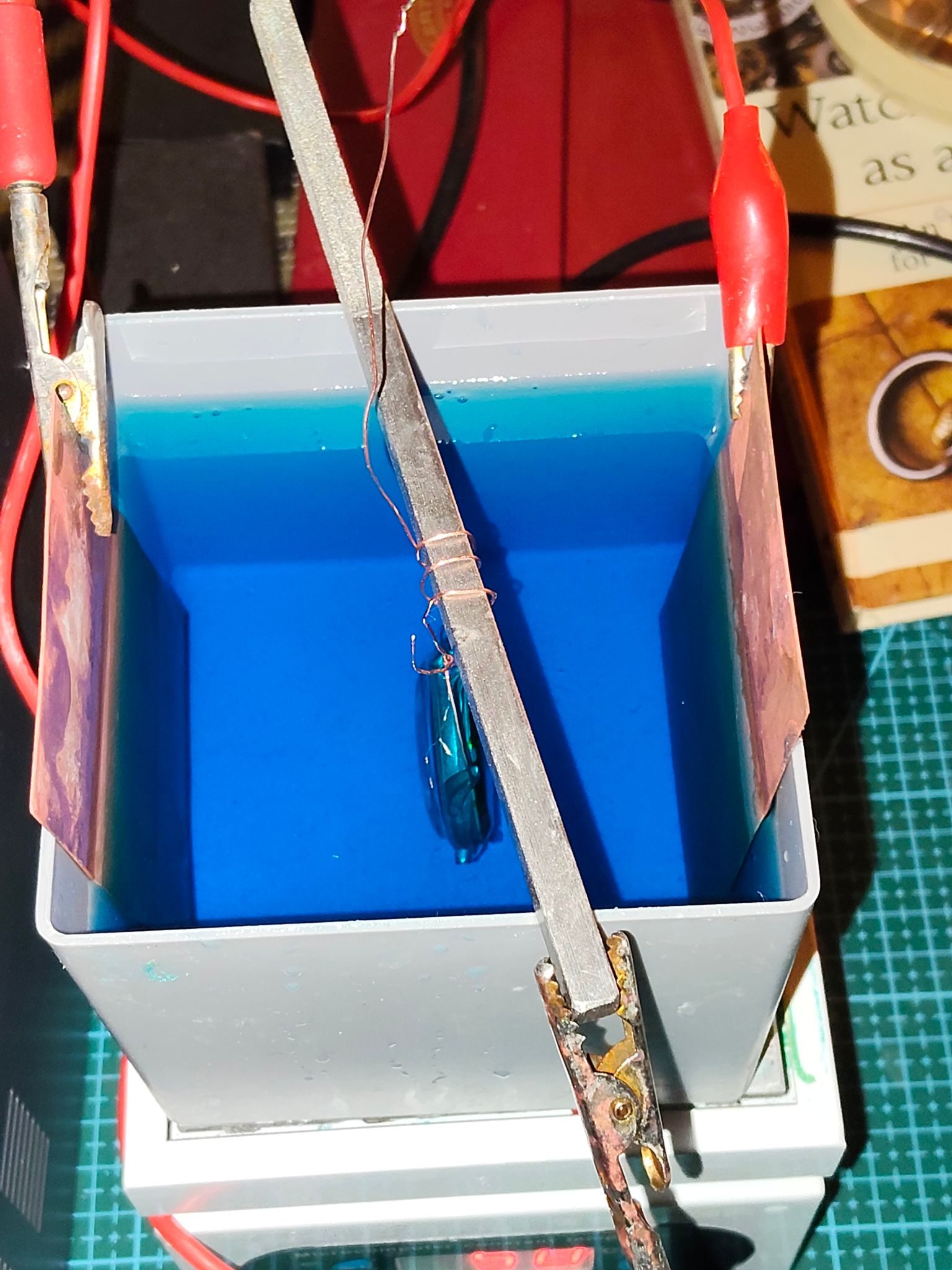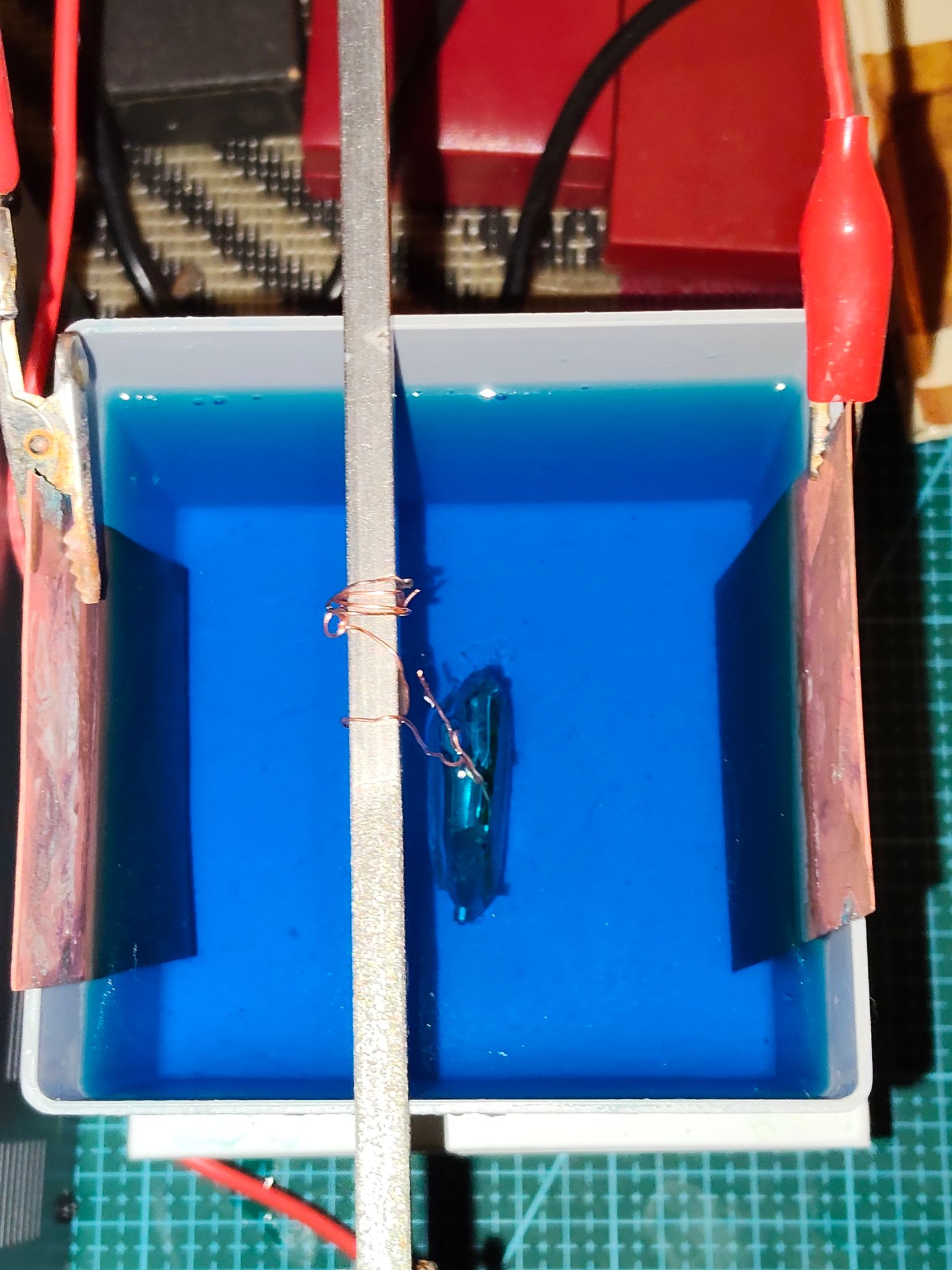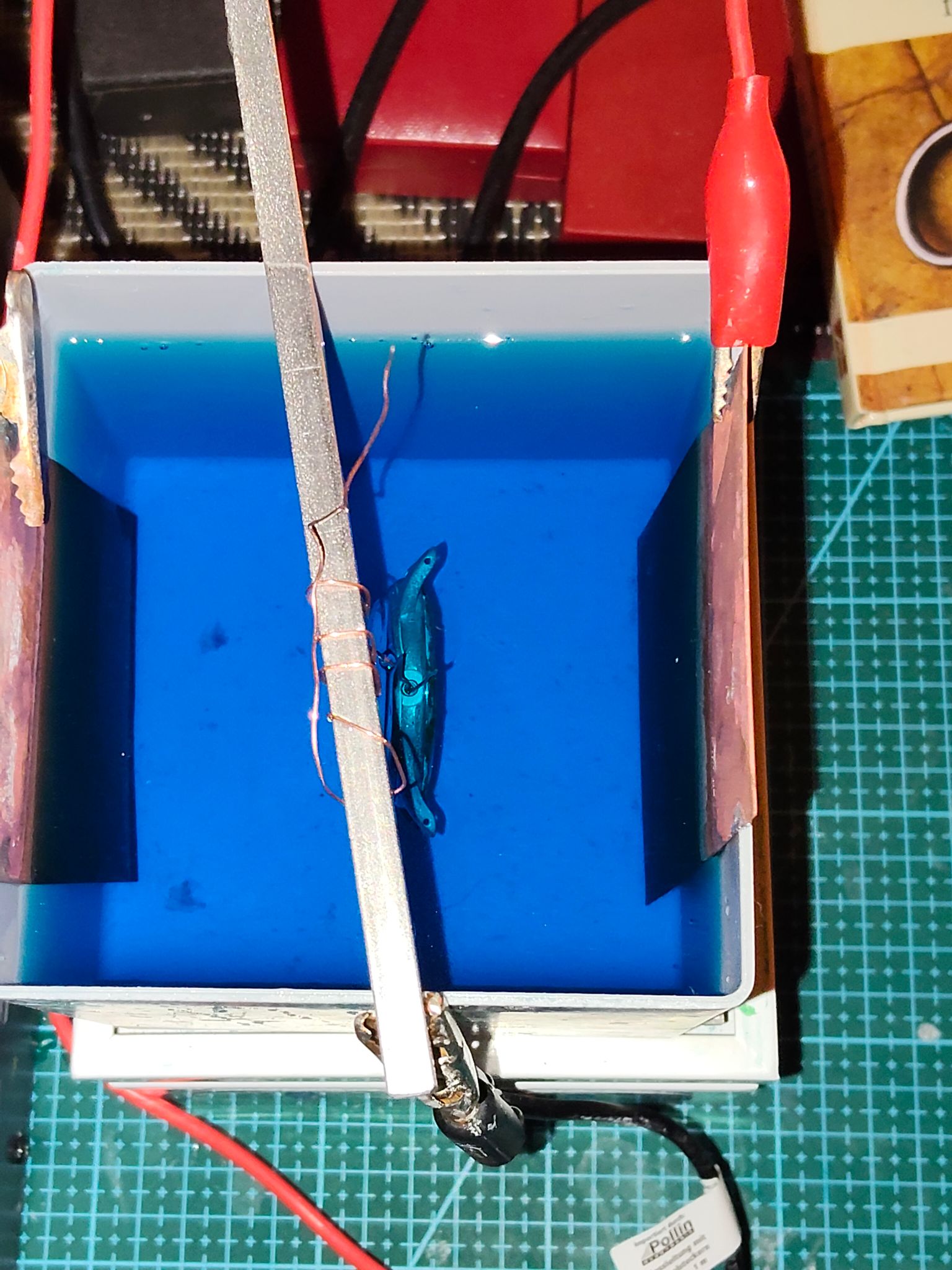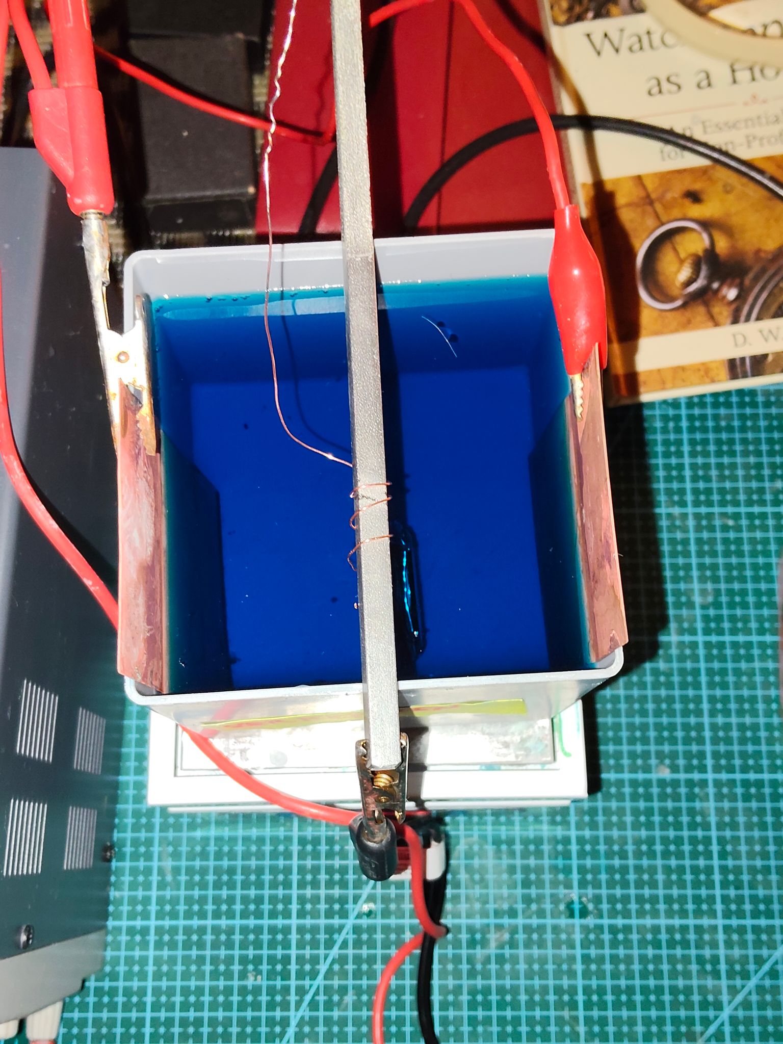 Ik ga een koperflashlaag aanbrengen op lage stroom. Dit is om de hechting voor de volgende koperlaag te optimaliseren. Koperflashlaag heeft een dompeltijd van een paar minuten.