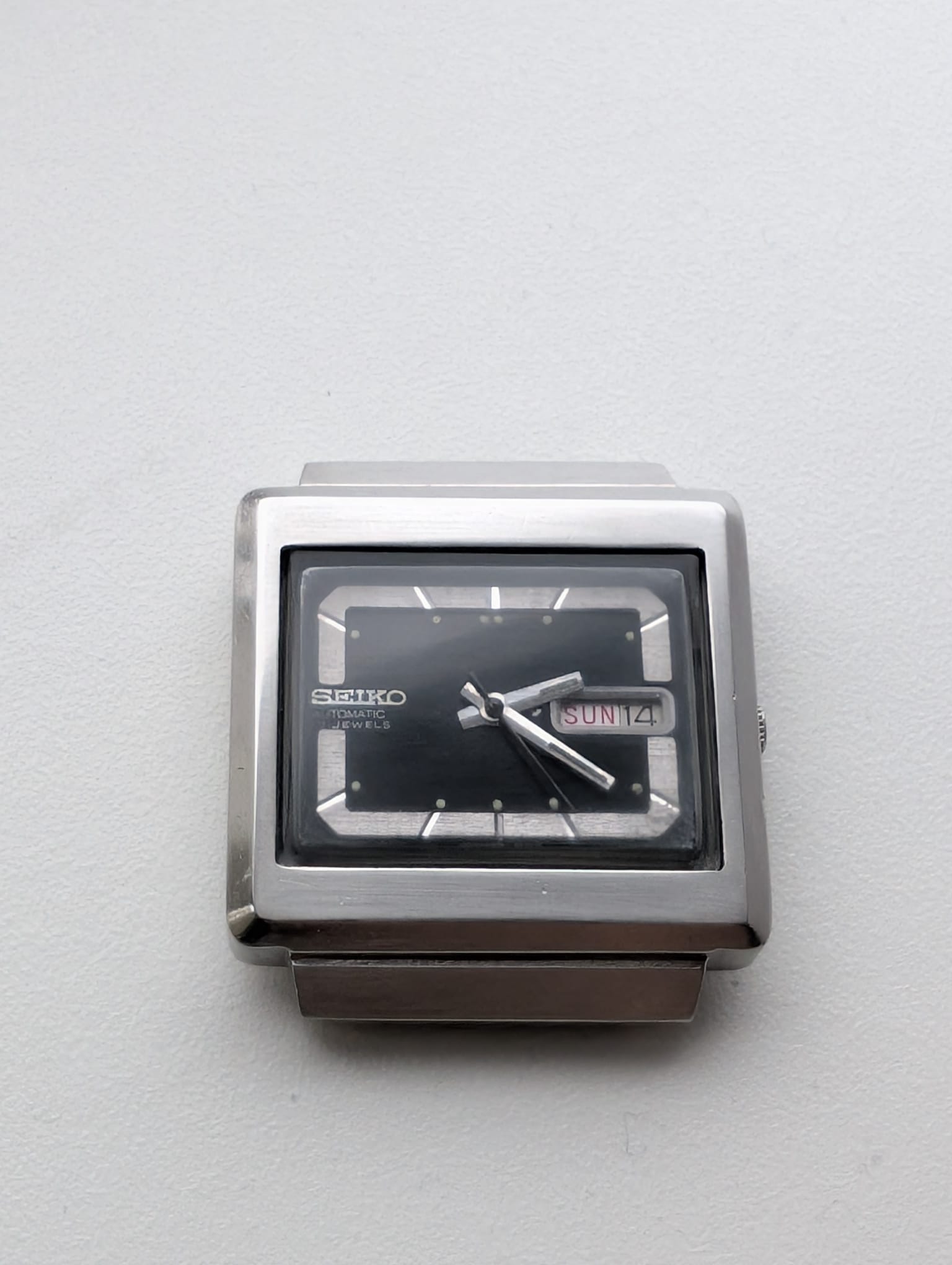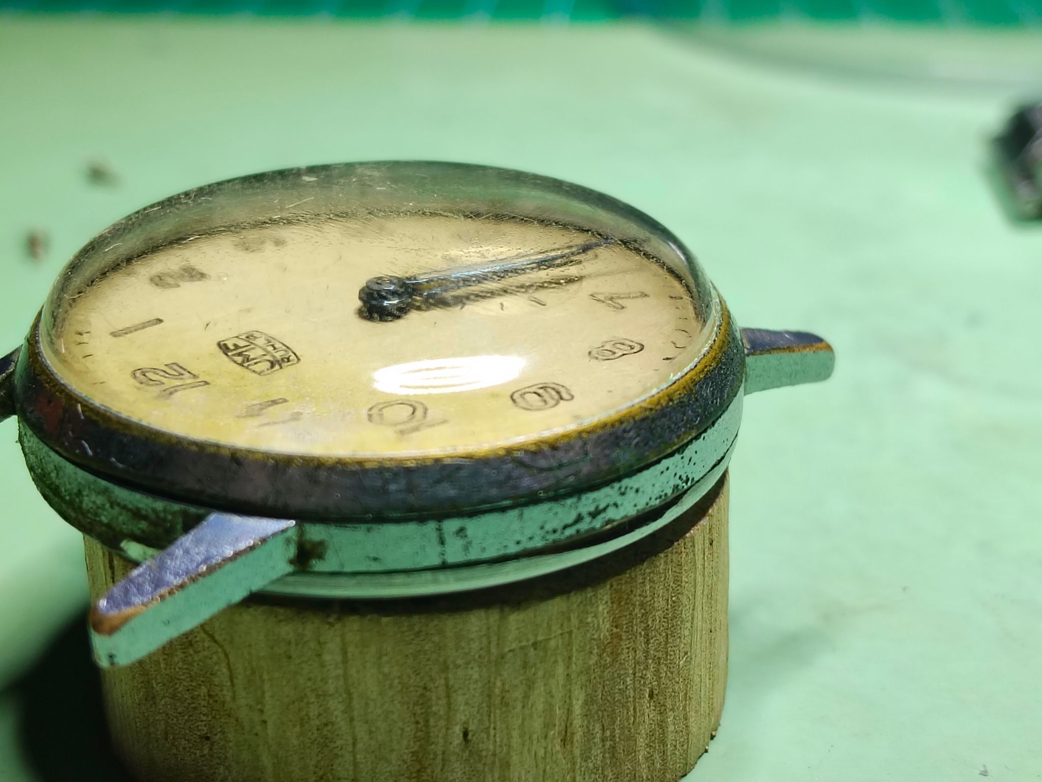 Het uurwerk liep niet, veel roestschade op o.a. het opwind- en verzetmechanisme, glaasje vol krassen. Ik heb uiteindelijk een (defect) donor uurwerk gekocht om het te repareren. De kast was in goede staat, paar kleine krasjes weggepoetst, maar meer ook niet.