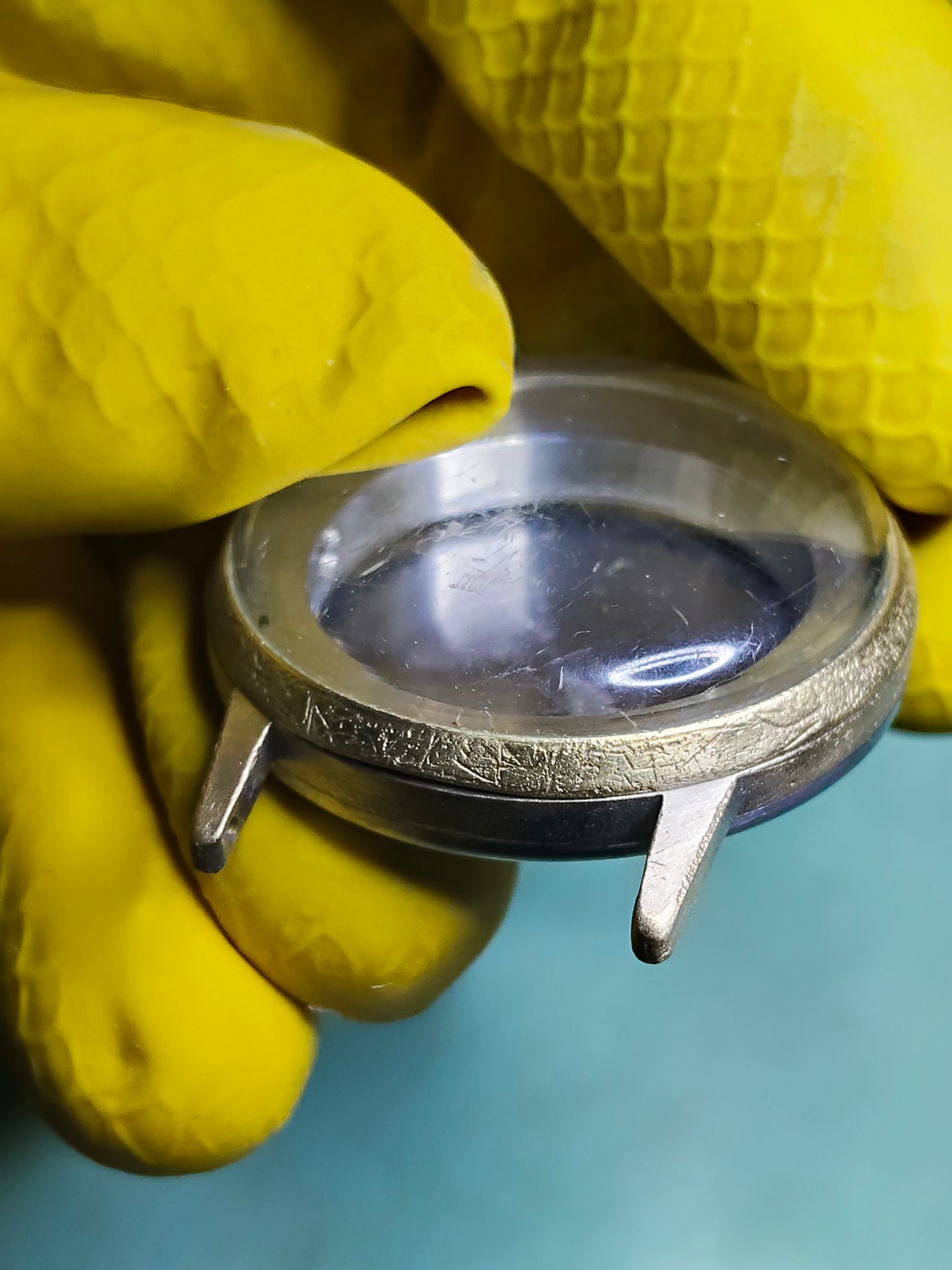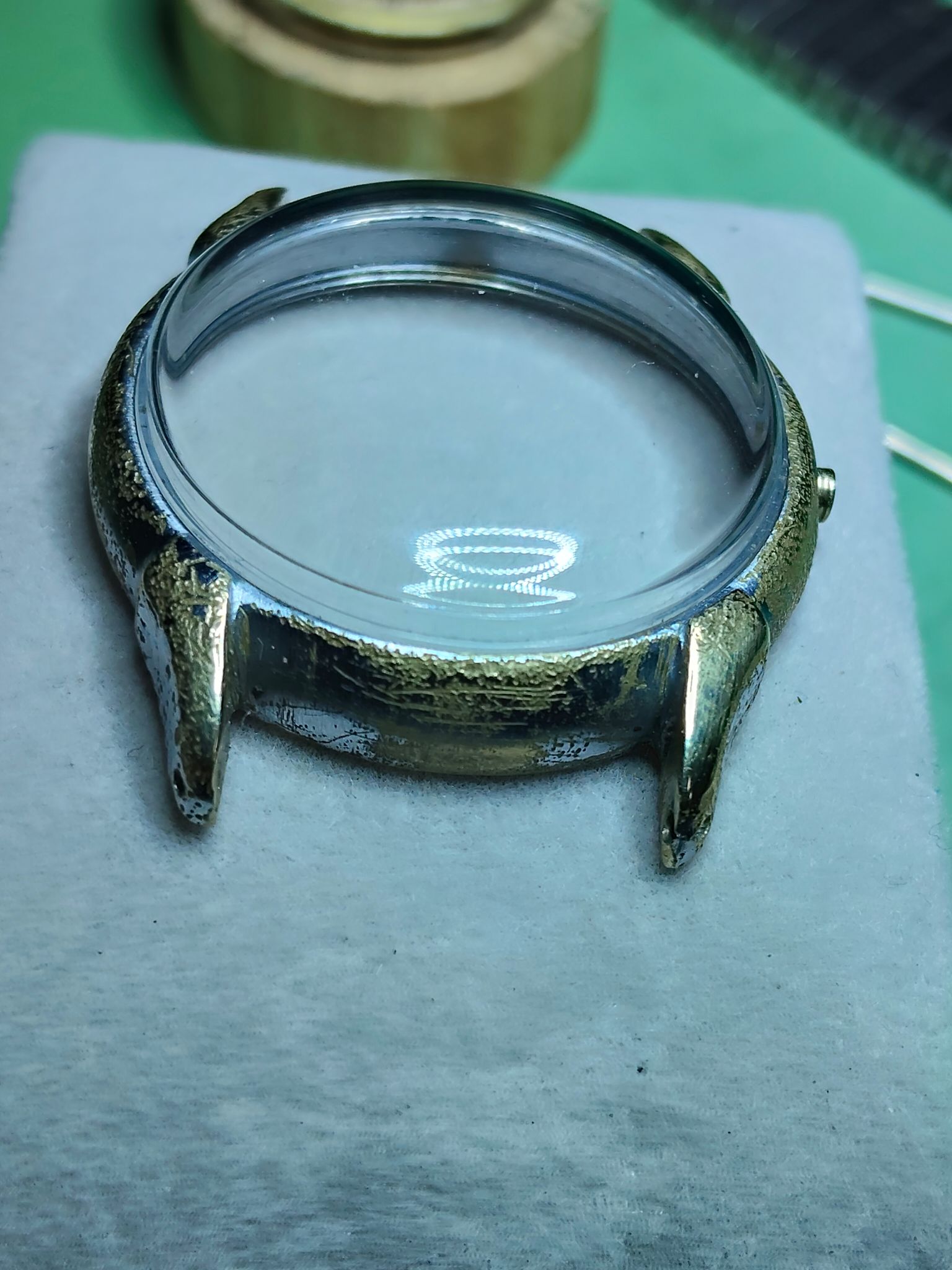 Gek gezicht die opgevulde krassen. Zijn ipv krassen dan een soort deuken geworden. Dan vind ik het origineel met tandjes des tijds beter. Of volledig opgeknapt (maar dan moet er niet te groot verschil zijn met het uiterlijk van de wijzerplaat en wijzers). Kast en inhoud moet bij elkaar passen. My2cents.