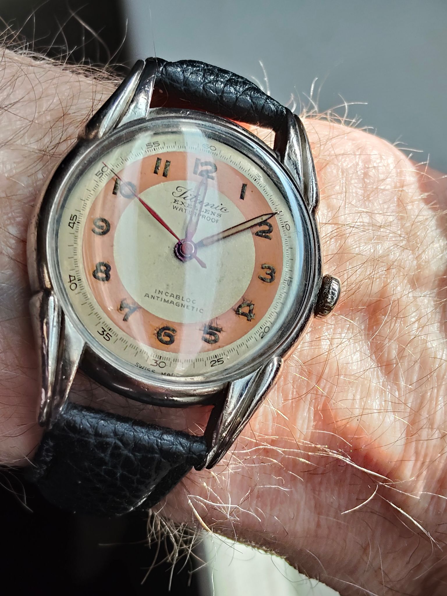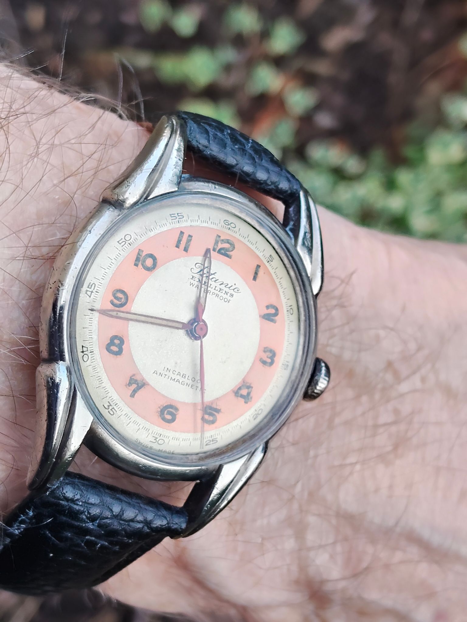 Ik weet het niet, Dennis weet het wel. Deze komt uit 1952. Is 37 mm zonder kroon met kaliber ETA 1147