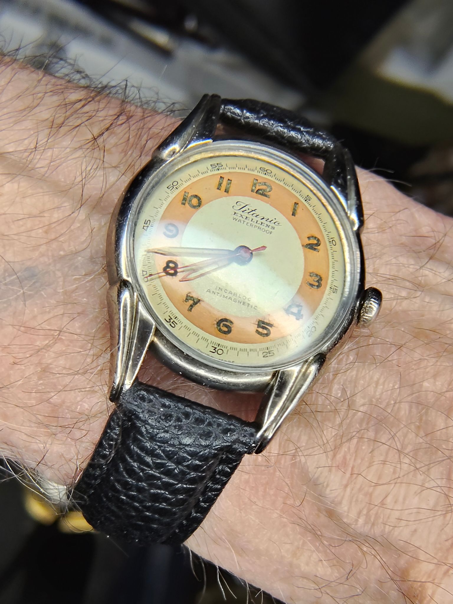 Lijkt jaren '50. Zal radium zijn. Ik zelf ben daar niet al te panisch over - je hebt het hier ook alleen op de wijzers. Doe een mondkapje op, liefst een goede van 3M, zorg voor wat ventilatie, en bewaar de wijzers apart in een afgesloten doosje. De “radium girls” deden dit elke dag 8 of 9 uur lang he, met veel meer radium. En ze dipten hun penselen in radiumhoudende verf en puntten de tips met hun lippen.