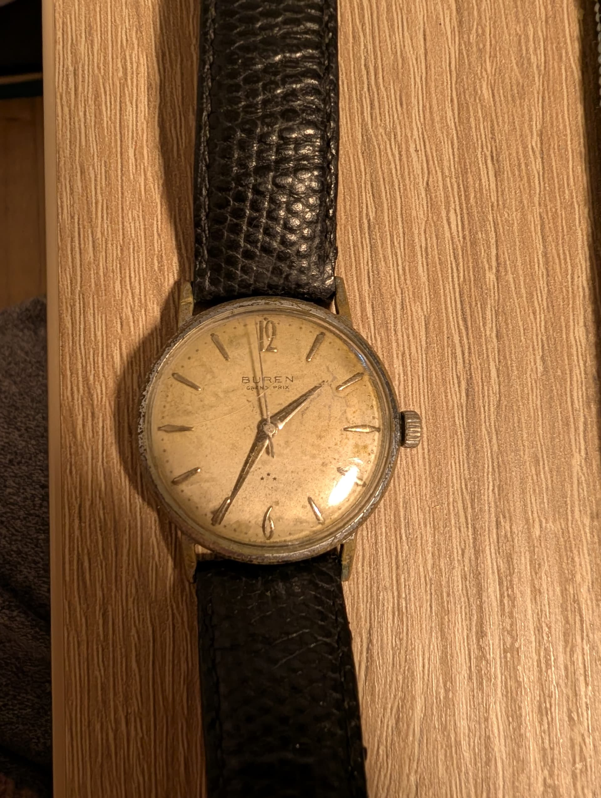 Een Buren Grand Prix uit de jaren '50 of '60 met vrijwel zeker radium op de wijzers. De wijzers zien er gelukkig nog wel intact uit. Helaas moet ik hem openmaken om hem weer volledig functioneel te maken, want de minutenwijzer steekt te ver in de stam en blijft dus hangen.