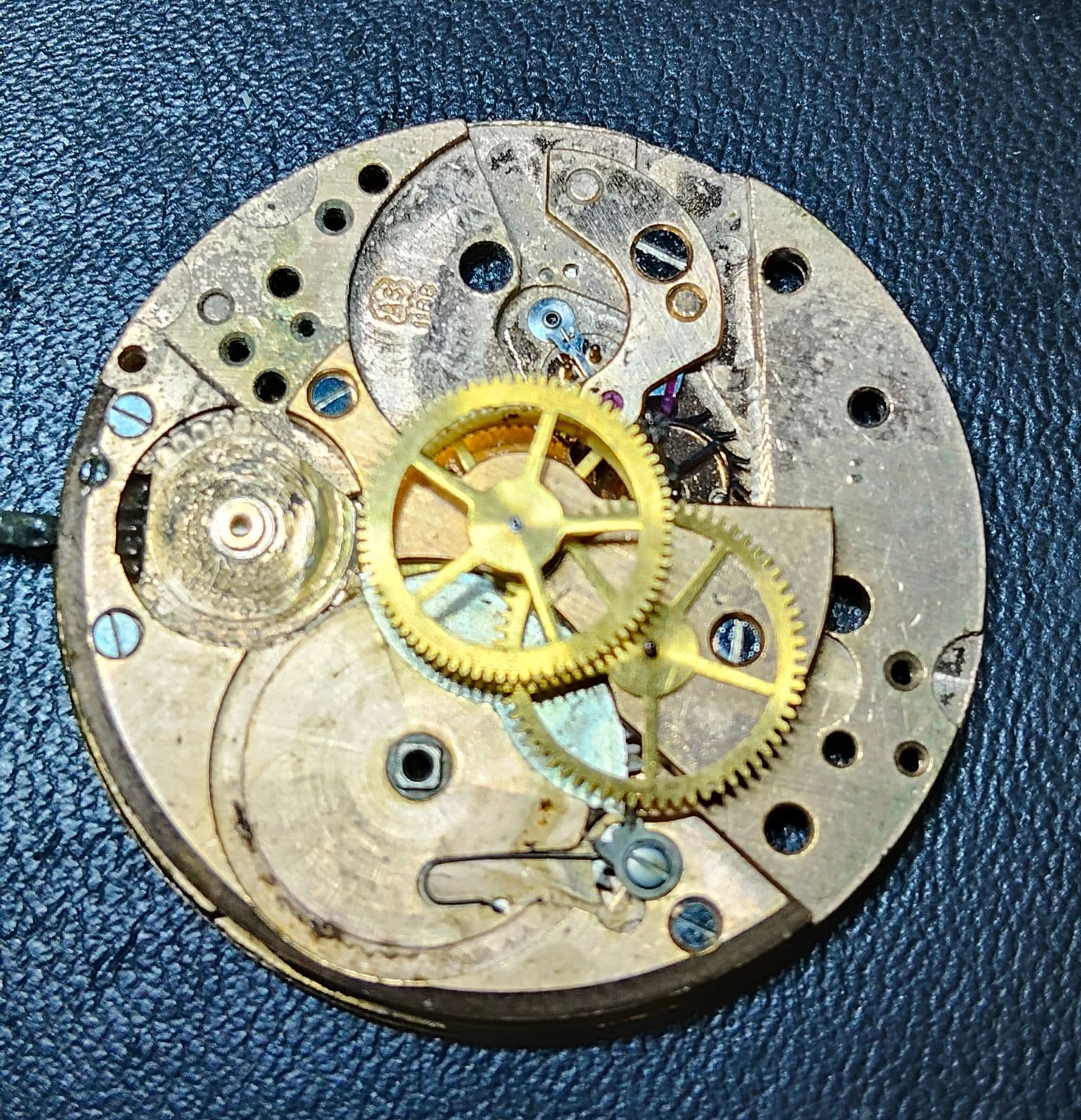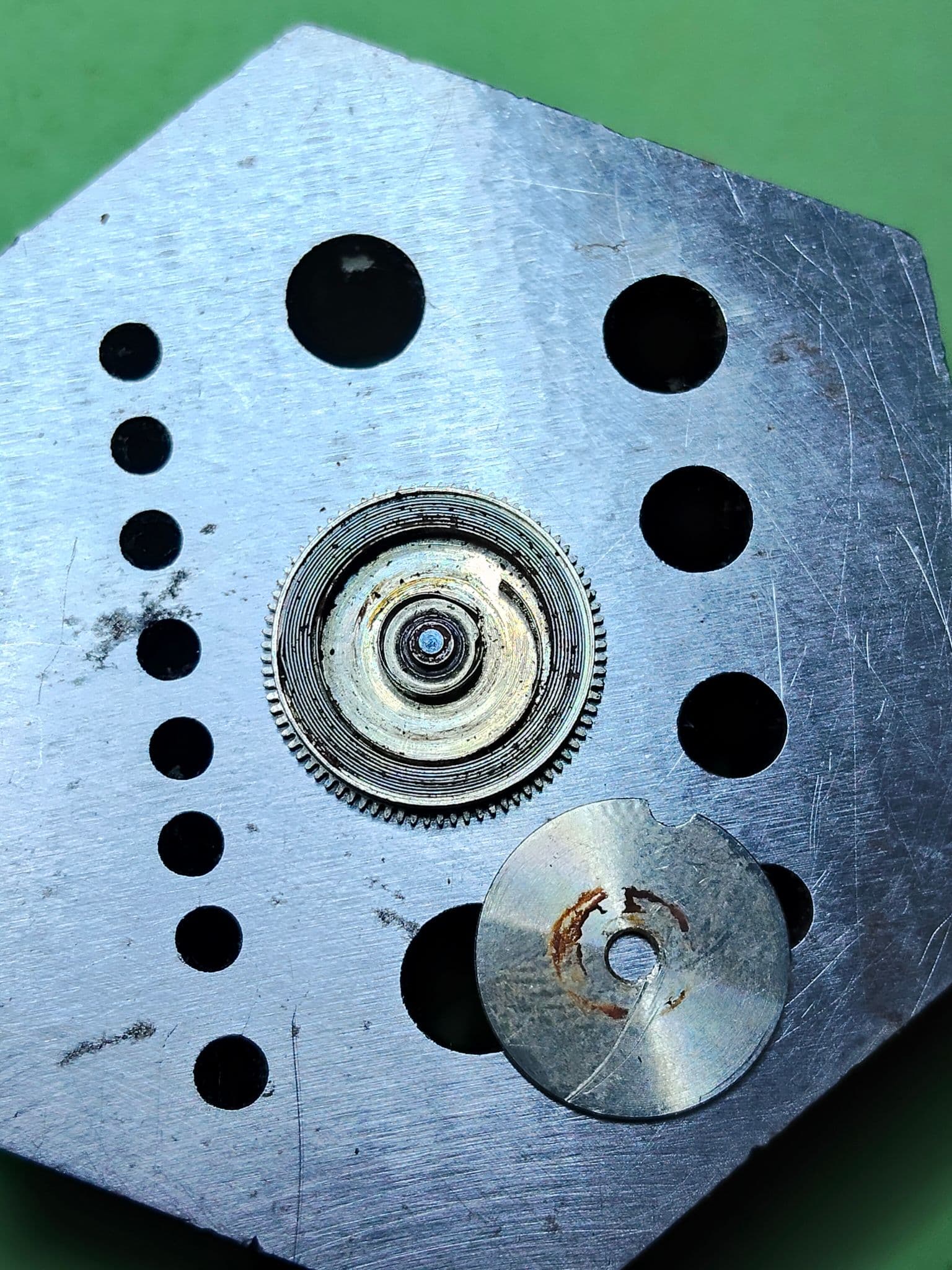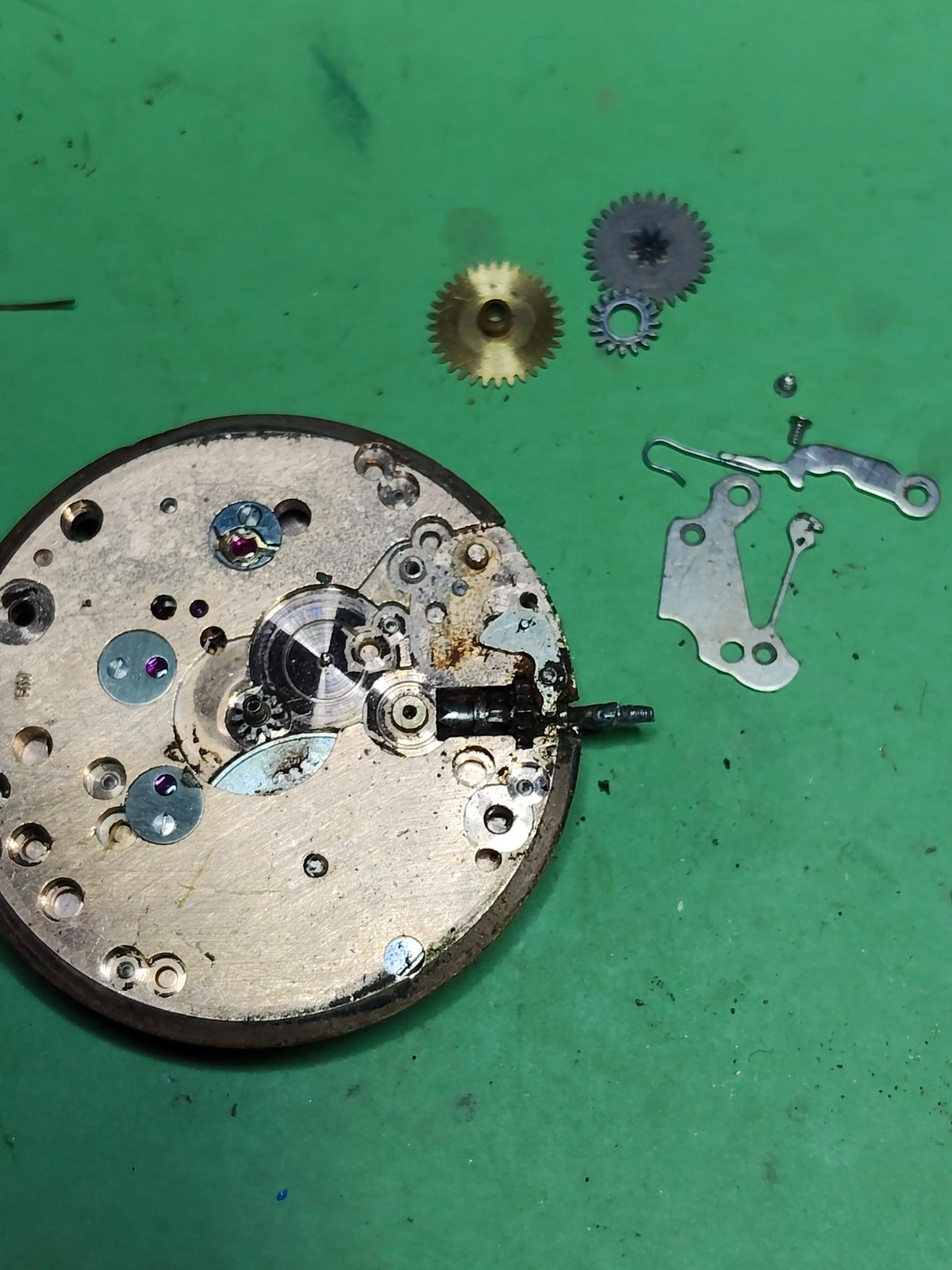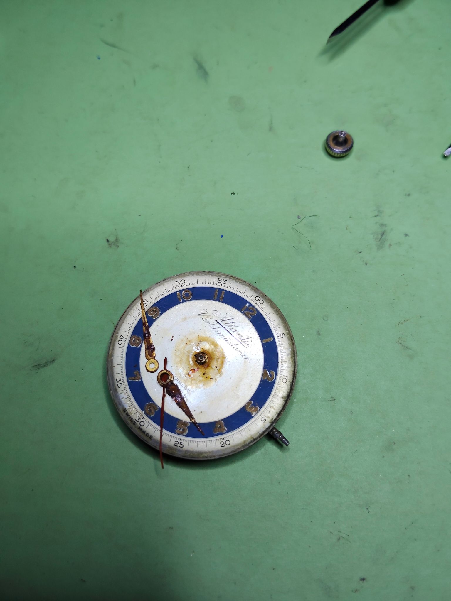 De roestvlek op de plaat zal ik ook proberen te verwijderen, plus de wijzers vragen om aandacht, en de opwindveer is gebroken.