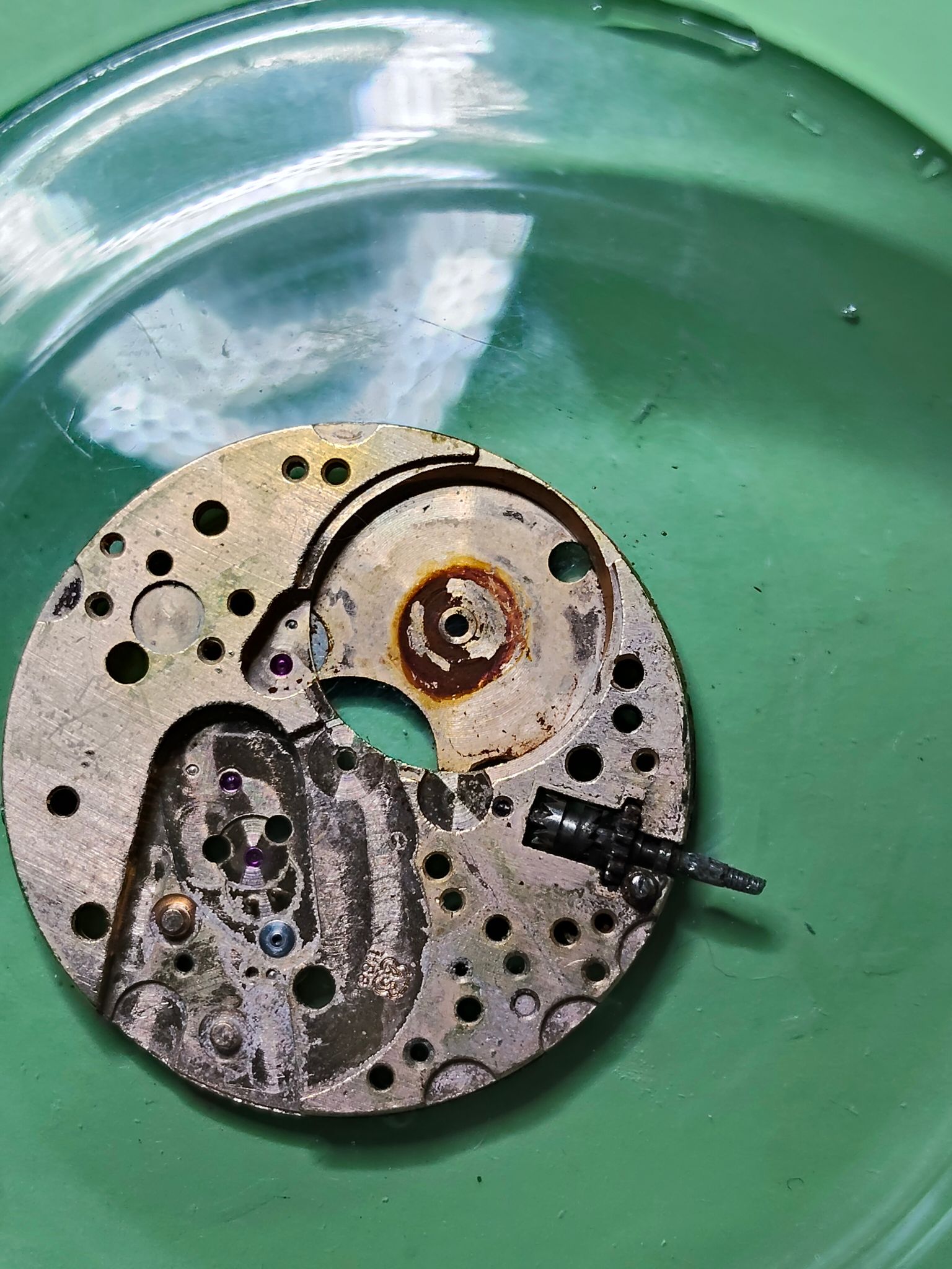 Keyless gedeelte gedemonteerd, alleen de settinglever en het schroefje zitten vastgeroest. Dus de stem krijg ik er op dit moment nog niet uit.