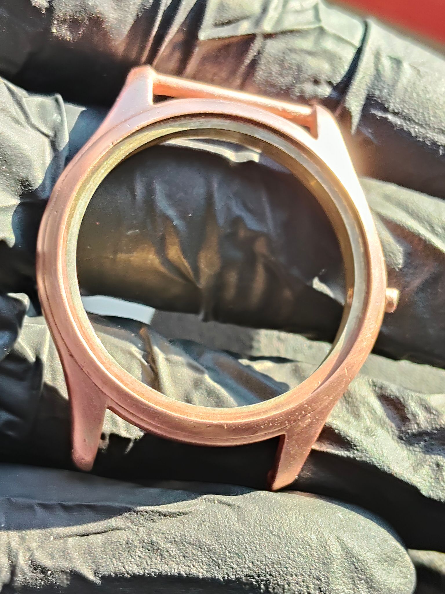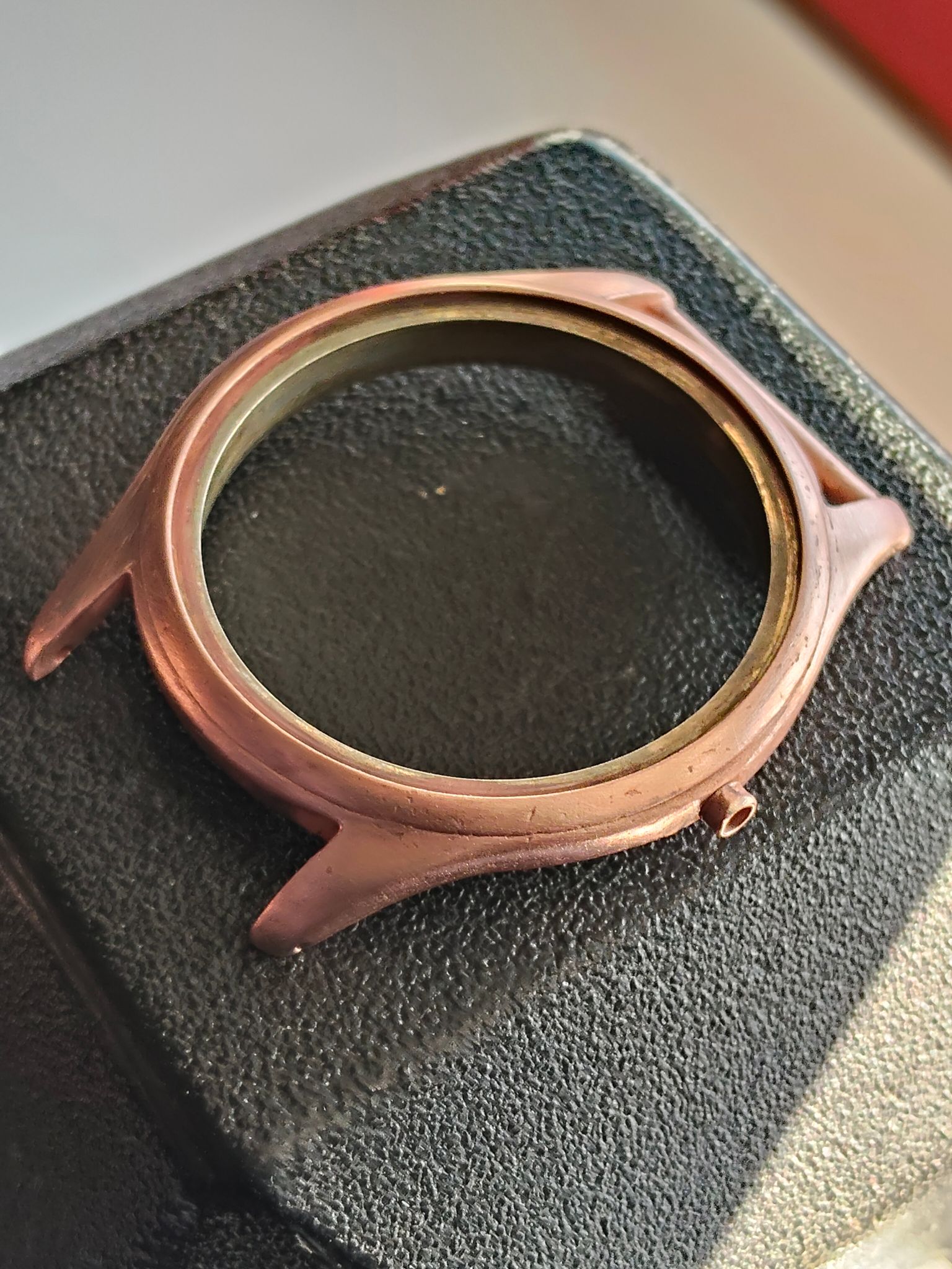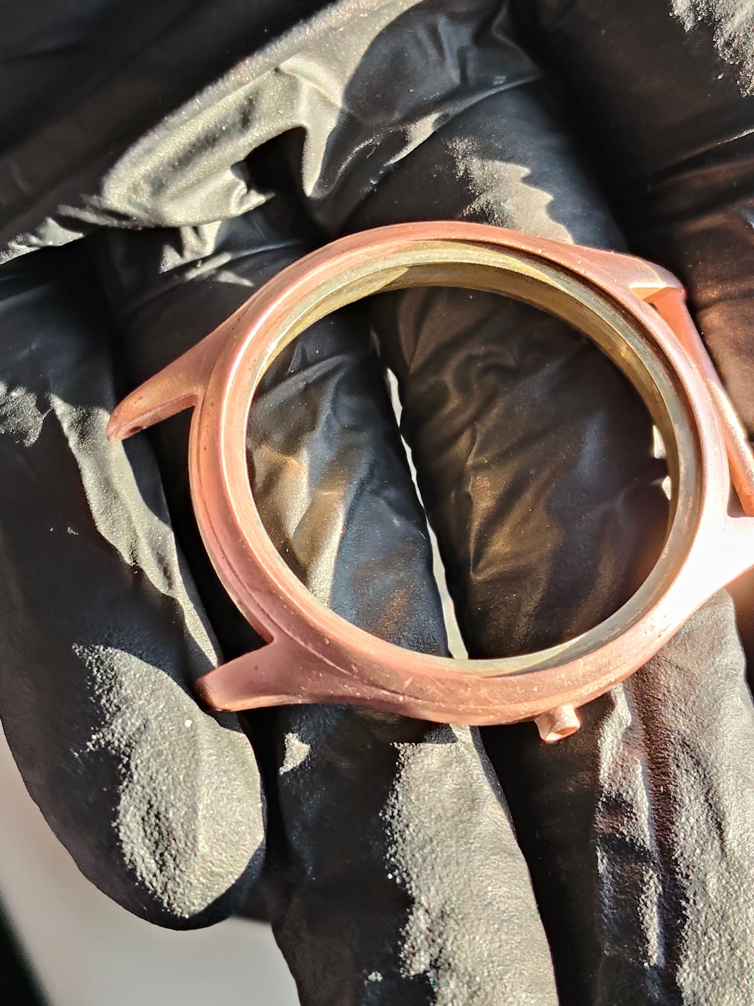 Drie koperlagen zitten erop, tussen de lagen door geschuurd.