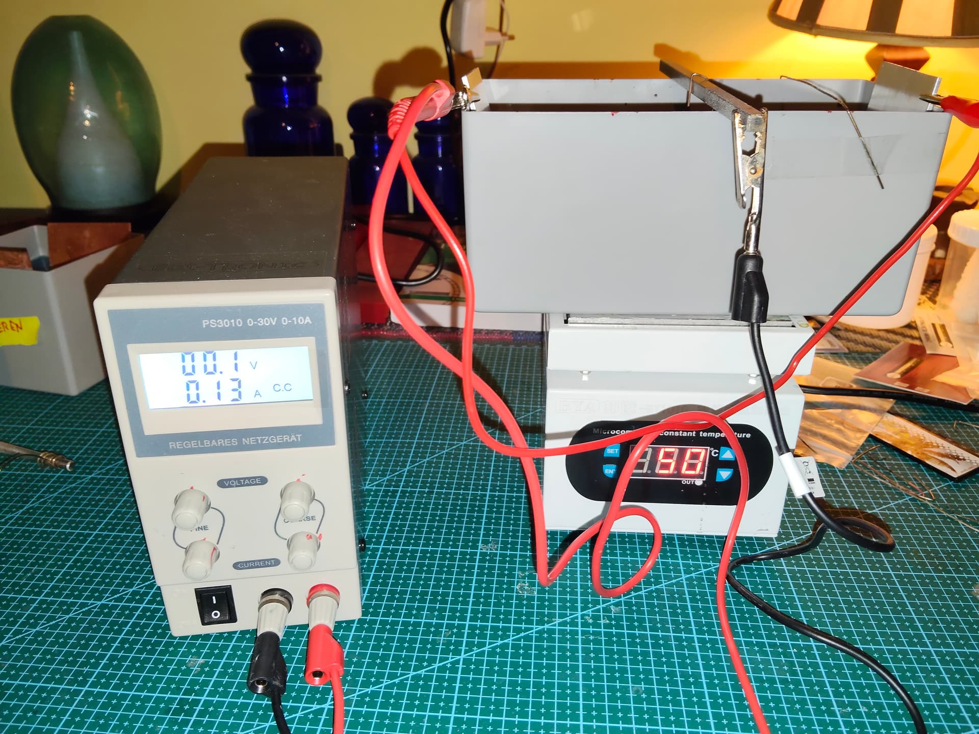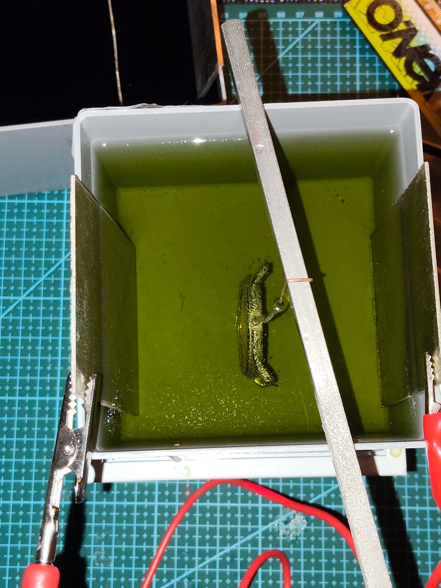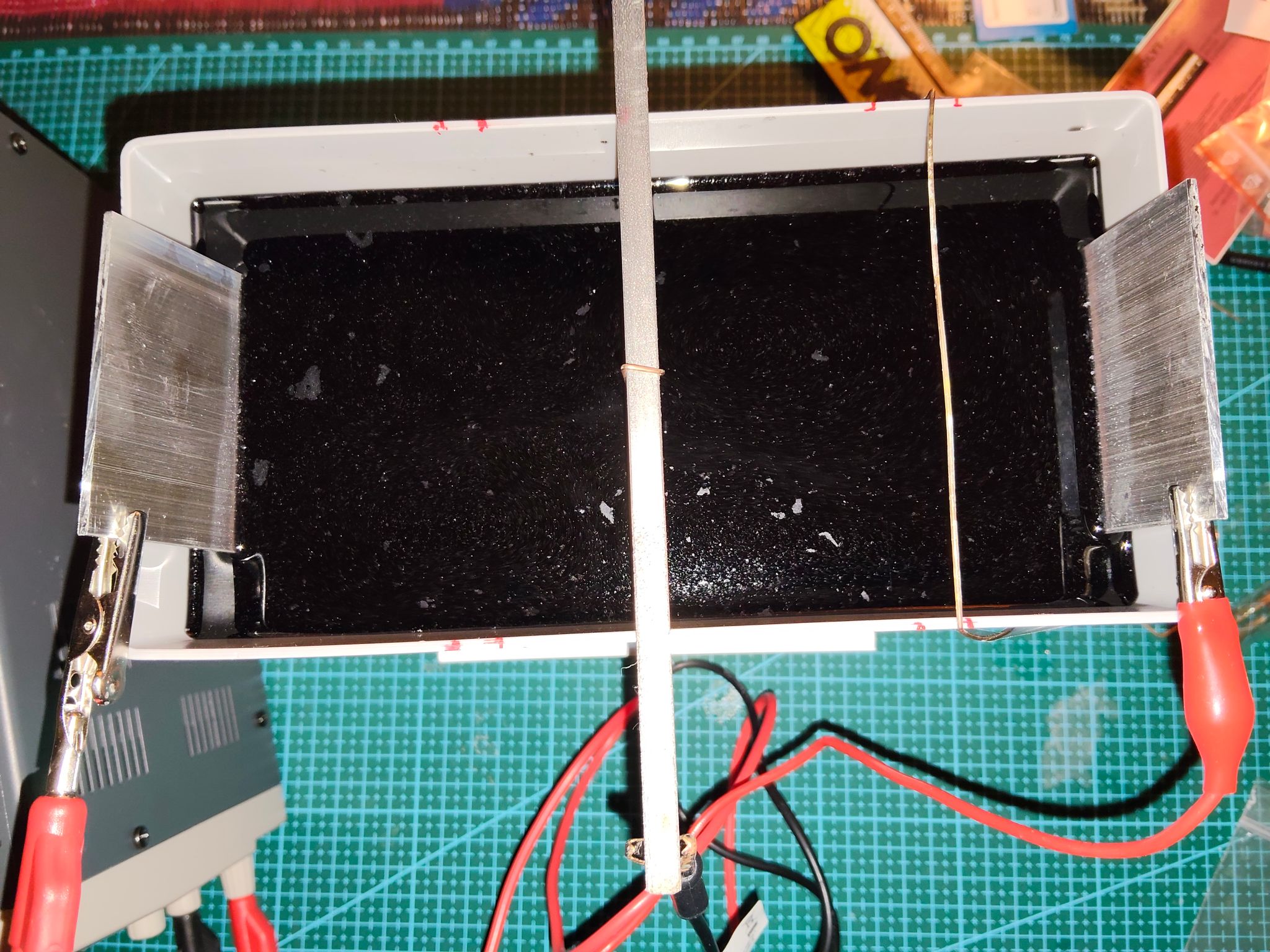 Het ziet hier in het chroombad. Ik heb een ruimere kuip genomen, omdat de afstand tot de anode ongeveer een cm of tien moet zijn.
