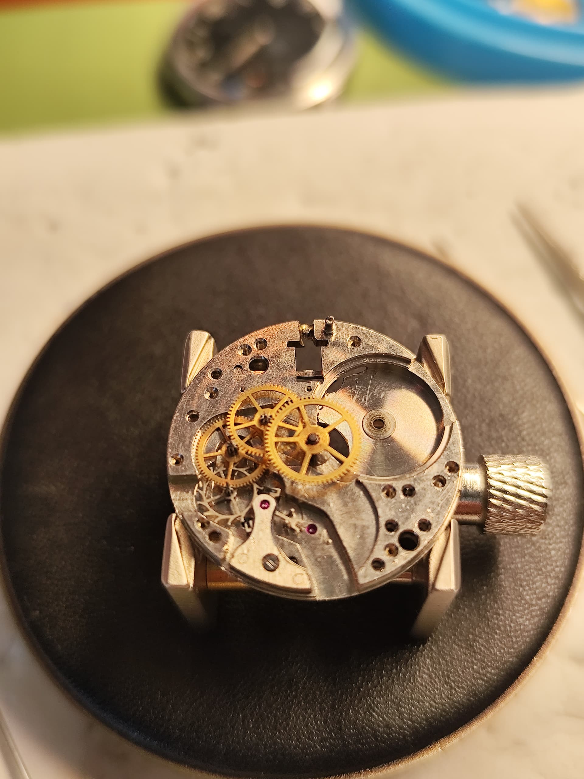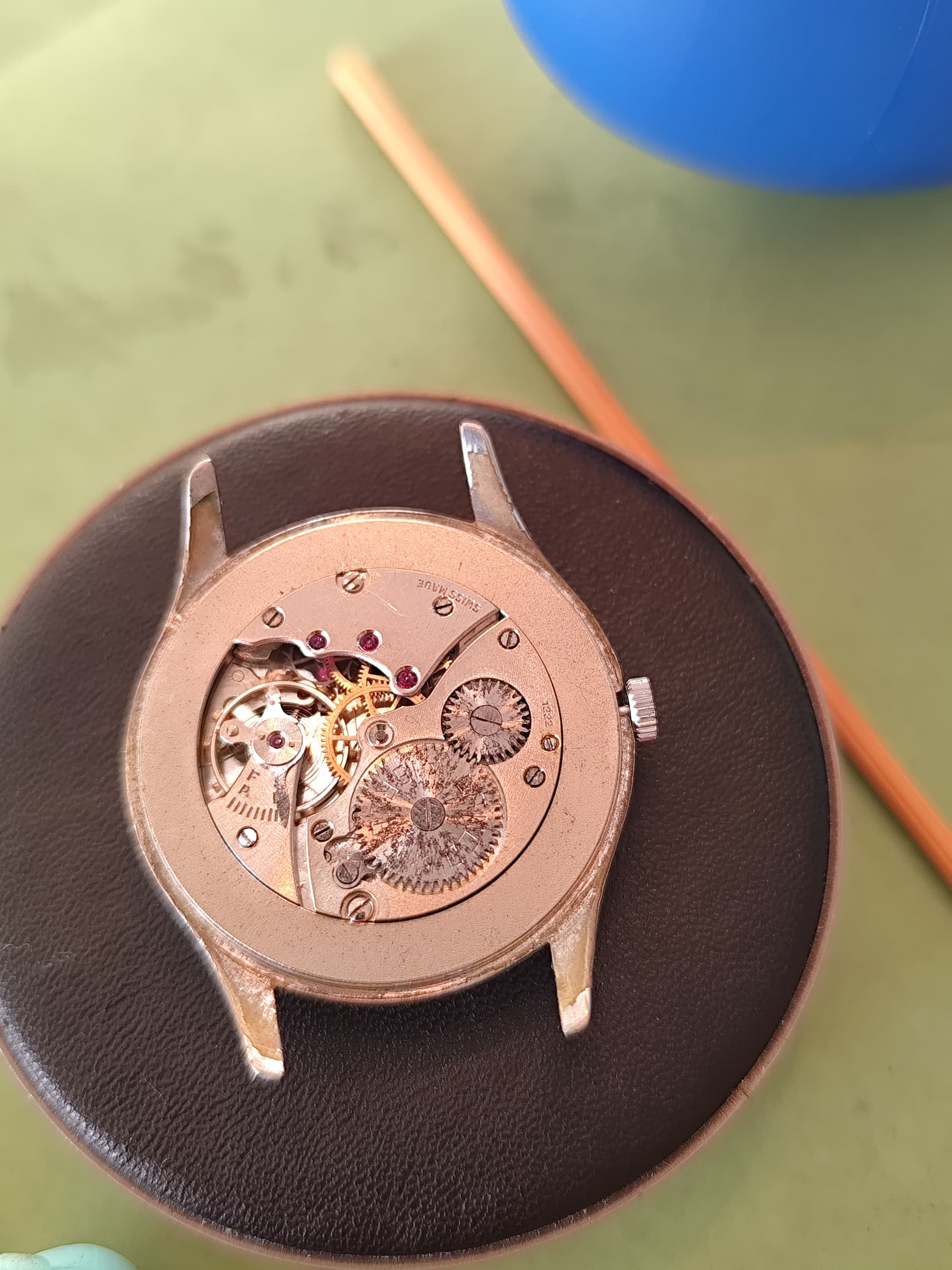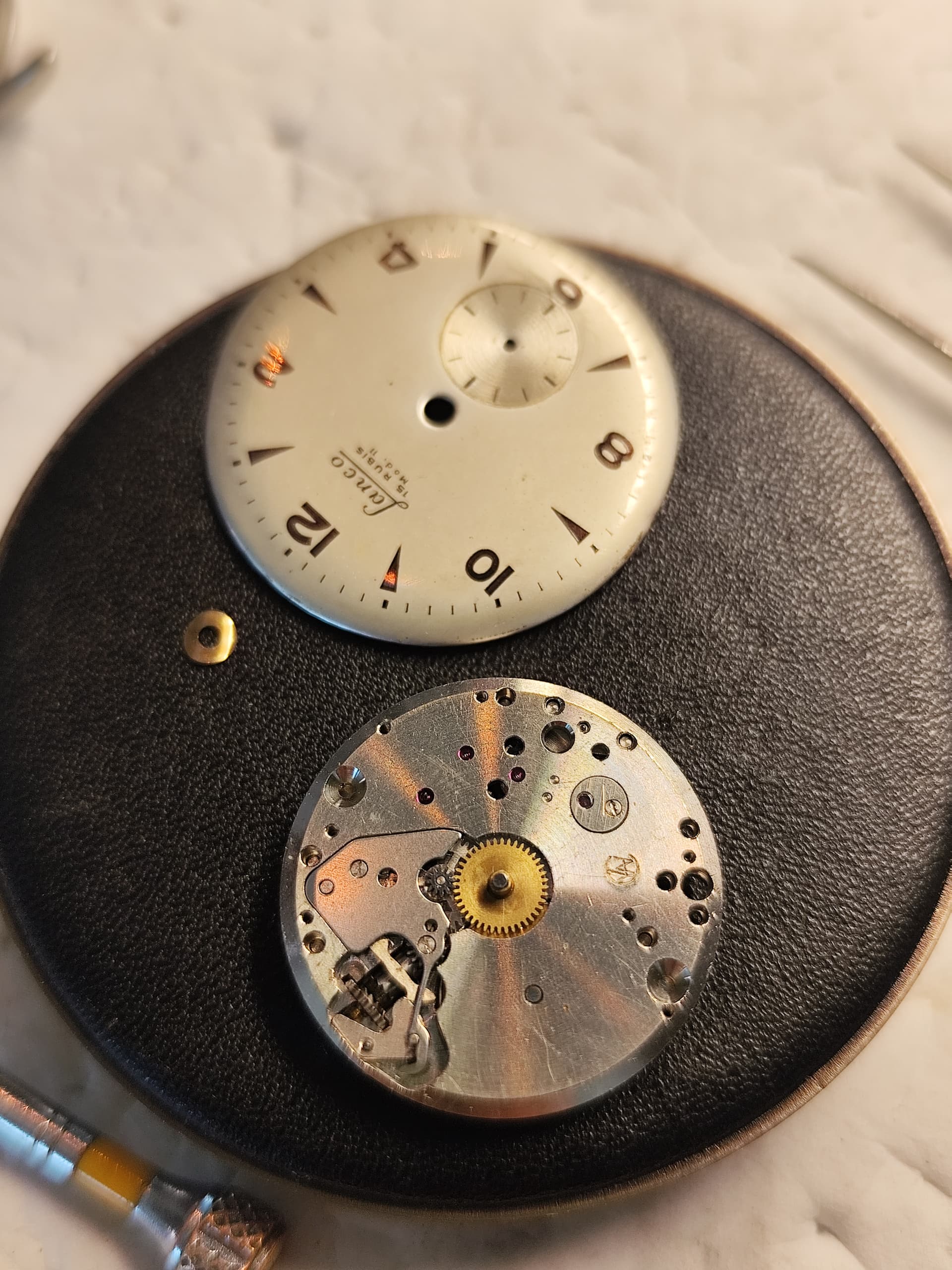 Dat zie je inderdaad vaker bij oudere wijzerplaten. Bij veel horloges werd eerst de wijzerplaat bedrukt met de uurmarkeringen en daarna pas het subsecond register in de plaat geperst en bedrukt. Daardoor blijft de oorspronkelijke 6-uur markering soms gedeeltelijk zichtbaar in het kleine seconden-dial. Het is dus meestal geen latere aanpassing maar gewoon een gevolg van de productiemethode van de wijzerplaat.
