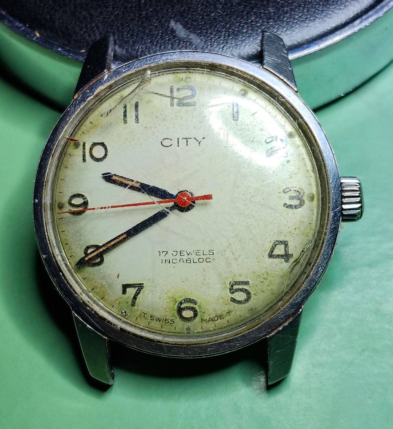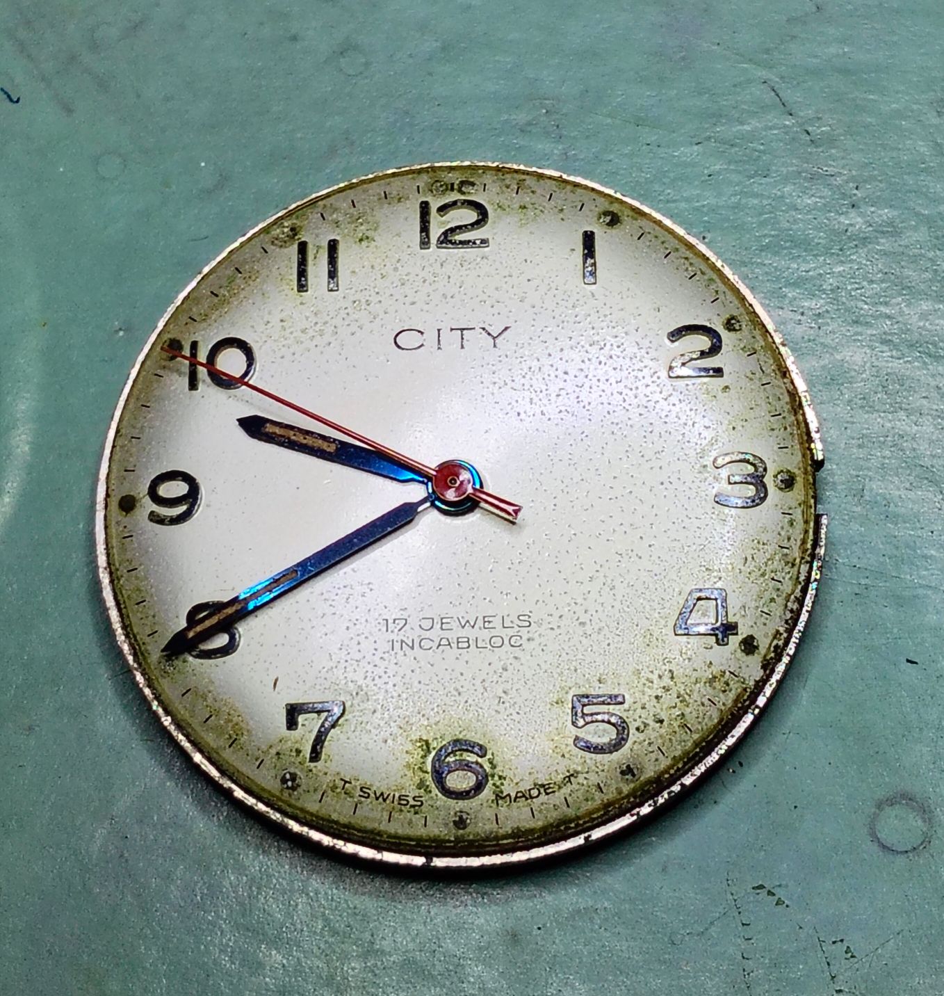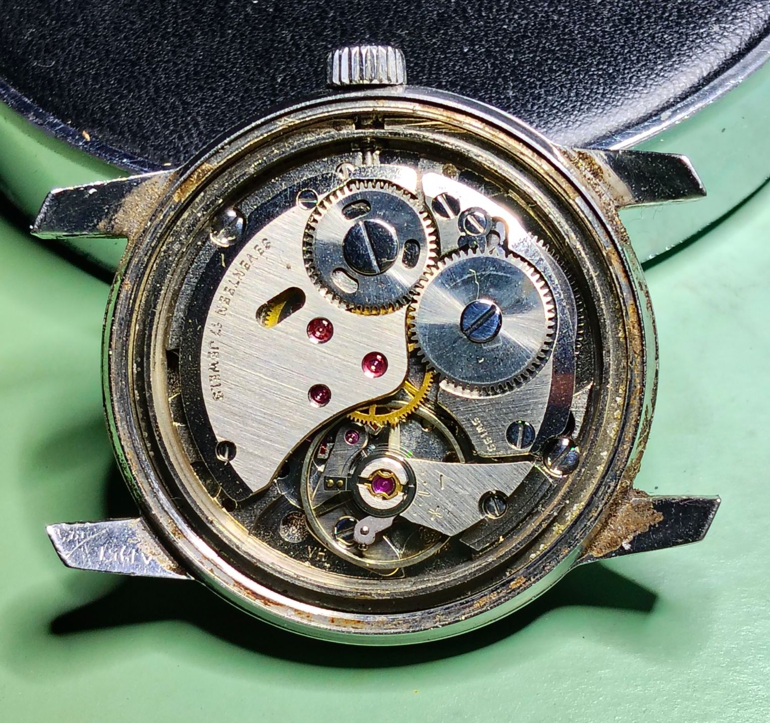 Dat zie je inderdaad vaker bij oudere wijzerplaten. Bij veel horloges werd eerst de wijzerplaat bedrukt met de uurmarkeringen en daarna pas het subsecond register in de plaat geperst en bedrukt. Daardoor blijft de oorspronkelijke 6-uur markering soms gedeeltelijk zichtbaar in het kleine seconden-dial. Het is dus meestal geen latere aanpassing maar gewoon een gevolg van de productiemethode van de wijzerplaat.