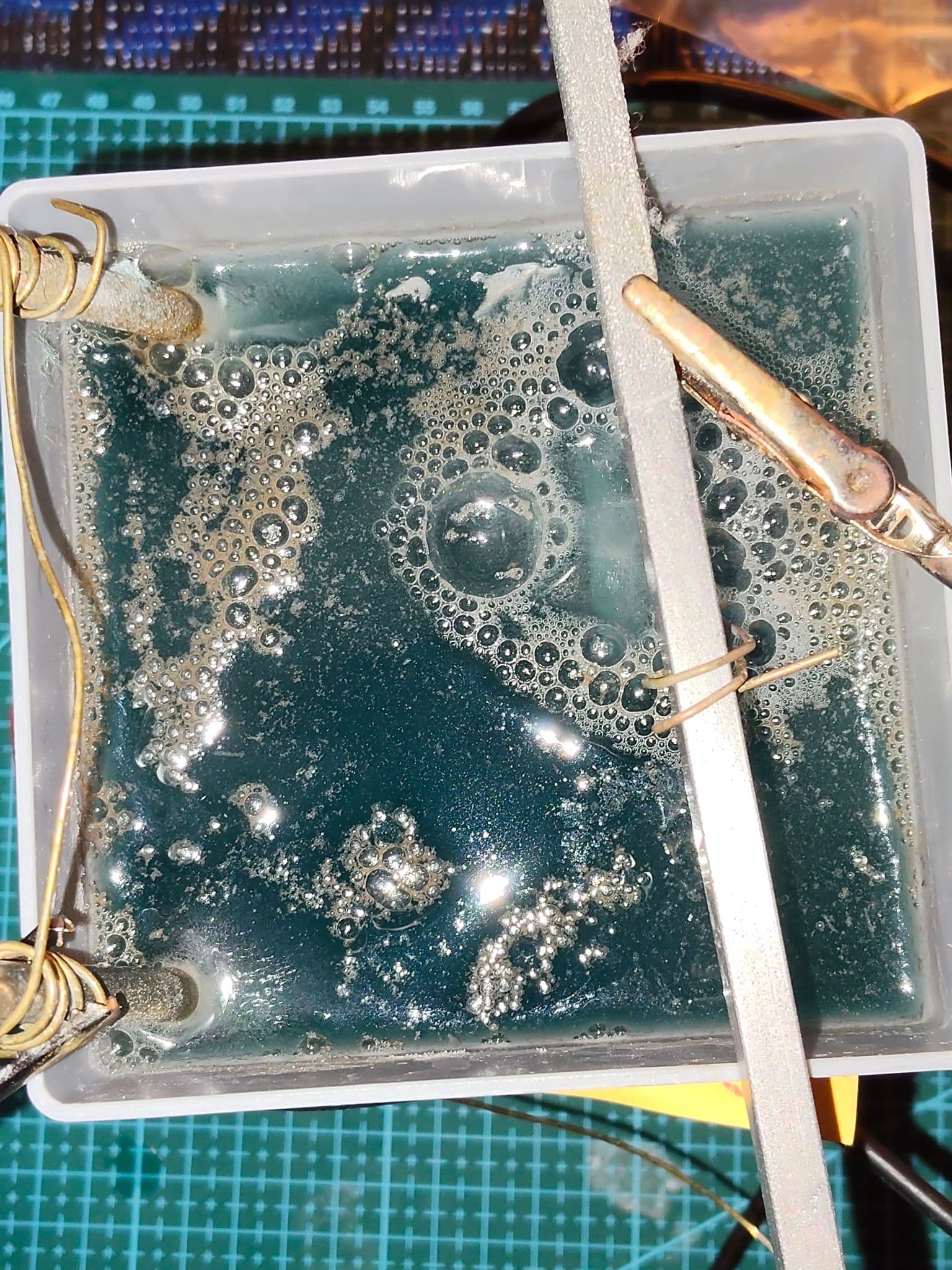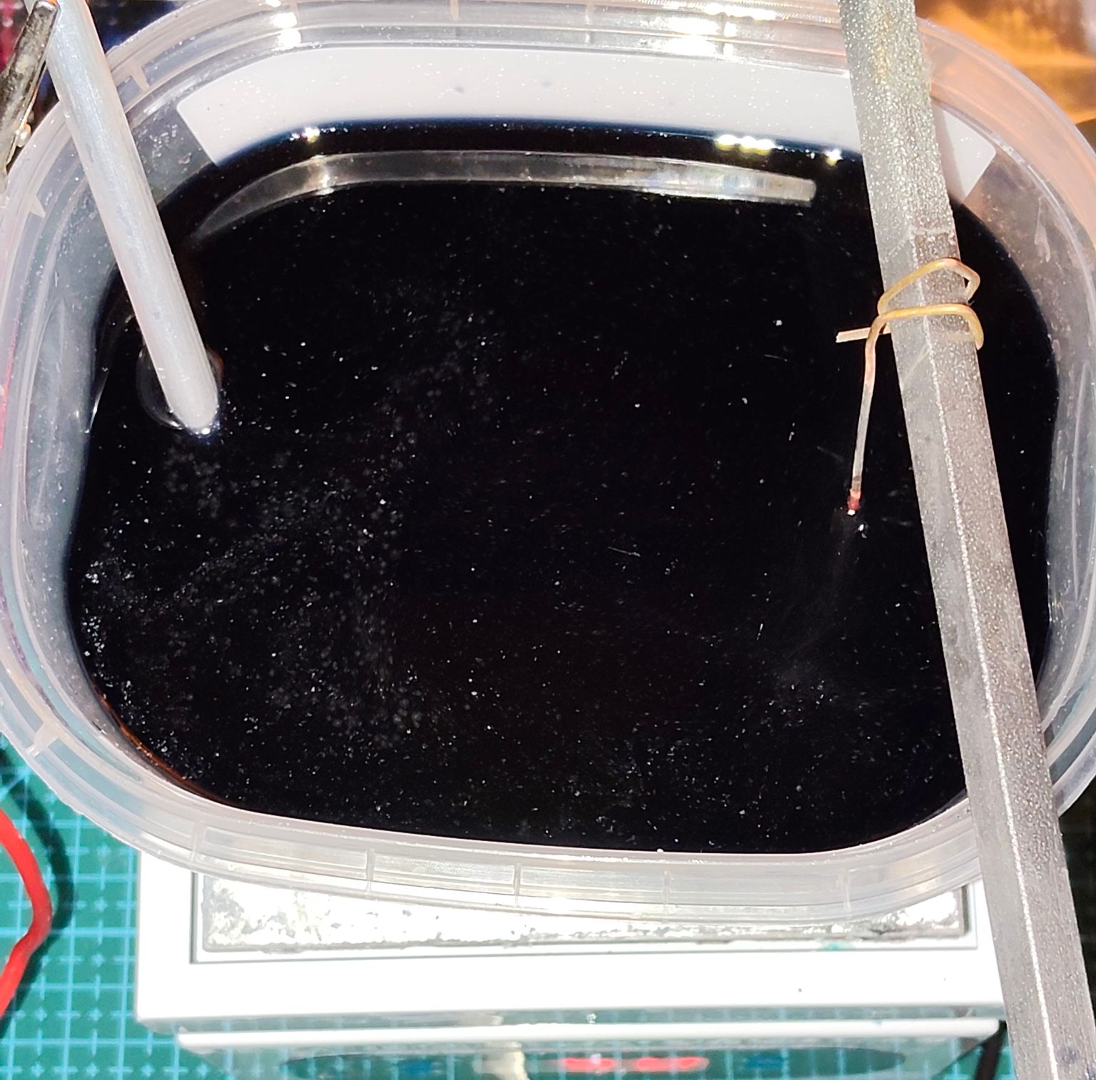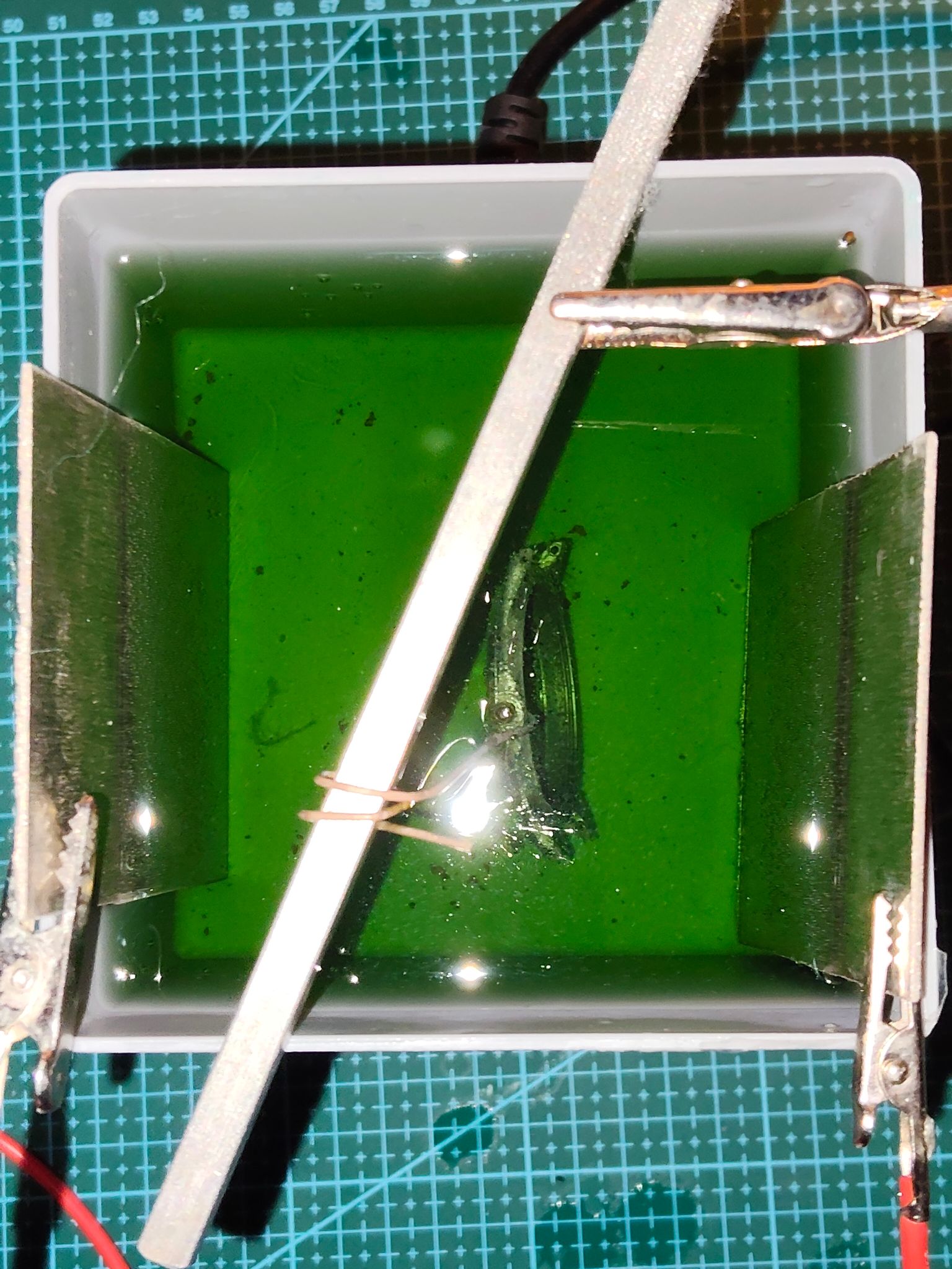 Ik heb het nogmaals herhaald, dus een stuk of vijf koperlagen zitten er nu op. Ik laat het hierbij en ga nu het nikkelbad op temperatuur brengen.