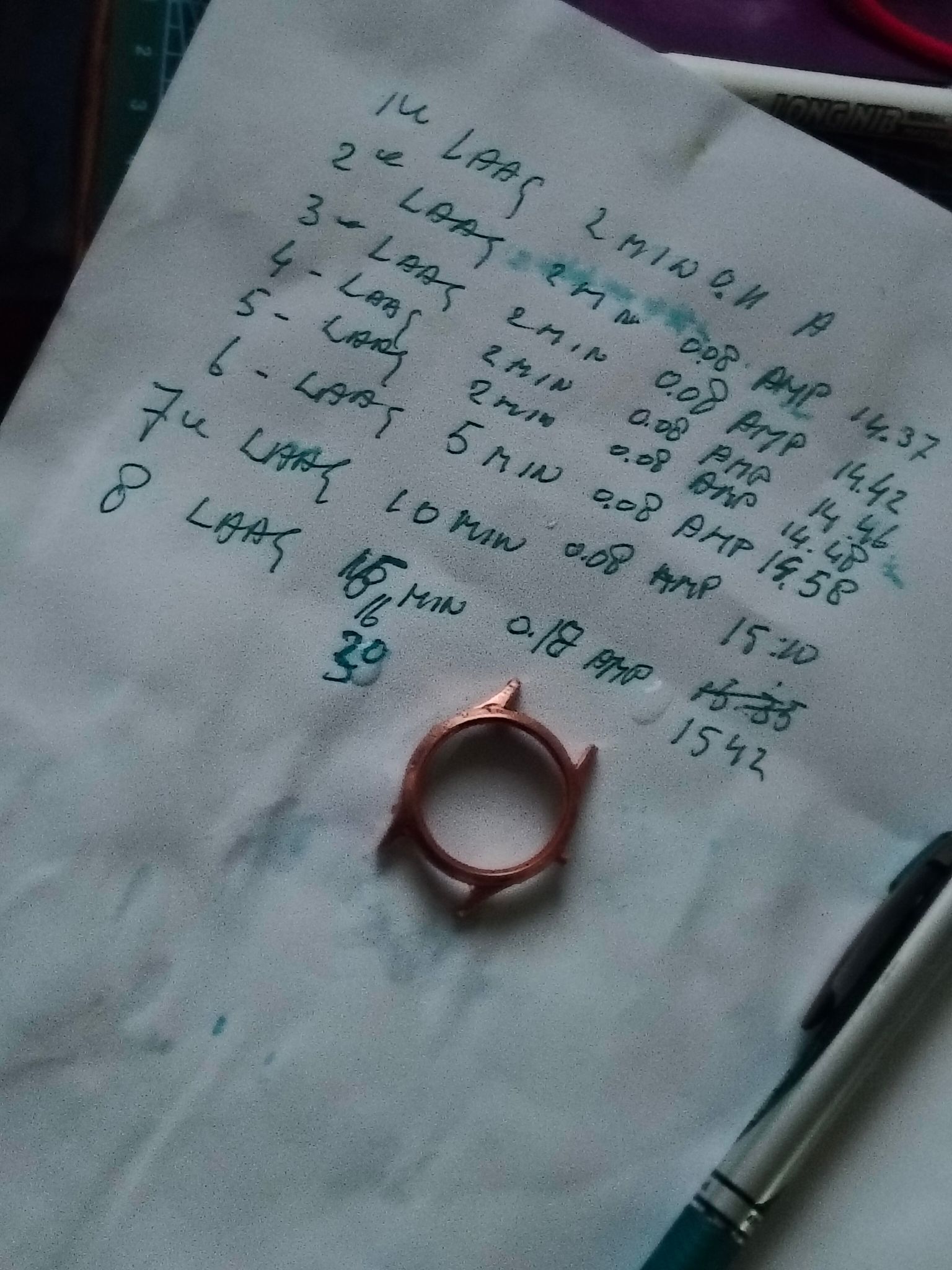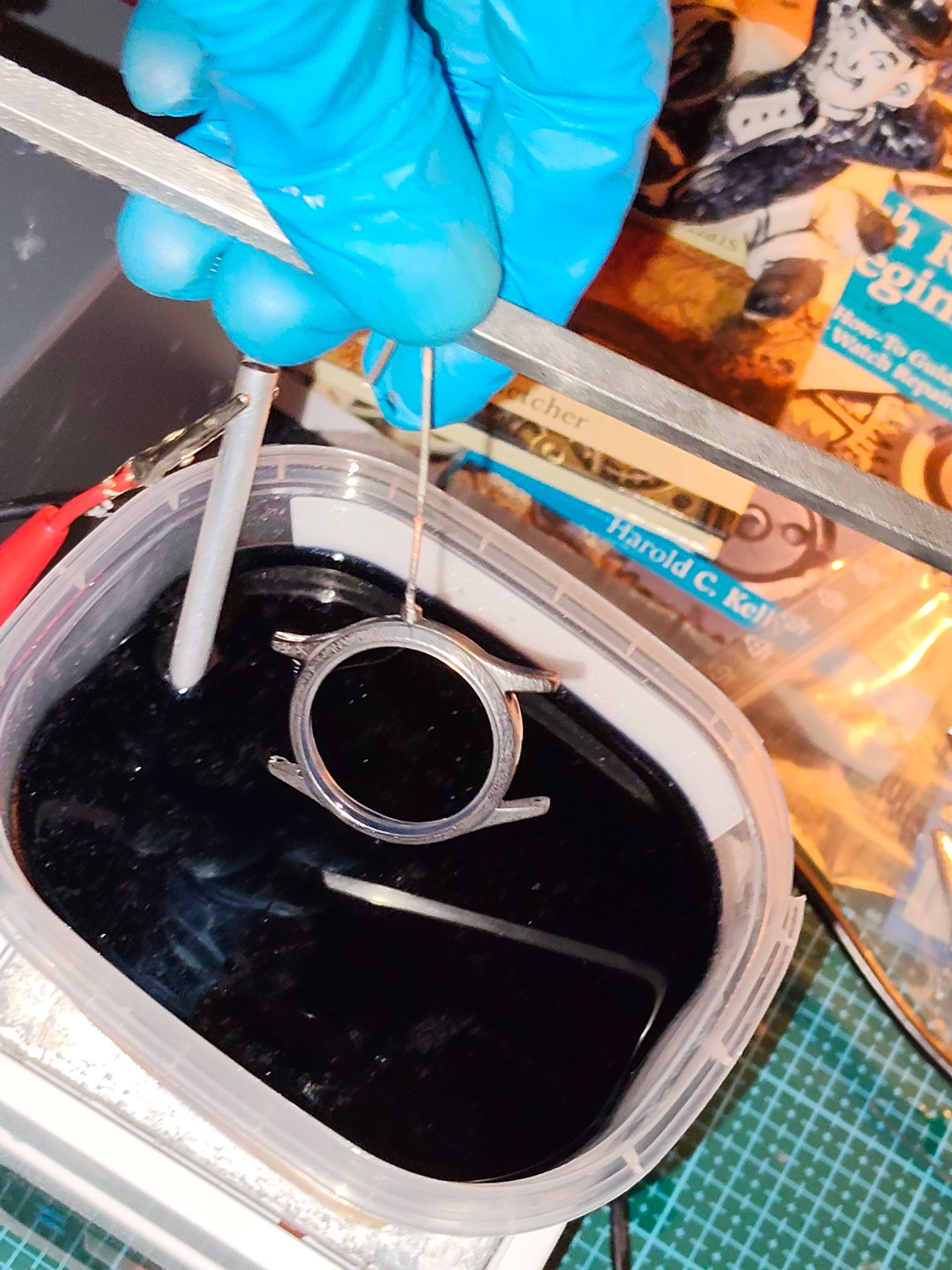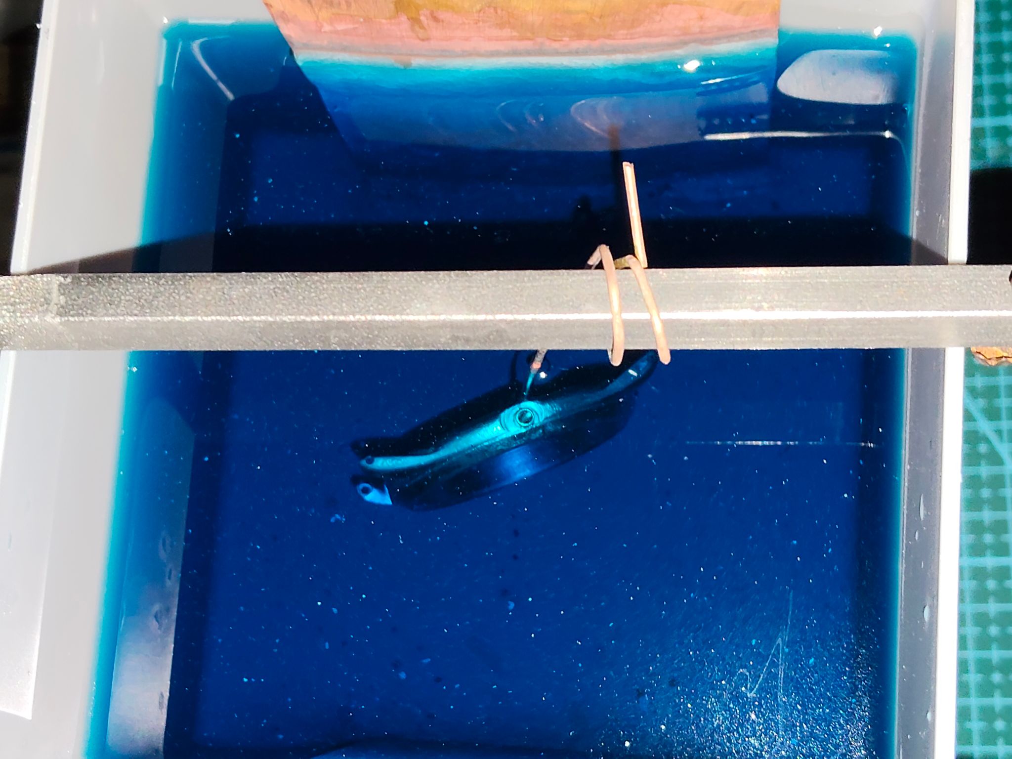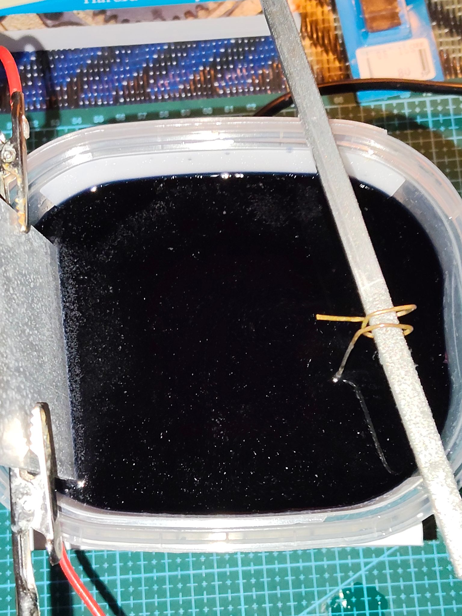 Ik heb het nogmaals herhaald, dus een stuk of vijf koperlagen zitten er nu op. Ik laat het hierbij en ga nu het nikkelbad op temperatuur brengen.