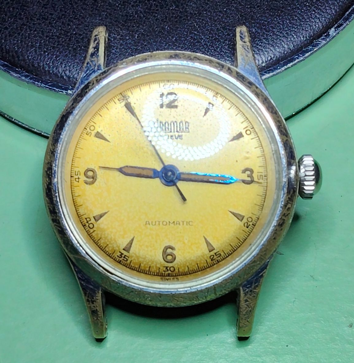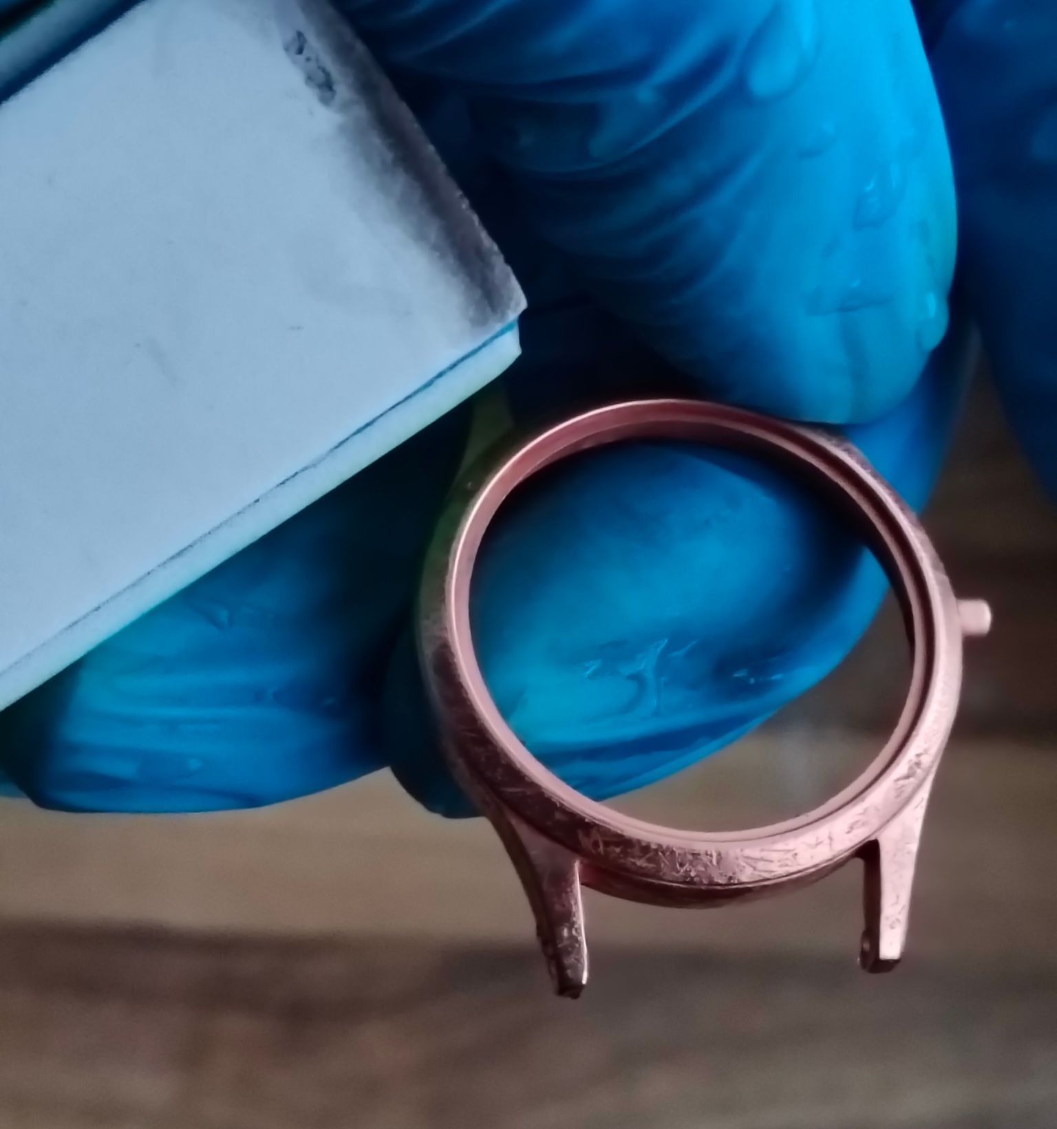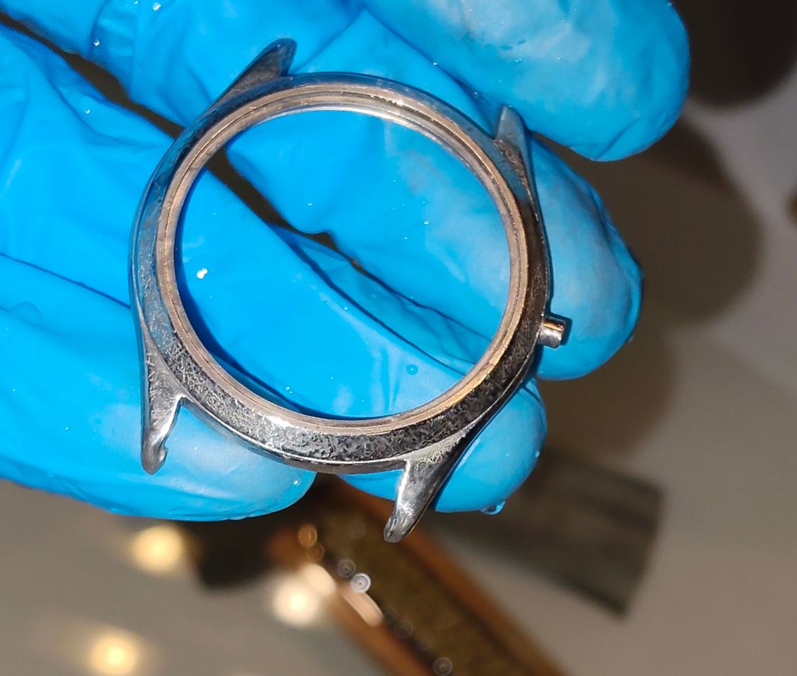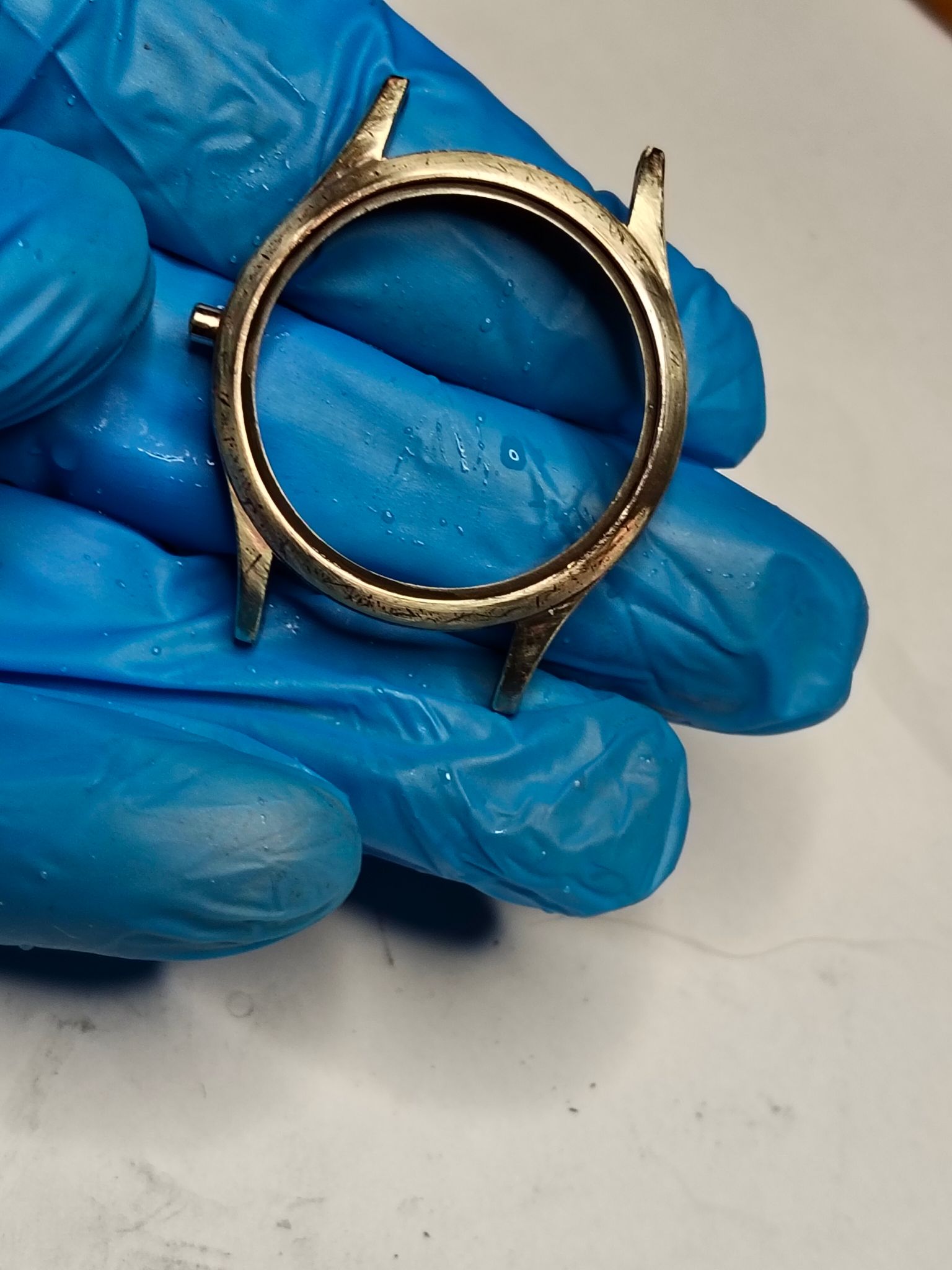 Bij deze Miramar wil ik het zo goed mogelijk doen, misschien wel 10 lagen koper. Ik wil gewoon dat het goed opknapt. Het is een mooi horloge, alleen de kast is volledig versleten; daar ga ik morgen iets aan doen.