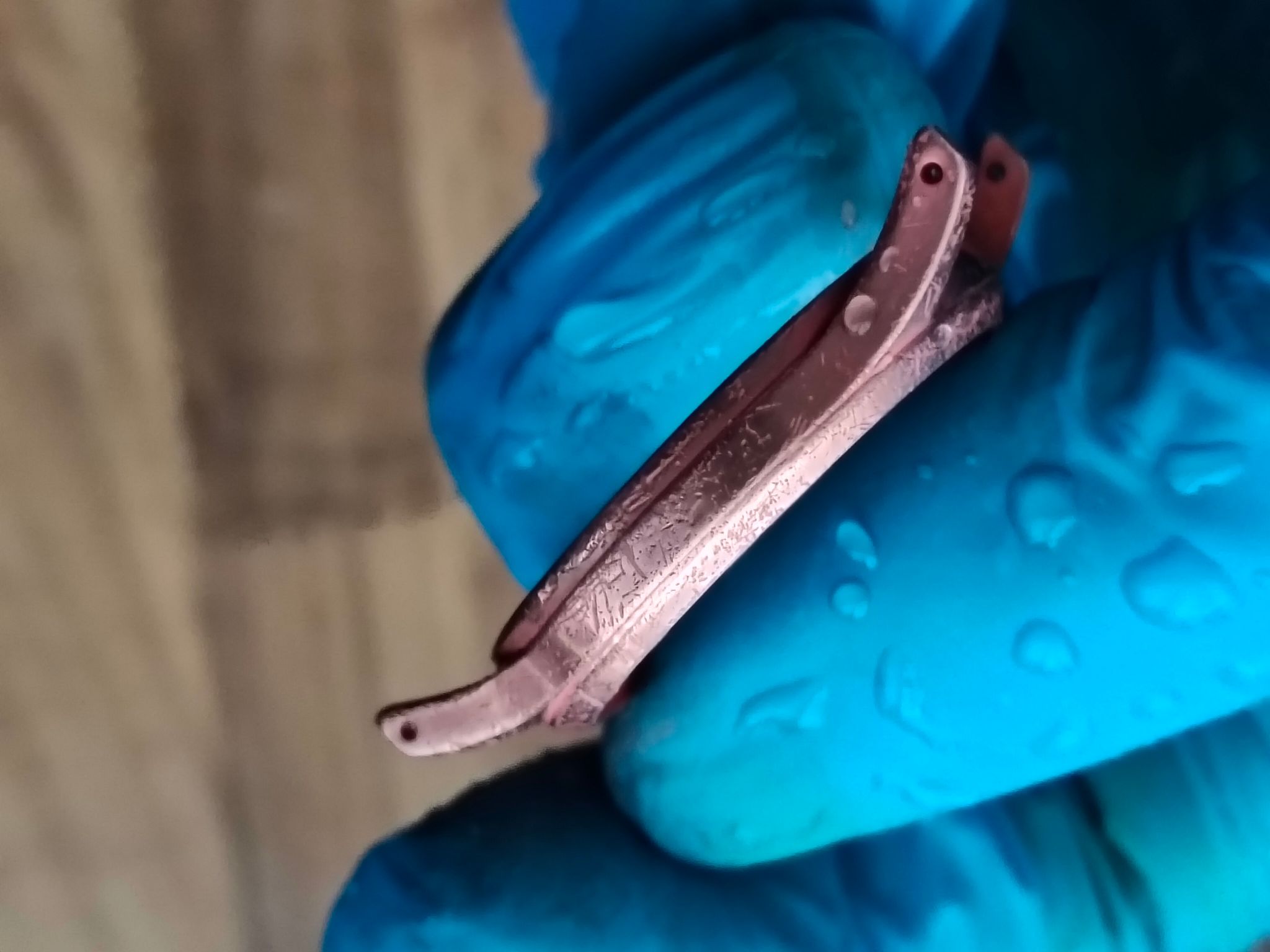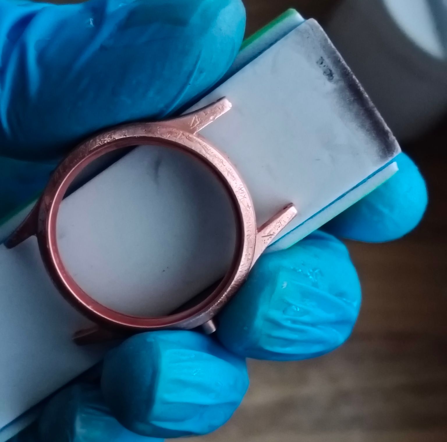 Ik heb dus eerst de nieuwe chroomlaag eraf gestript, daarna heb ik met een fantastisch schuurblokje van Ali de koperlaag eraf geschuurd. Ik zit nu op de oude nikkellaag; daar heb ik nu wel wat krassen uit kunnen halen, met 600 korrel, 3000 korrel zet geen zoden aan de dijk, is te fijn voor dieppe krassen.