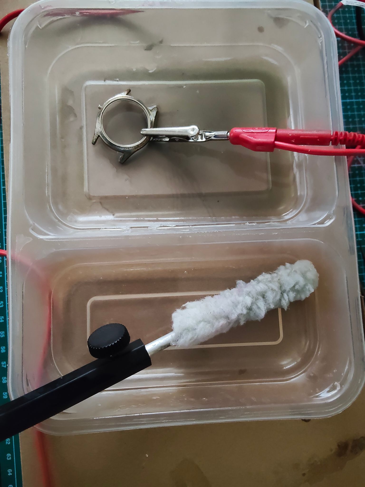 De eerste hechtlaag zit erop. De eerste laag moet op een lage ampère gebeuren; ik heb hier 0.08 A gebruikt. De dompeltijd is heel kort, ongeveer 1 minuut.