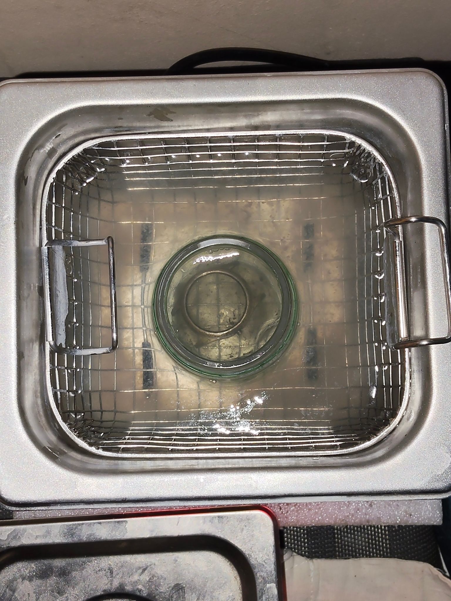 Nu drie minuten in de ultrasoon en goed schoon schrobben in lauw gedestilleerd water en nu ga ik een happie eten.