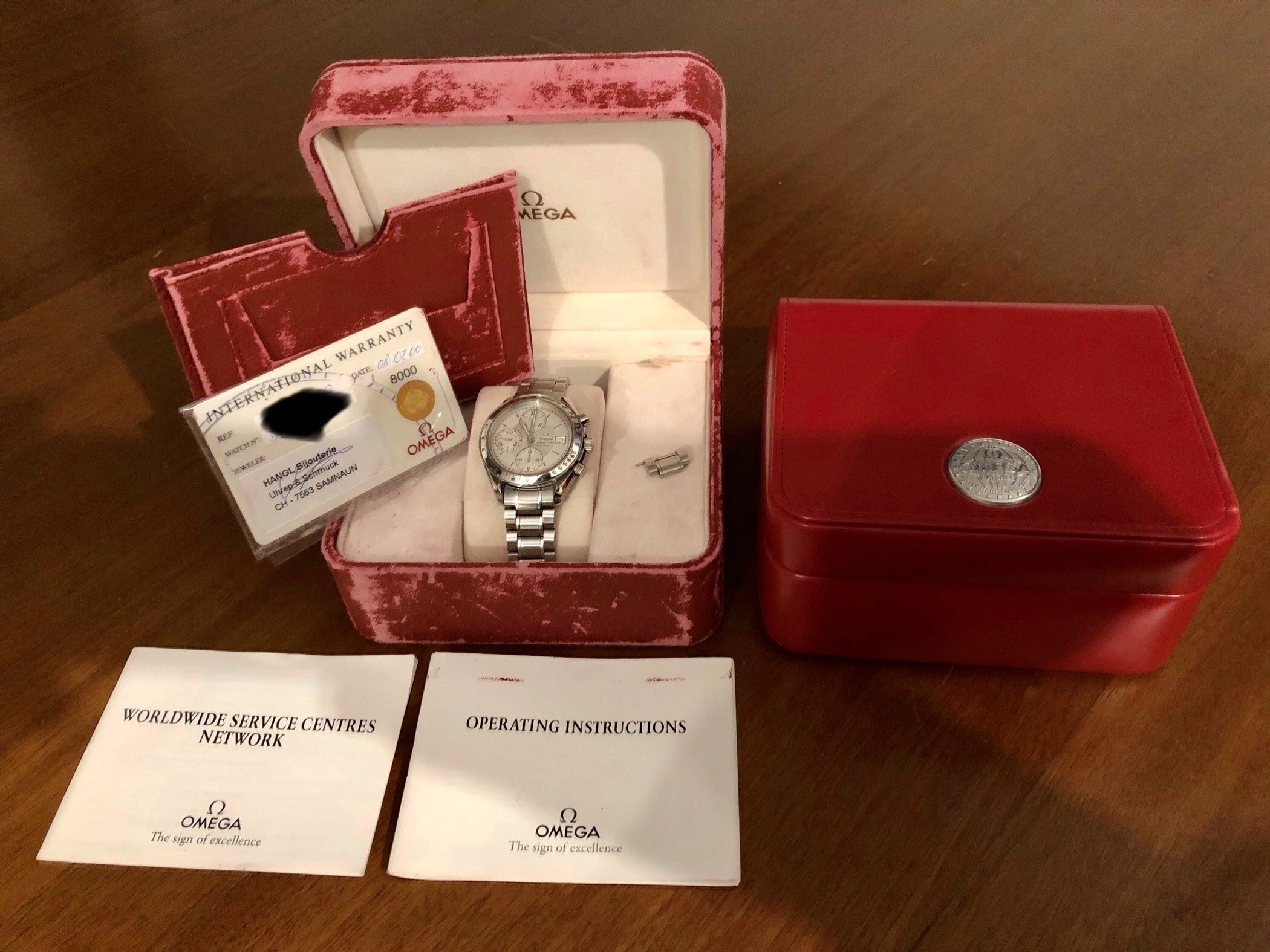 Bij mijn Speedmaster Date Silver (uit 2000) zat alles bij, alleen mijn box ziet er niet zo nieuw uit, het kan misschien zijn dat de box op Chrono24 een nieuw(er) exemplaar is. Bij mij zit zelfs de originele factuur uit Zwitserland, waar hij oorspronkelijk is gekocht nog bij!