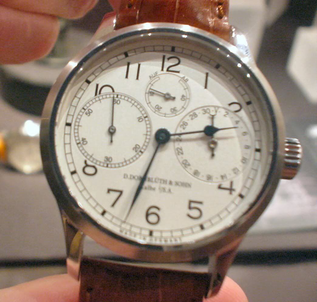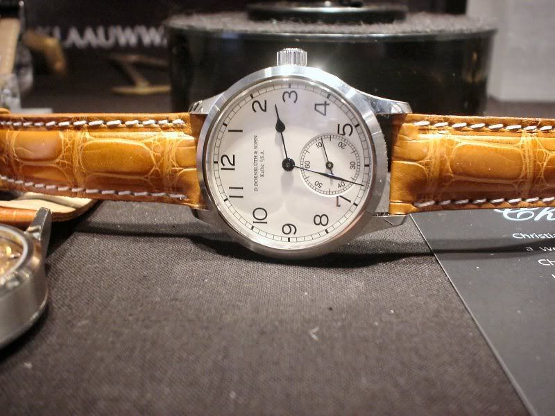 Aangezien de firma Dornblüth geen eigen stand op de beurs had (er worden belachelijke prijzen voor een stand gevraagd) hadden ze een koffer mee met hun modellen. Een mooi groot holroge met witte wijzerplaat tevoorschijn gehaald, en uitgebreid bewonderd door iedereen op de stand. We konden de horloges niet al te lang bekijken, want de beursorganisatoren schijnen nogal streng op te treden in zulke gevallen.