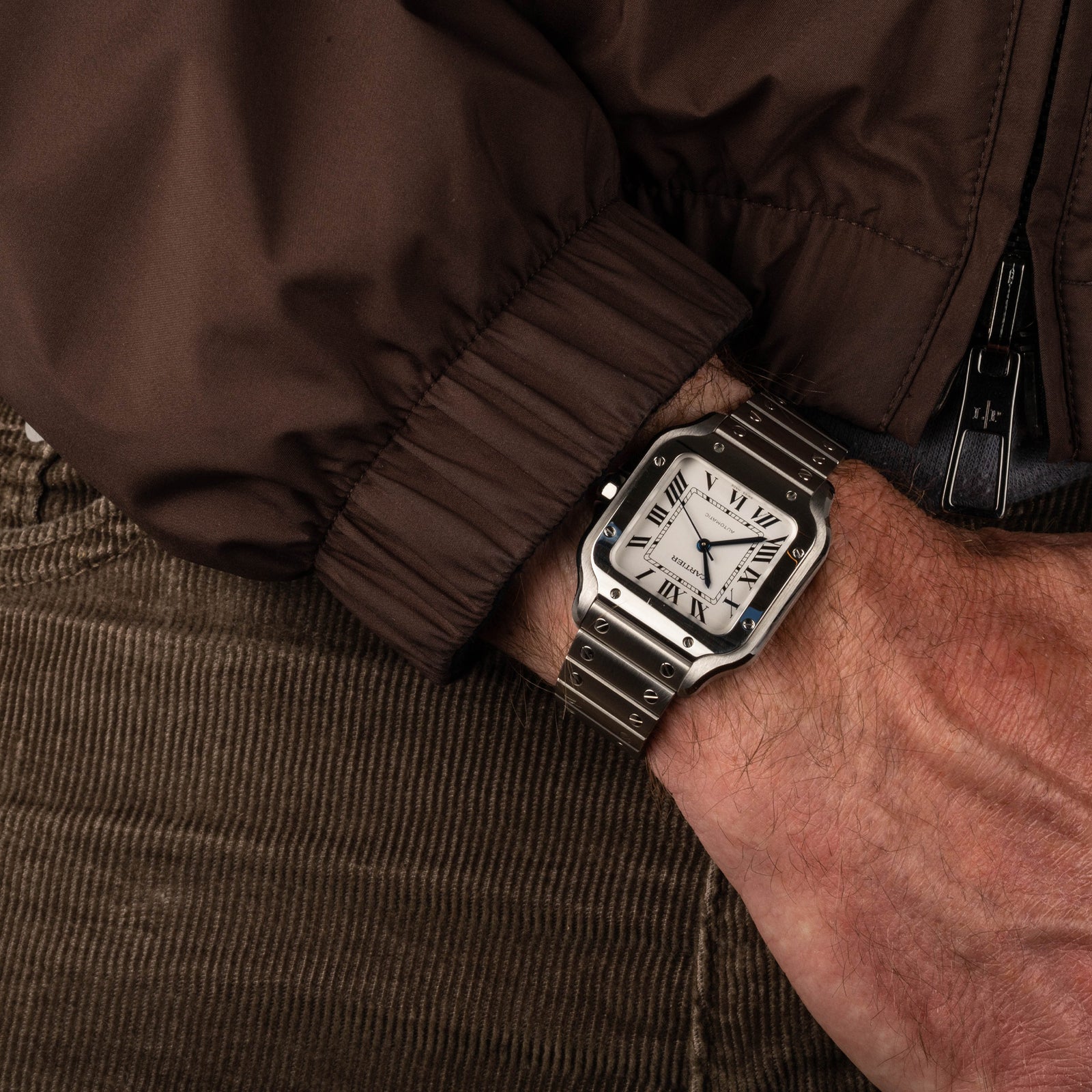 Die Santos is echt zo gek nog niet. Na verloop van tijd, krijgt die bezel veel haarlijntjes, waardoor het een doffer creëert. Dan veranderd die van een opzichtige glimmer, naar een subtieler veelzijdig horloge.