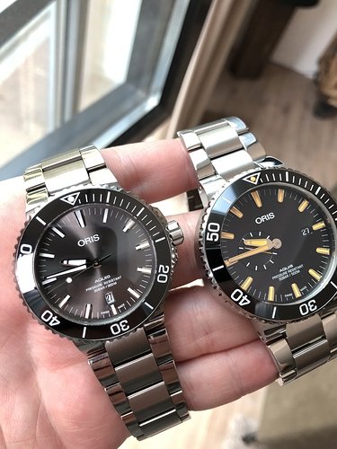 De linkse van deze twee is de Oris Aquis titanium date, prettig formaat en door het titanium ontzettend licht van gewicht!