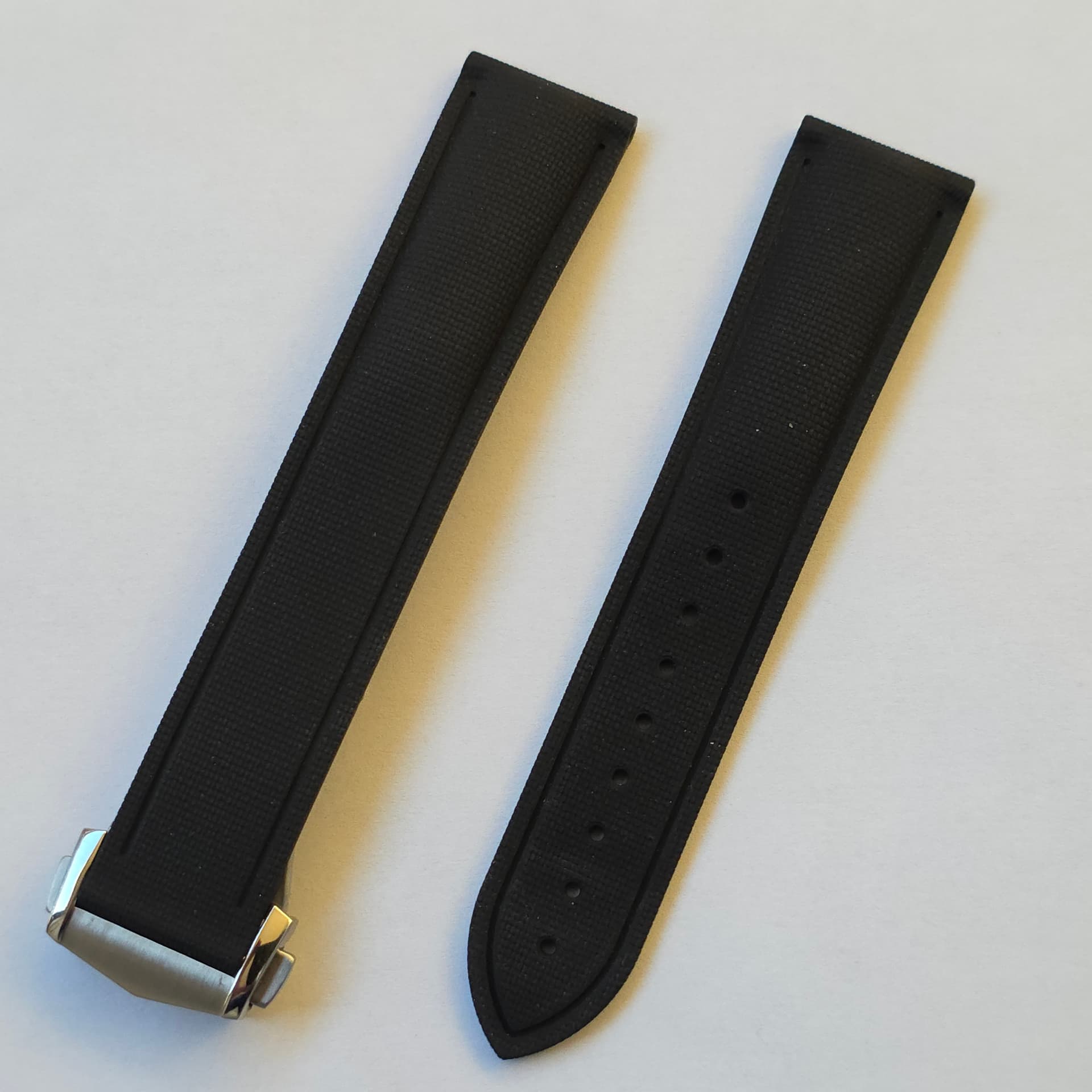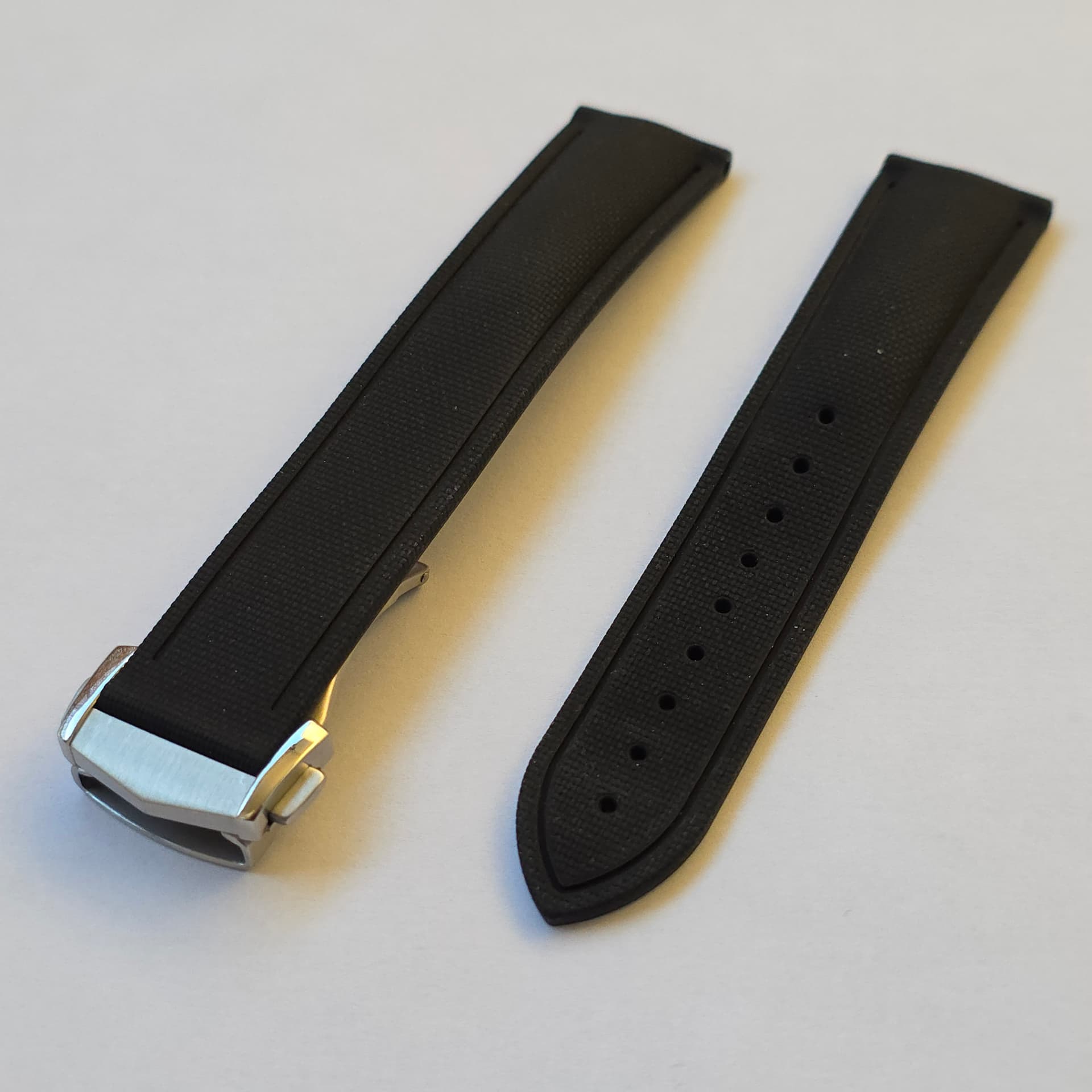 Met Omega imitatie vouwsluiting & quick release spring bars, 20mm tapered naar 18mm.