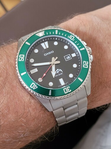 En mijn Kermit Duro met Ali RVS heeft echt wel een leuke uitstraling! Ziet er niet goedkoop uit vind ik. Schroefkroon en 200m WR.
