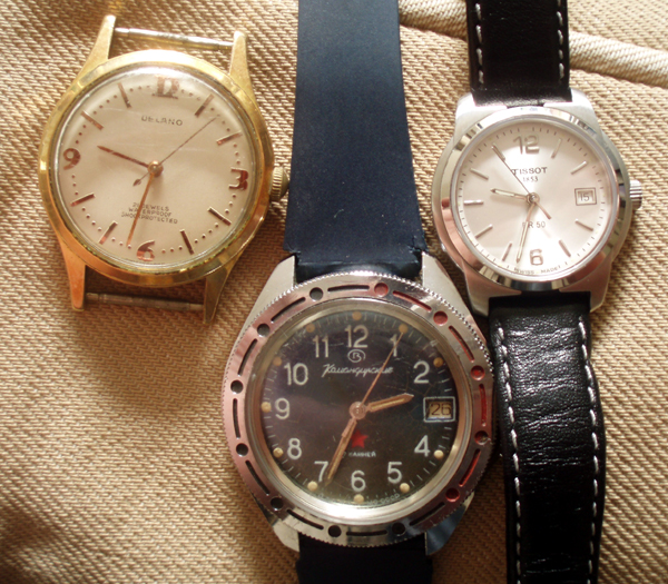 Jullie hebben dan toch echt je best niet gedaan hoor, als ik hiermee win. Een goed lopende “Delano” voor 1 euro die nog best aardig in z’n vergulding zit en een erg leuk uurwerk heeft (weet nog niet welke, kon het niet lezen maar het ziet er mooi uit). Een Tissot PR 50. Voor mijn vrouw dacht ik, die 'm echter niet hebben. Maar voor een euro…? En dan een russische duiker. In niet zo goede staat maar ik vond het interessant omdat de kroon geschroefd is en het er heel degelijk uitziet. En voor 2 euro dus tja.