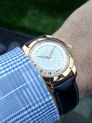 Mooi inderdaad! Maar wel verwarrend. Ik kan niet zo goed tegen die 12/24 combi heb ik gemerkt. Dus de gewone wijzers lees je af op de buitenste 12 uur schaal. En de stedencirkel op de binnenste 24 uur schaal. Voor als je de tijd hebt om daar goed naar te kijken!