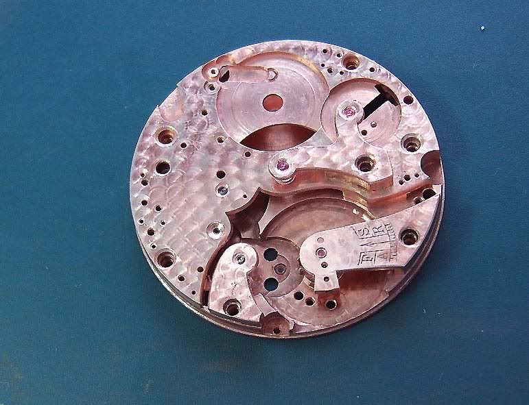 het werk valt op zich wel mee hoor, de as van de resethevel (hammer) was afgebroken bij de demontage, dus het restant daarvan moest verwijderd worden met Bergeon Vissin vloeistof, daarvoor moest de brug sowieso al helemaal kaal gemaakt worden, gaf meteen mooi de gelegenheid om alle bruggen en platine helemaal aan te pakken en te verkoperen