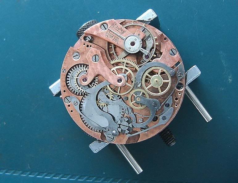 (tu) is zeker een hele mooie oude chrono, het uurwerk is een Landeron Hahn 15,5 lijns kaliber, Landeron 2 of afgeleid kaliber (werden meestal als ebauche gekocht, detailverschillen met fabrieks plaatjes komen vaak voor)