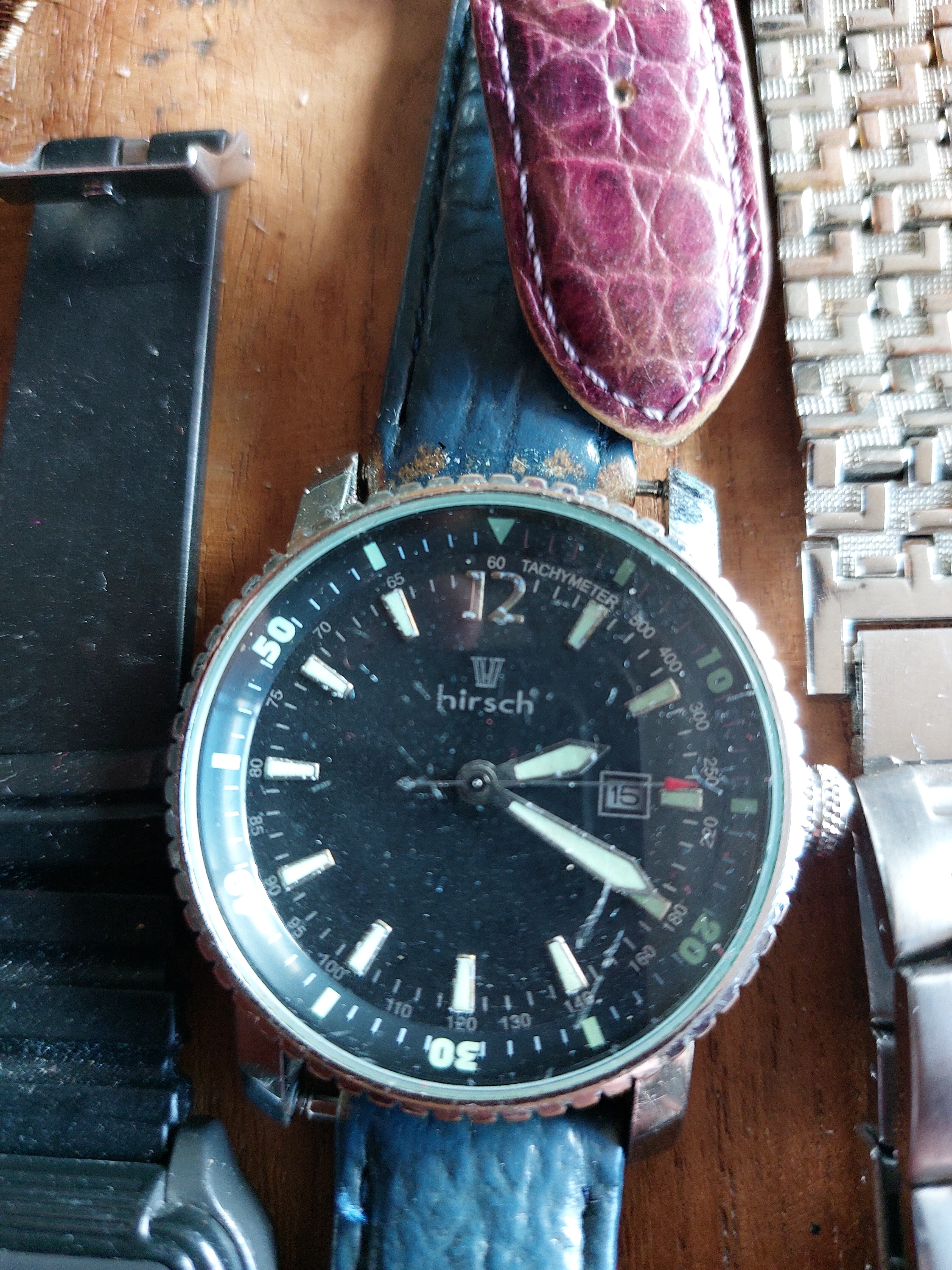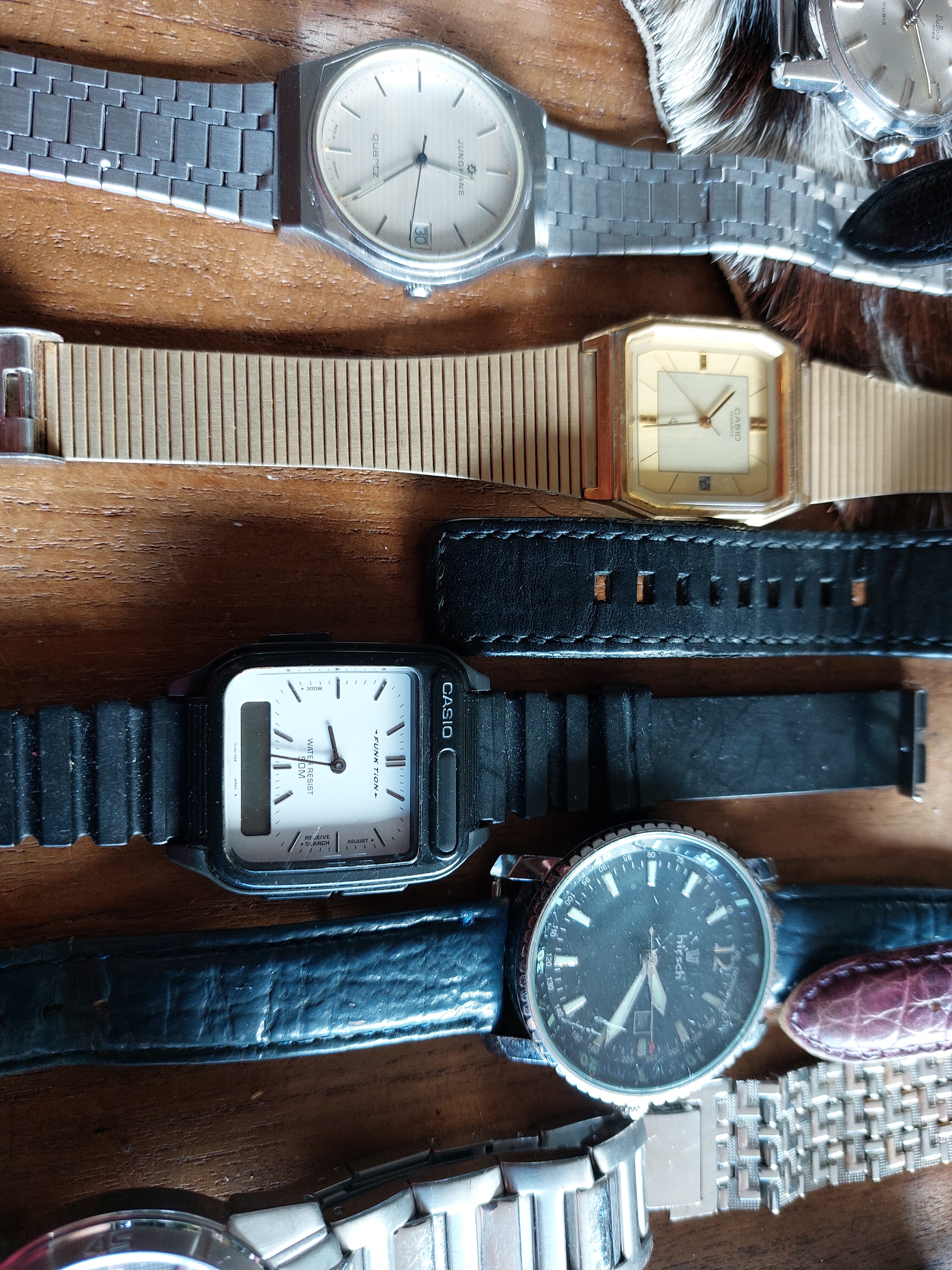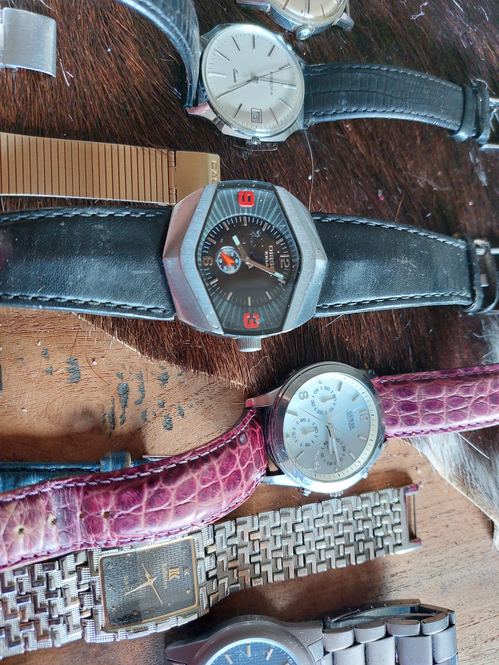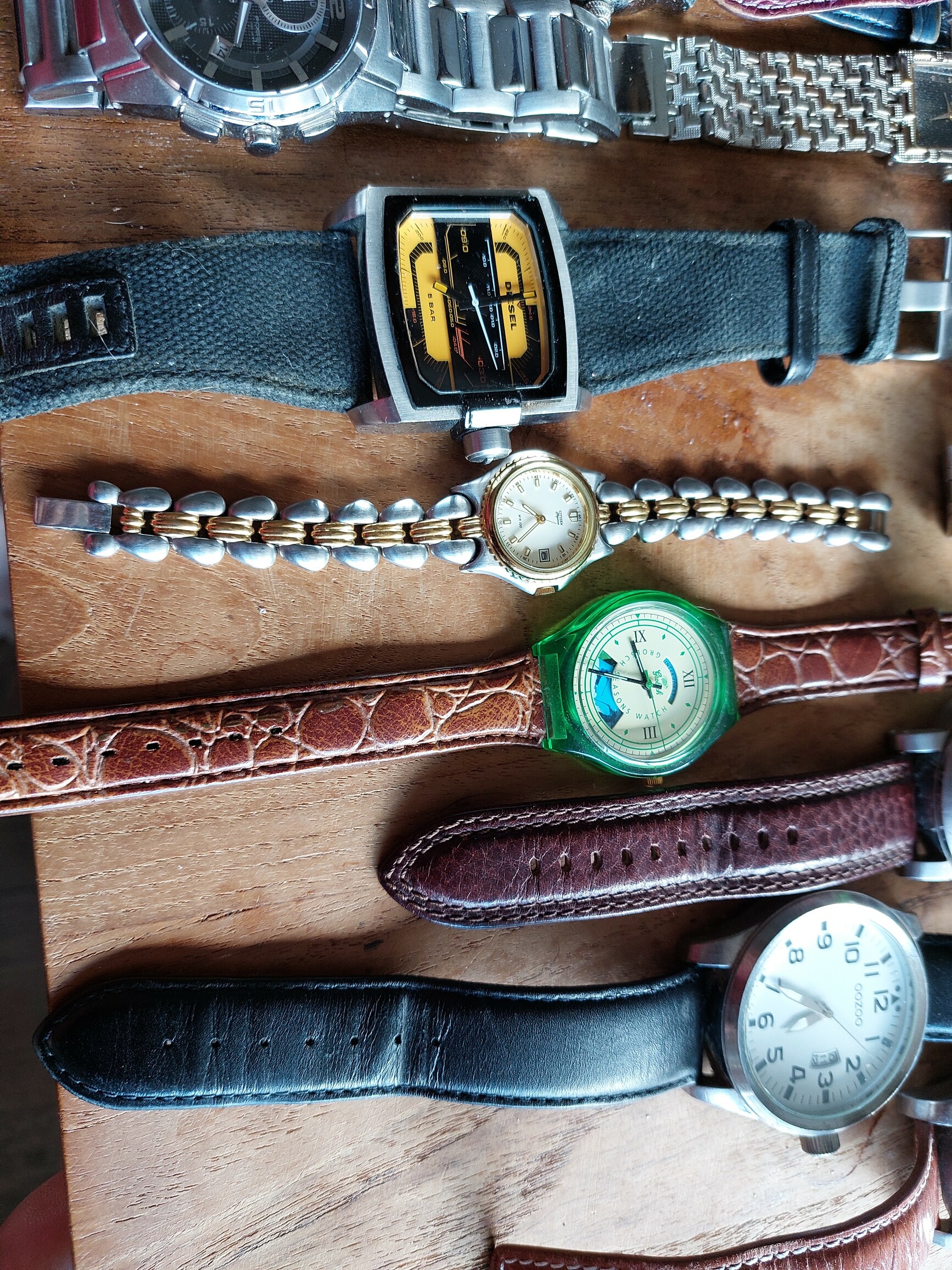 Zo als te zien ozoo, swis armband en een paar onbekende een grols horloge en een met een vleermuis er op geen idee wat dat is.