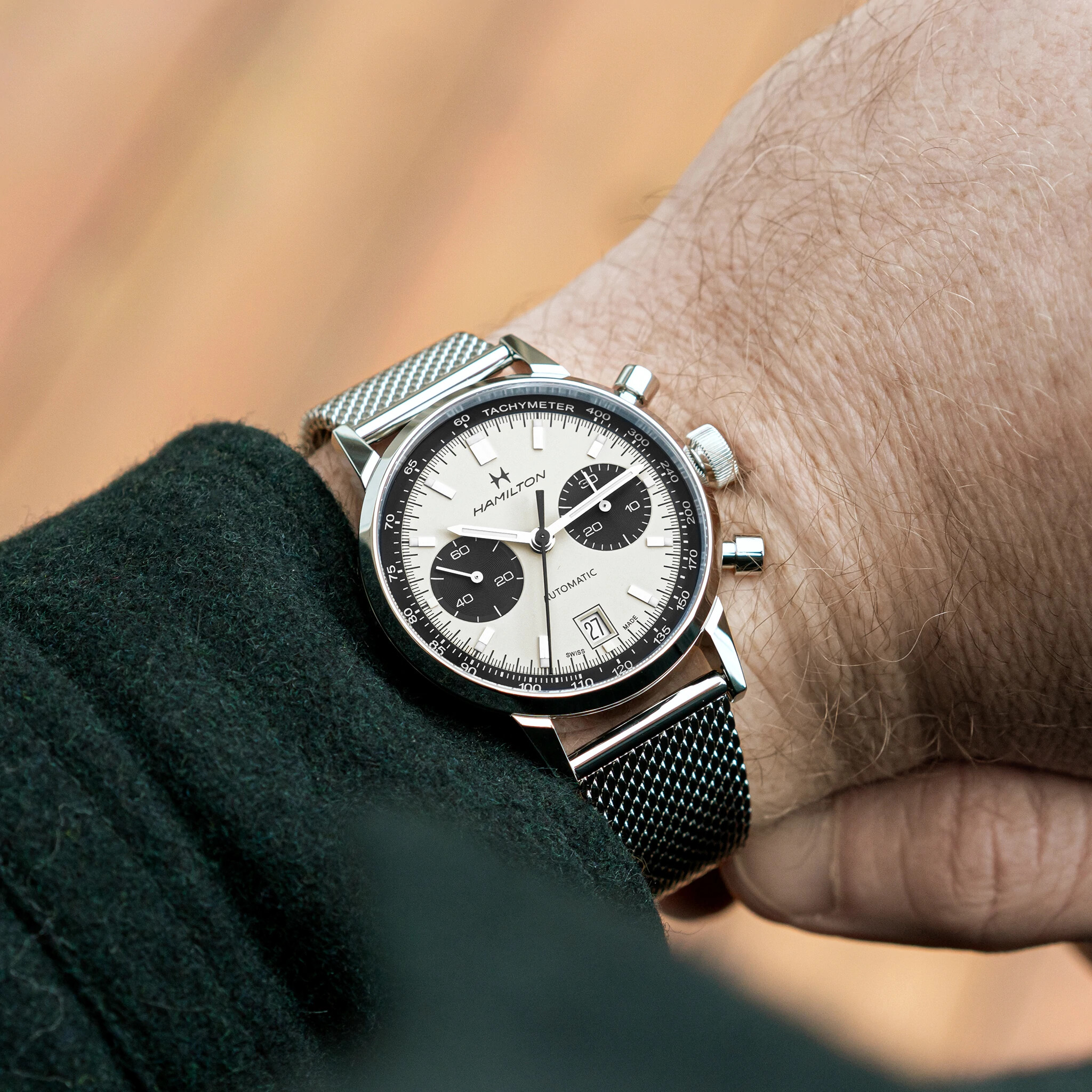 Aangezien de Oris Aquis, mijn favoriete horloge in deze pricerange al in mijn bezit is zou mijn keuze uitgaan naar de Hamilton Intra-Matic Auto Chrono. De panda versie is prachtig maar ook de reverse panda of blauwe uitvoering kunnen mij bekoren. De chronos staan goed op verschillende soorten leren banden maar ook op de hierboven afgebeelde mesh band van Hamilton.