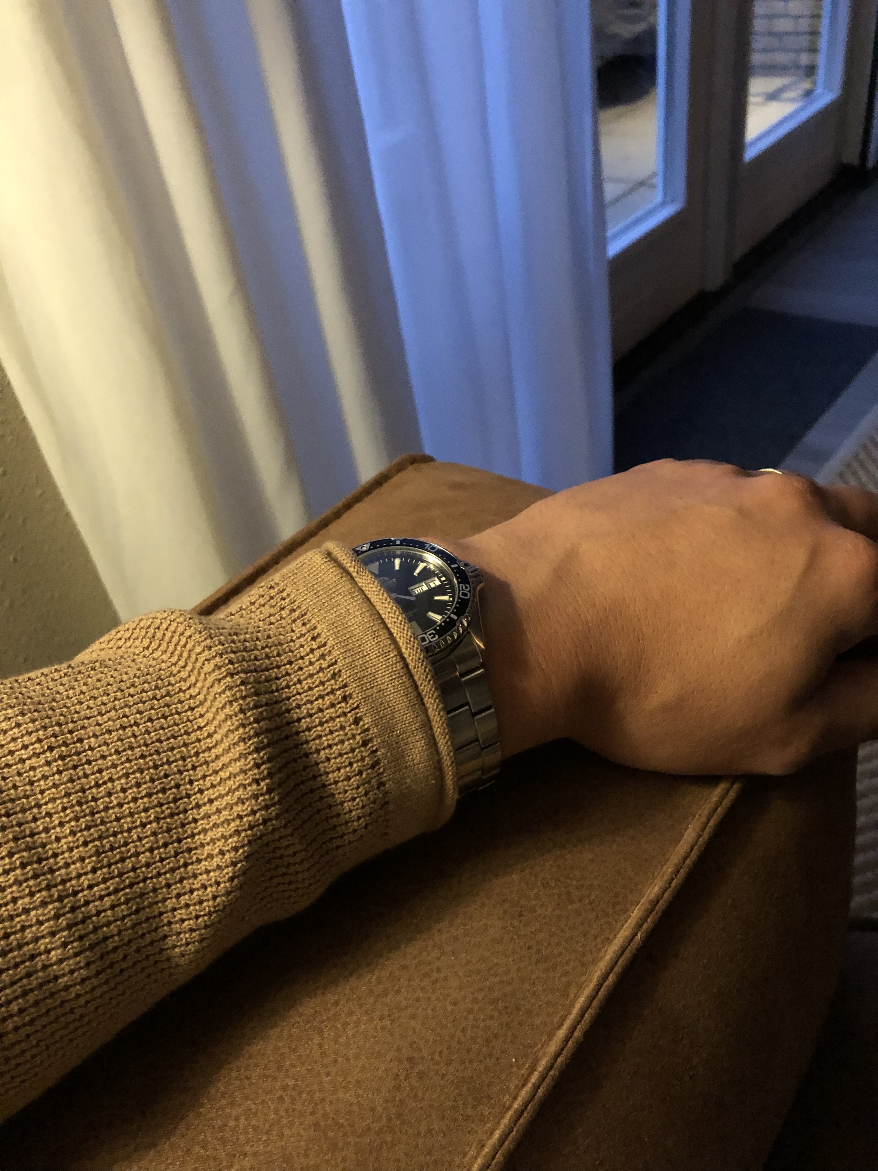 Ligt er gewoon aan wat voor kleding ik draag en hoe het valt. Mouw valt er zelf achter, overheen of erop. Soms mouw omhoog bij bepaalde casual overshirts, zoals vandaag