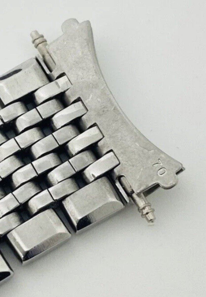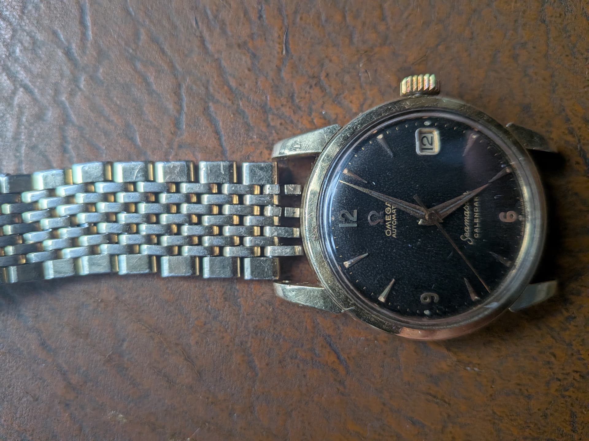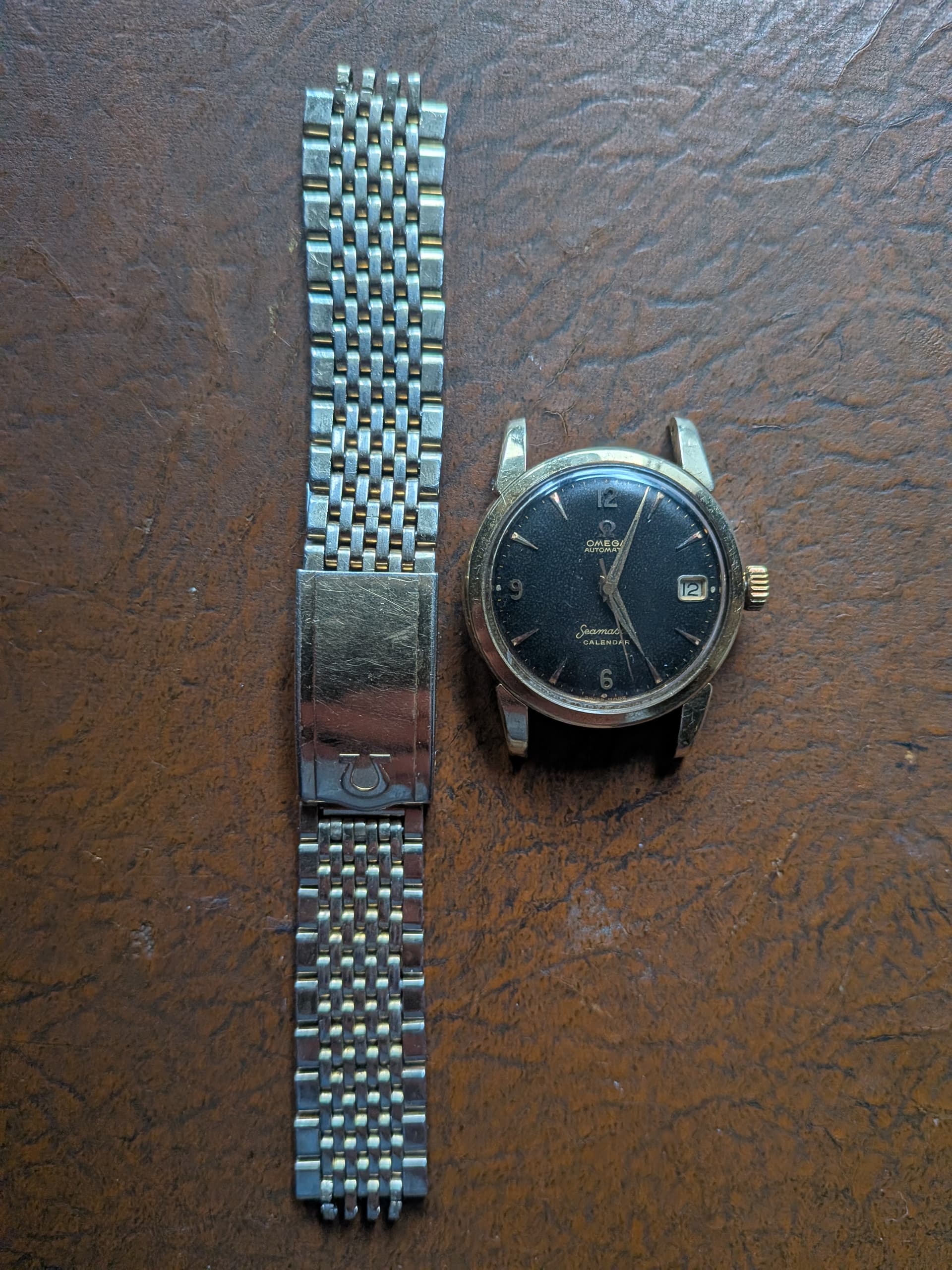 Ik ben relatief nieuw hier op het forum dus ik hoop dat ik het zo goed doe. Zo niet, verwijder het topic gerust! Ik heb een tijd geleden een vergulde Omega Seamaster Calendar gekocht uit het jaar 1953. Hij heeft een tijdje een leren band gehad, maar toch voelde een metalen band passender vond ik. Met wat hulp van een alleraardigst Forum medelid heb ik dan ook een redelijk correcte band weten aan te schaffen. Hij is er dan wel oorspronkelijk niet bij geleverd en iets later geproduceerd maar toch vind ik het een prachtige combinatie. Er deed zich alleen een probleem voor. De endlinks die bij de band zaten waren veels te smal en beschadigd. Nu was mijn vraag welk nummer ik precies nodig heb. De diameter bij de lugs is 18 milimeter. Mocht iemand deze geel-vergulde links hebben die passen hoor ik het natuurlijk graag. Alle informatie is welkom!