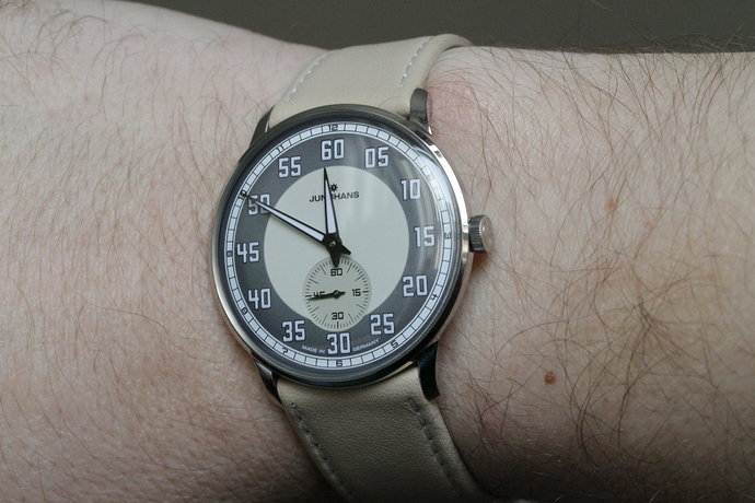 Dat is wel een moeilijker horloge om te combineren, zeker ook met banden. En als je huid te licht is, is die band ook te flets. Ik merk dat met mijn eigen Junghans Meister Driver: