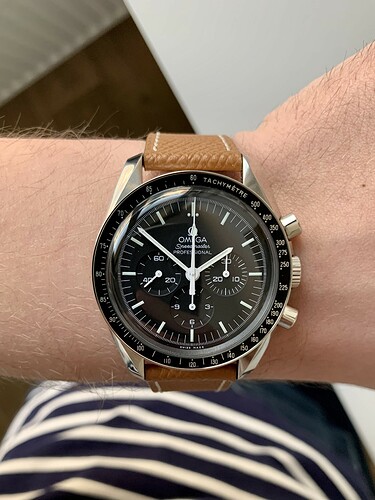 Draag hem nu eindelijk weer daarvoor regelmatig op tan kleur leer met originele Omega deployment clasp. Maar lag voornamelijk in de kast, de Omega nato is top.