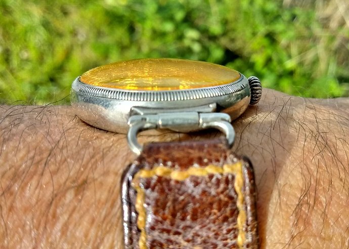 De wijzerplaat is puur wit email met Radium nummers en die radium is de oorzaak dat de celluloid vergeeld is (door de straling ) mooi leesvoer over dit toch bijzonder en uniek horloge lees je hier