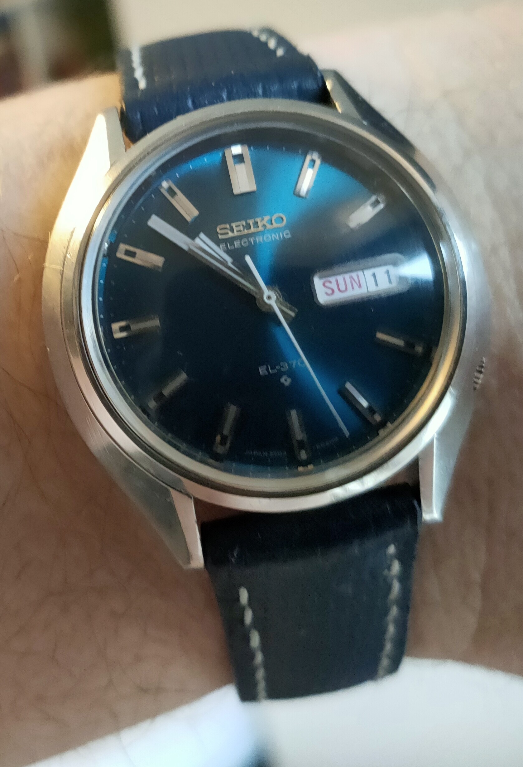 Vandaag een Seiko EL-370. Niet te geloven, dat ik deze gekocht heb, in de veronderstelling, dat het een zwarte wijzerplaat zou zijn (zo’n slechte foto’s…). En dat terwijl de wijzerplaat juist lichtblauw van kleur is. En door de montage van een nieuw glaasje is het nu een van mijn mooiste horloges geworden…