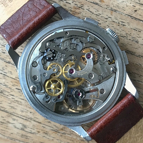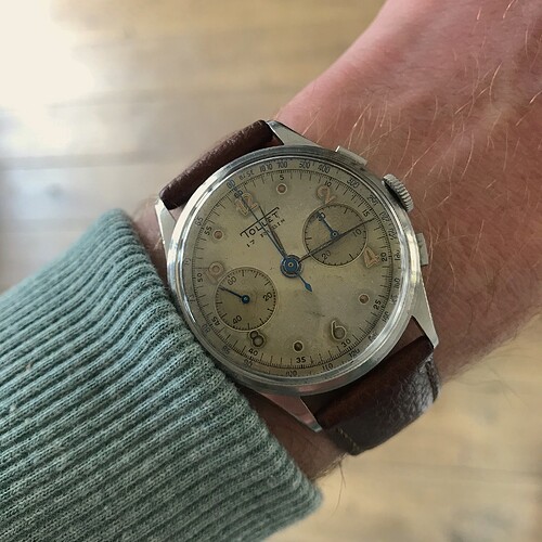 Mijn Tollet 37 mm chrono, met speciaal voor Pierre een foto van het “werkje” (Venus 175) erbij