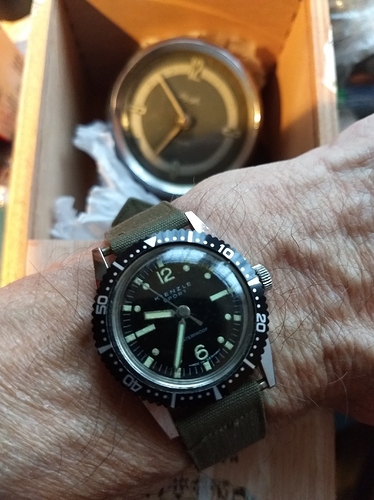 Op de Rikketik vorig jaar een mooi bijpassende NOS bezel gevonden en even op een Guss WWll bandje gehangen.